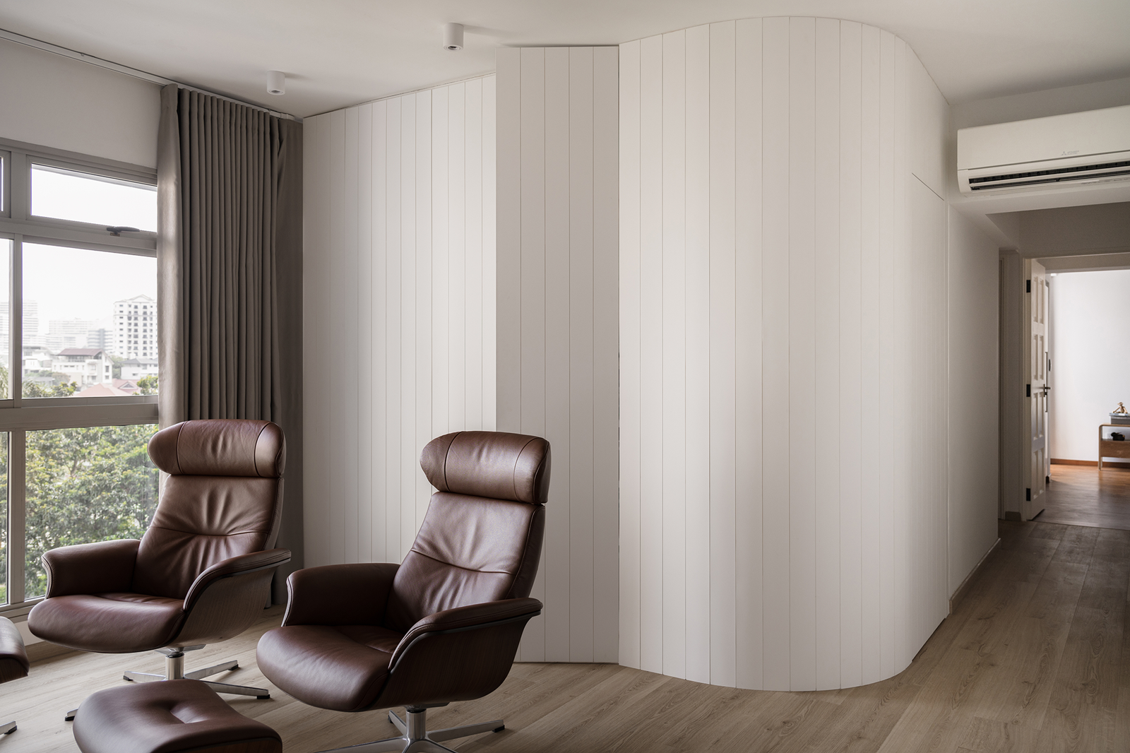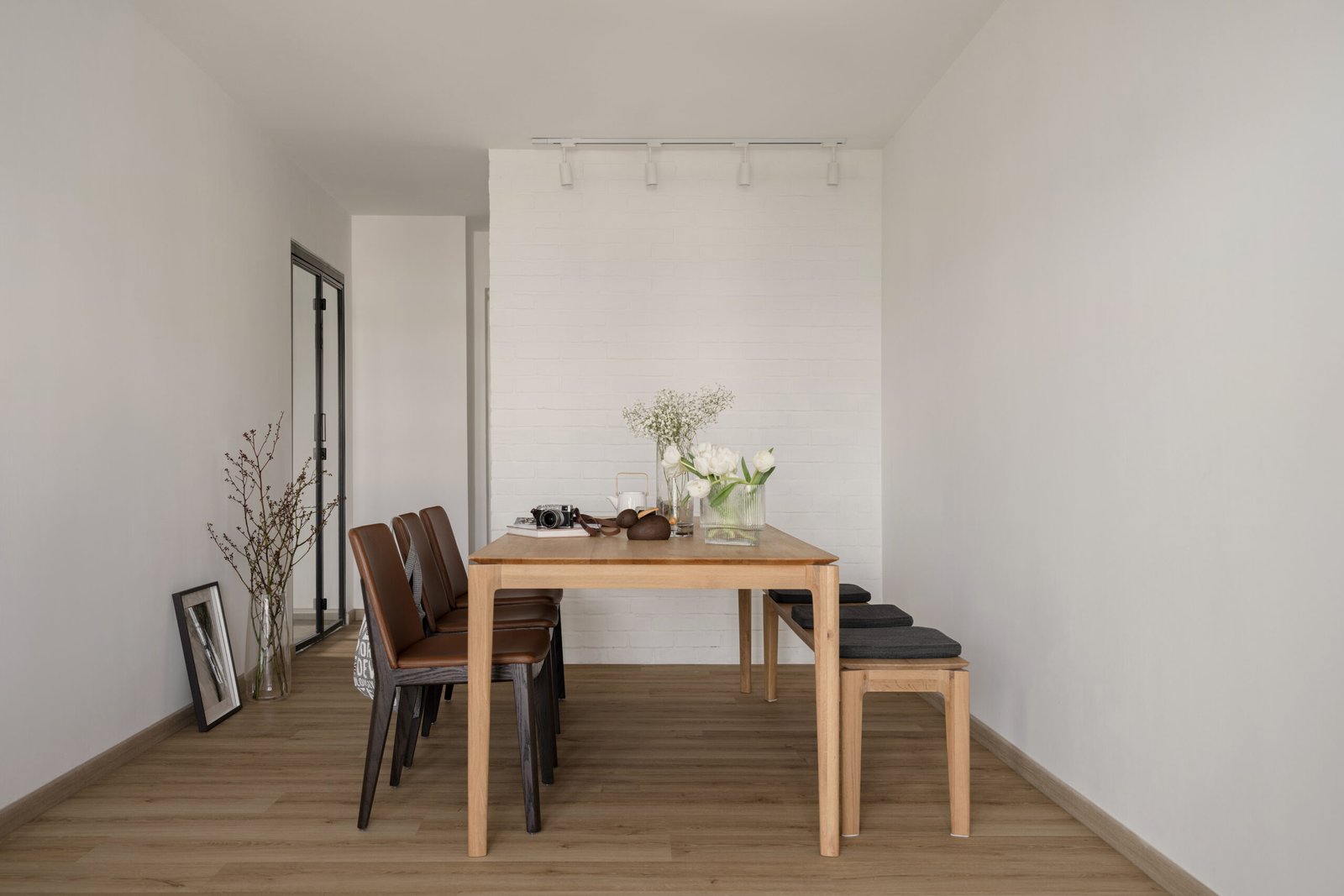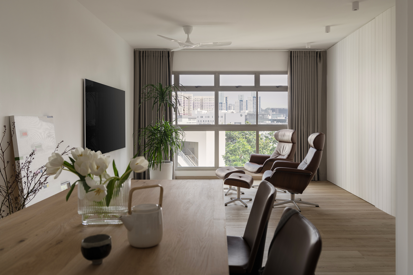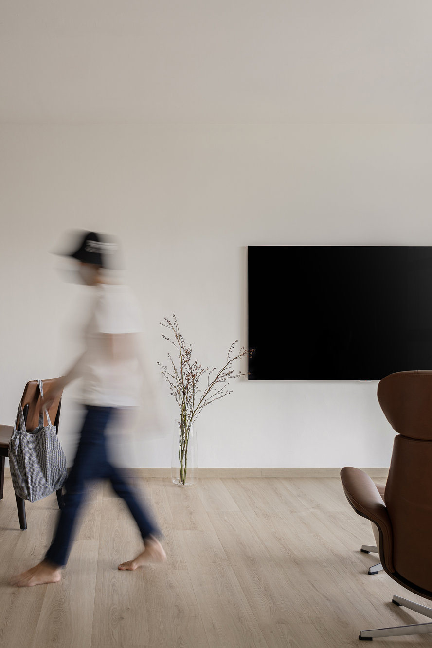 Between the entrance and the dining area, a white brick wall introduces additional texture, breaking up the all-white scheme while maintaining a cohesive, understated look. The living area features an unique approach to seating, rather than a traditional sofa, two lounge chairs are positioned in front of the TV, creating a more open and flexible layout. Concealed storage is integrated seamlessly behind the living area, with shiplap detailing adding subtle texture and visual interest.
