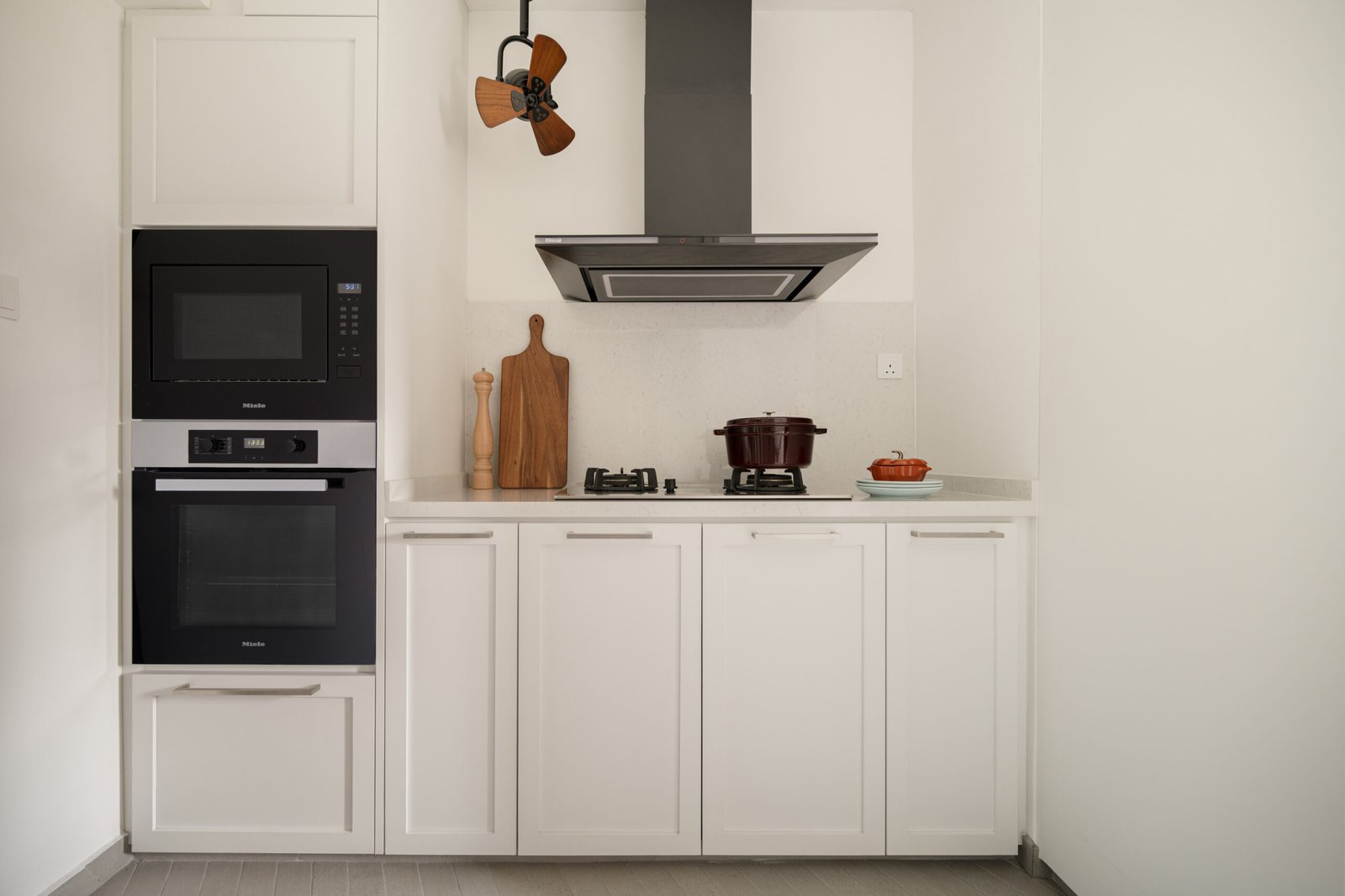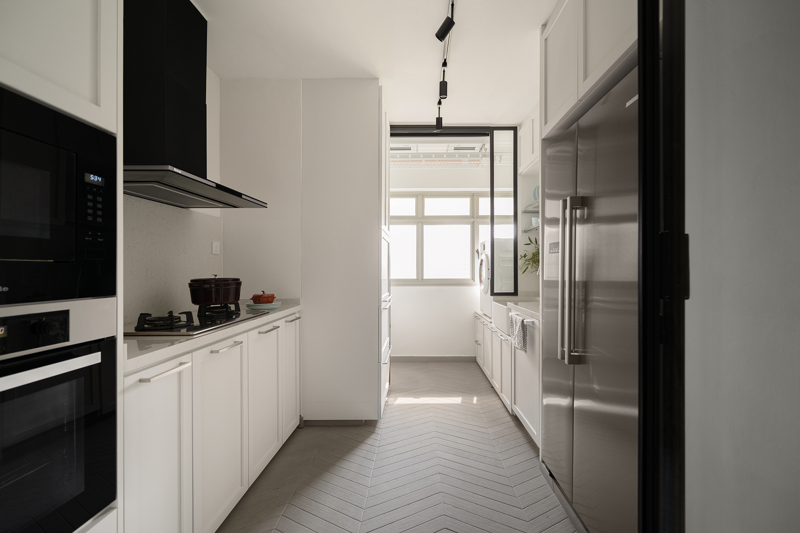 The kitchen continues the clean, minimalist theme with white cabinetry in classic shaker door design. A herringbone wood-look floor adds warmth and pattern, while black appliances punctuate the space, providing contrast without compromising the overall simplicity.
