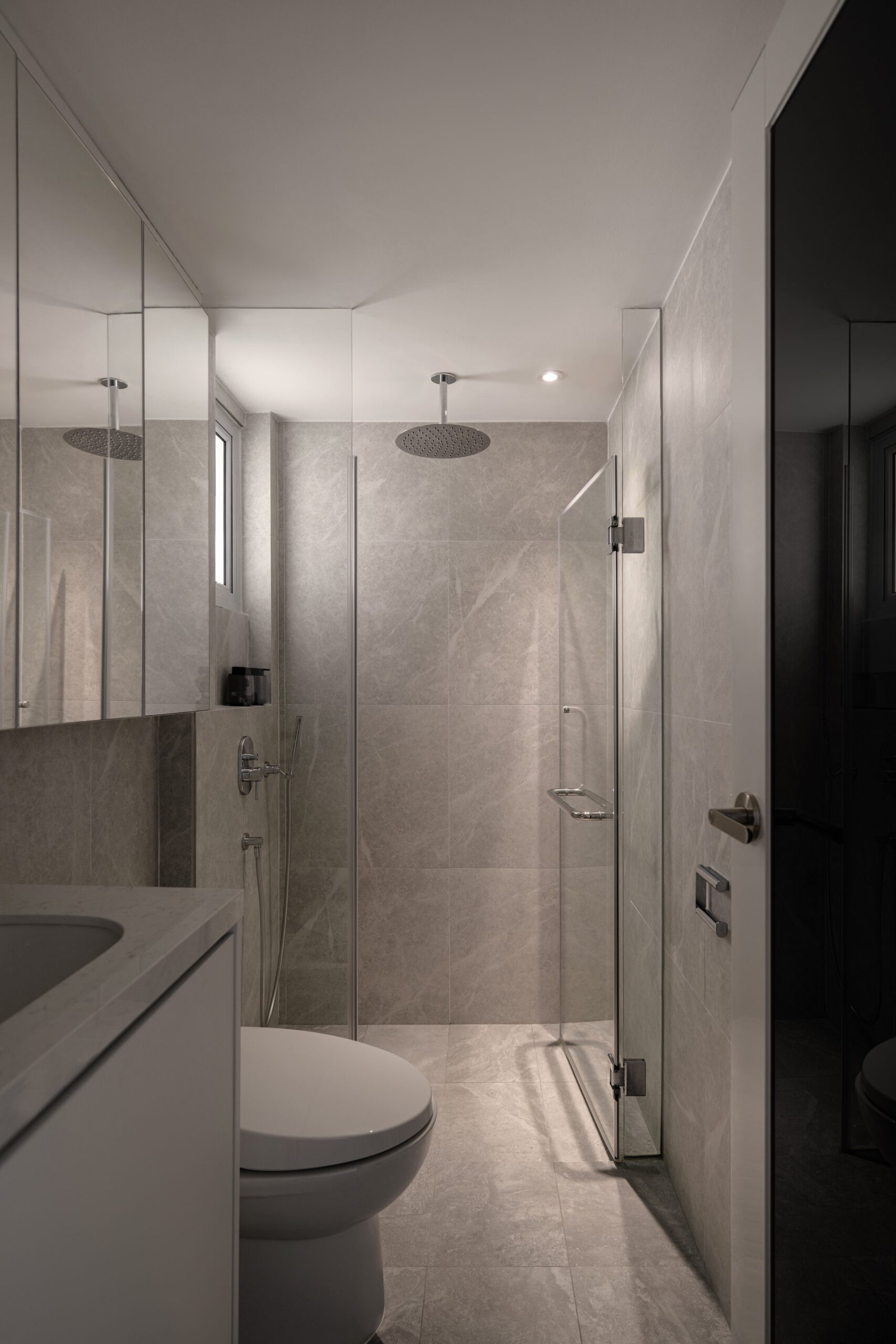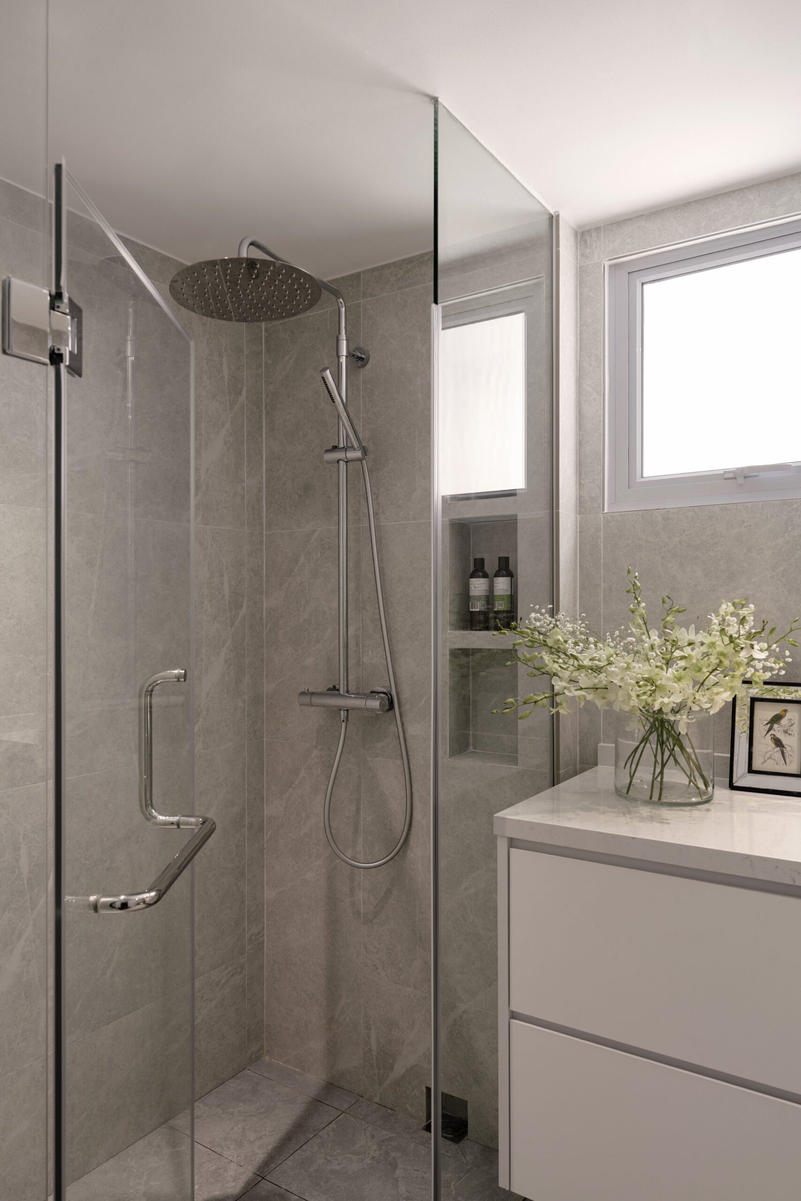 Bathrooms were designed to feel luxurious and timeless, with grey marble-look surfaces paired with white cabinetry. The restrained material palette and careful detailing create a sense of calm and refinement throughout the home, reflecting a design that is both functional and elegant.