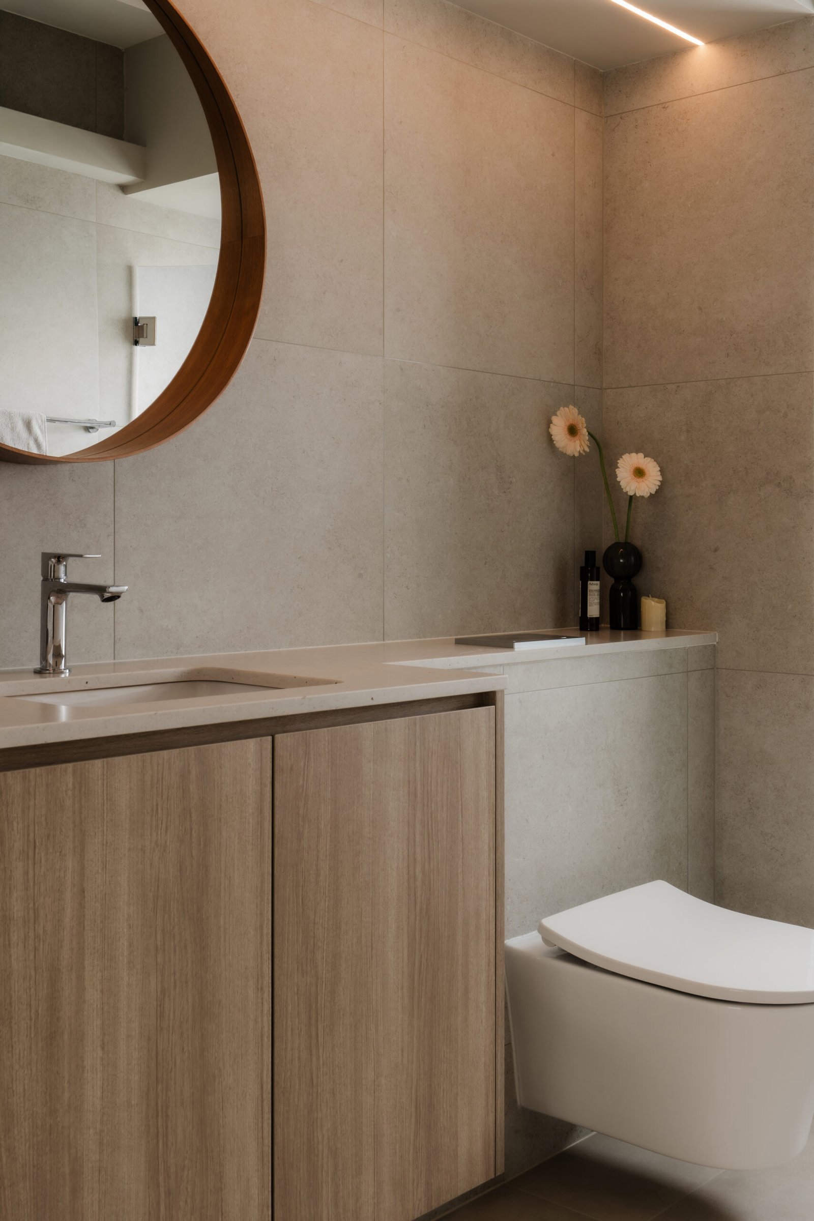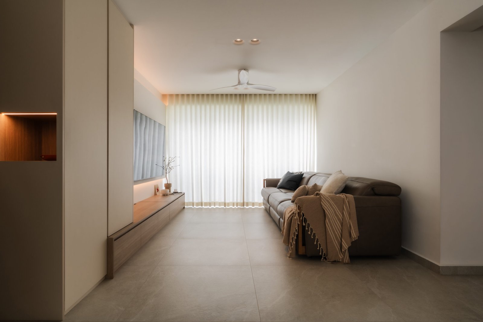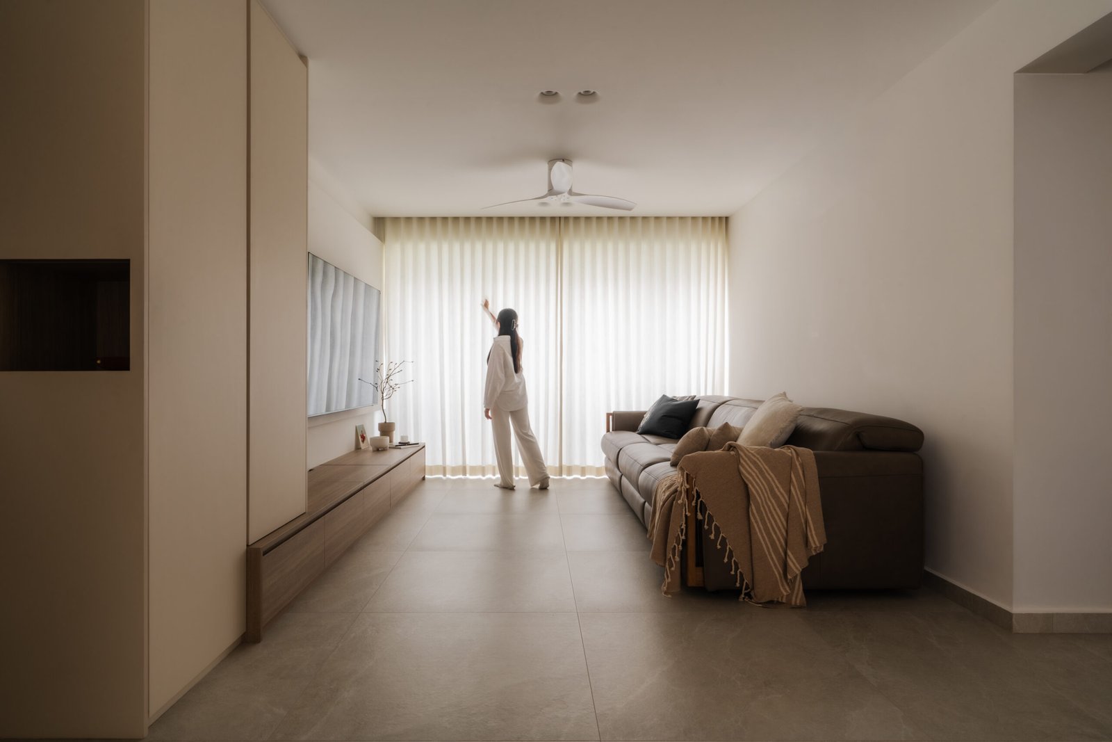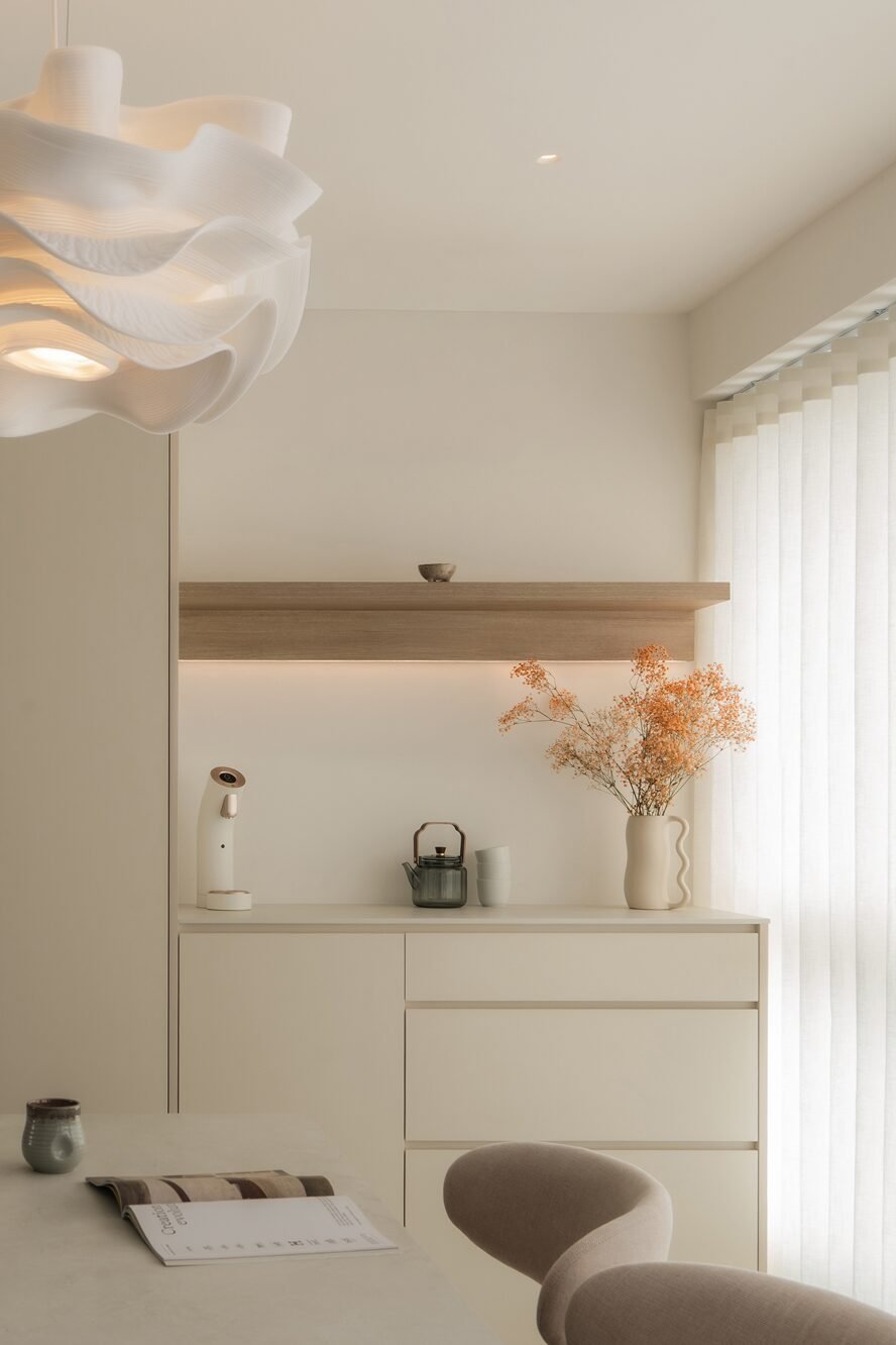 The living room, where the family naturally gathers, was kept cosy and uncluttered. The TV console extends seamlessly into a tall cabinet, tucking away their belongings without adding visual weight. Microcement laminates paired with wood textures create the quiet, grounded atmosphere that defines Japandi interiors.