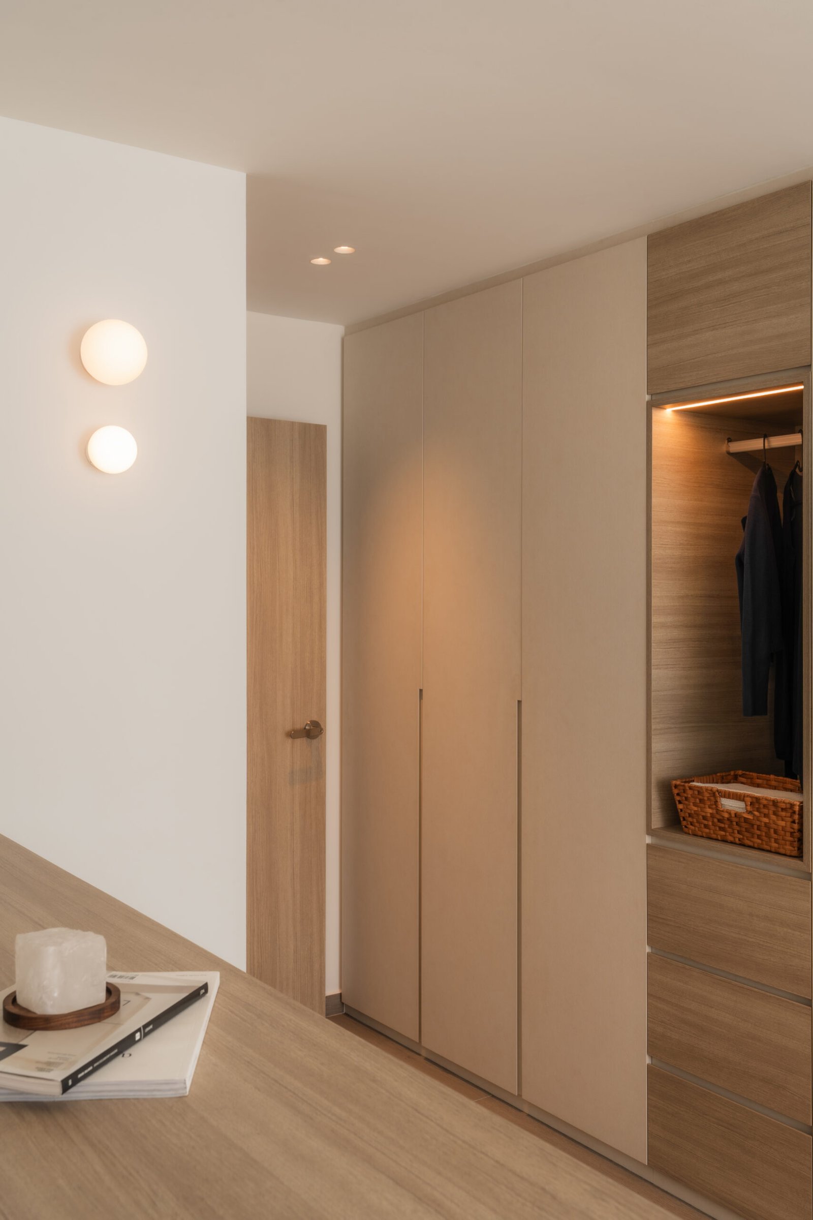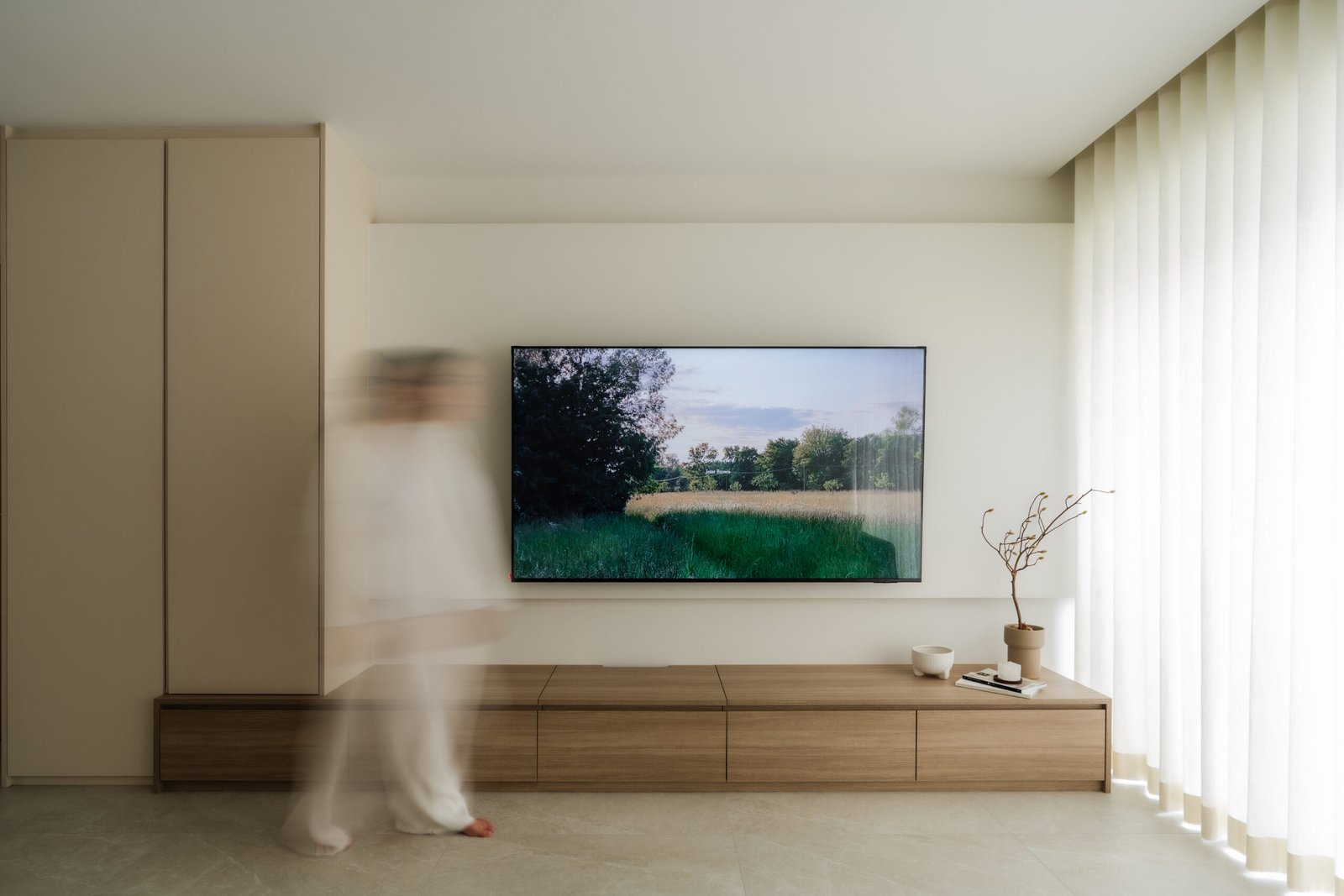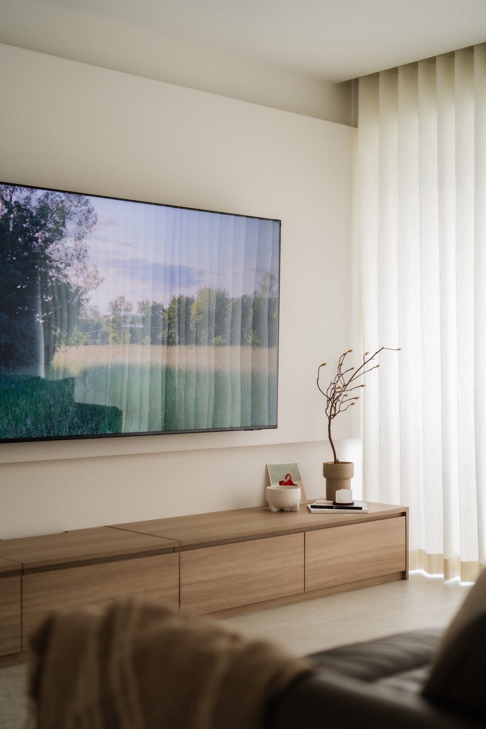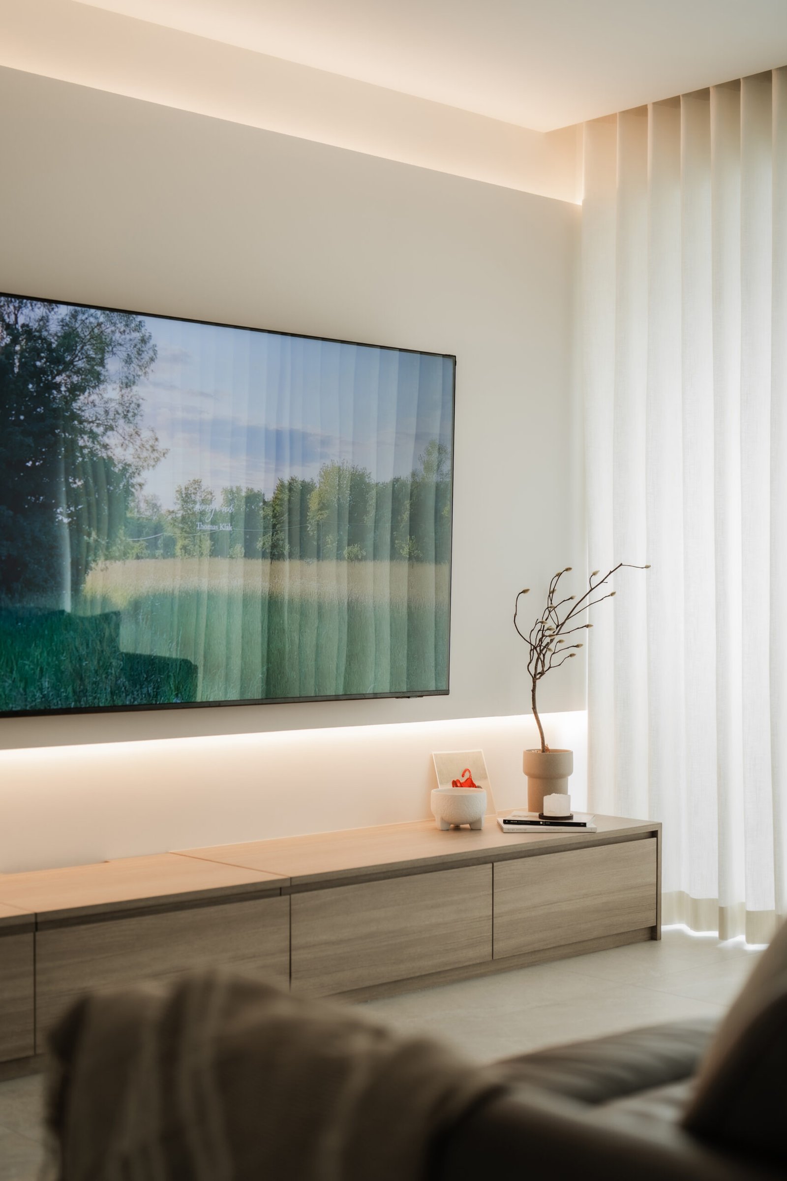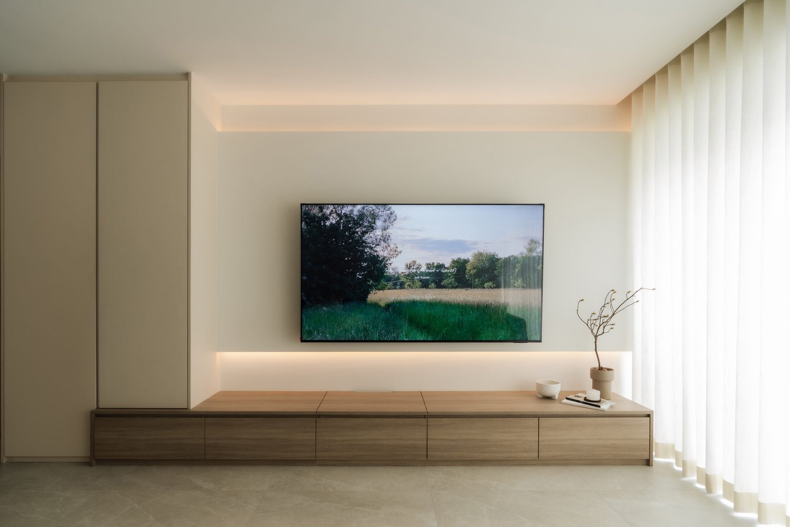 The living room, where the family naturally gathers, was kept cosy and uncluttered. The TV console extends seamlessly into a tall cabinet, tucking away their belongings without adding visual weight. Microcement laminates paired with wood textures create the quiet, grounded atmosphere that defines Japandi interiors.