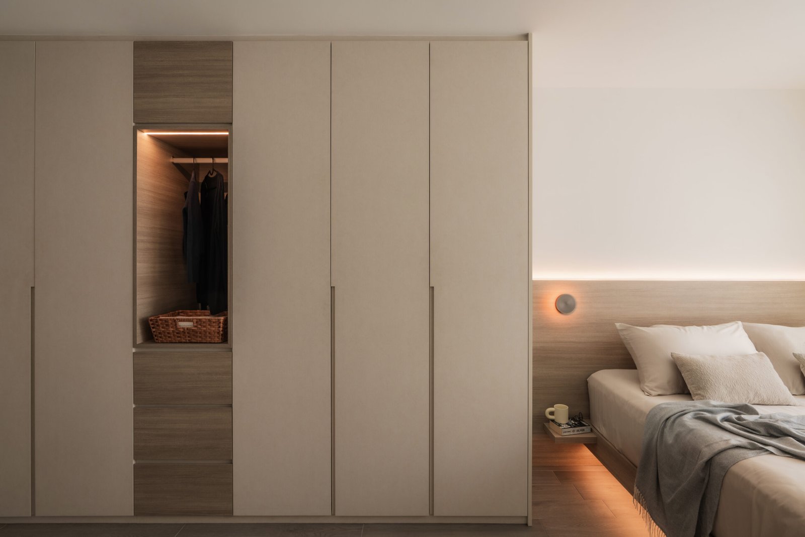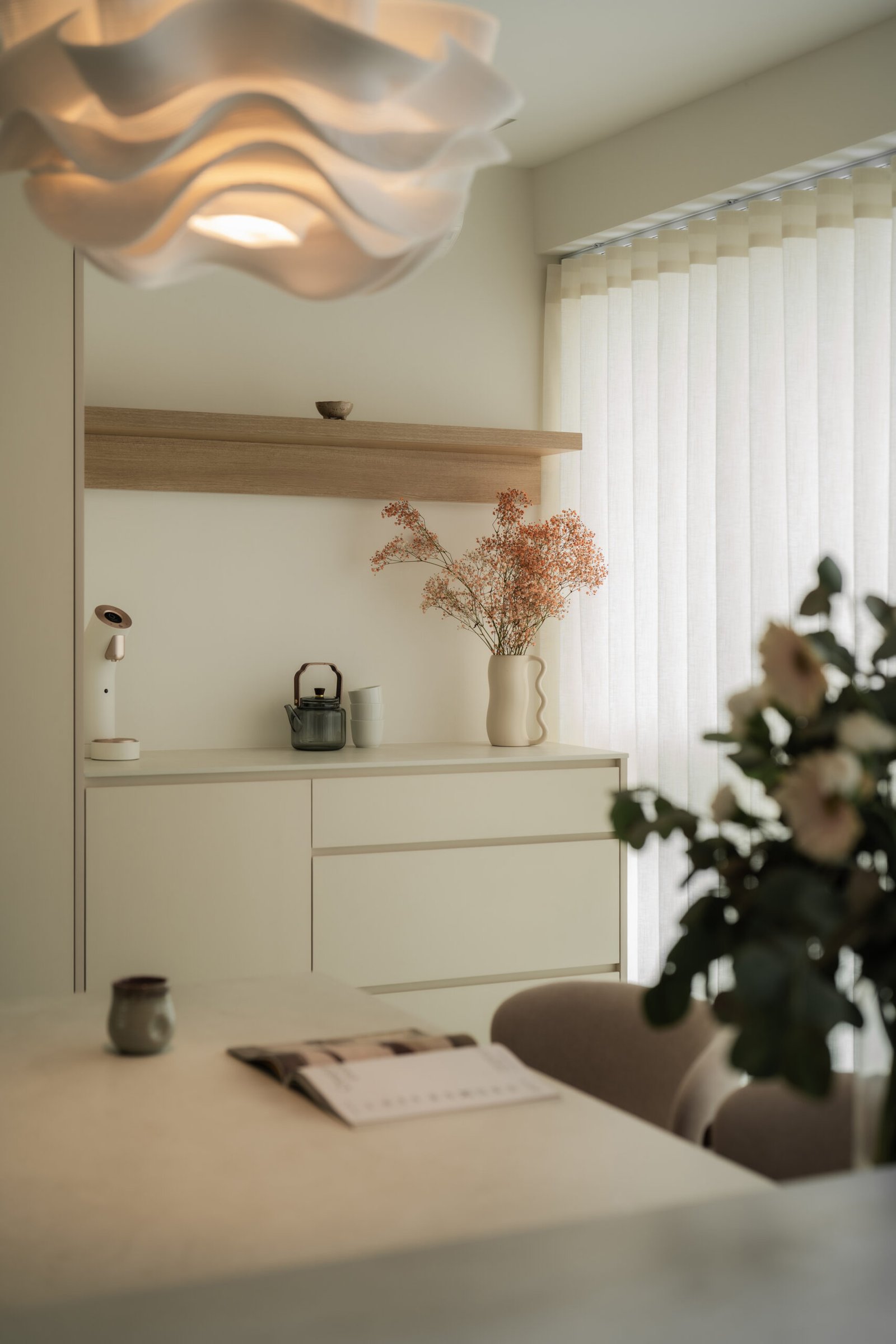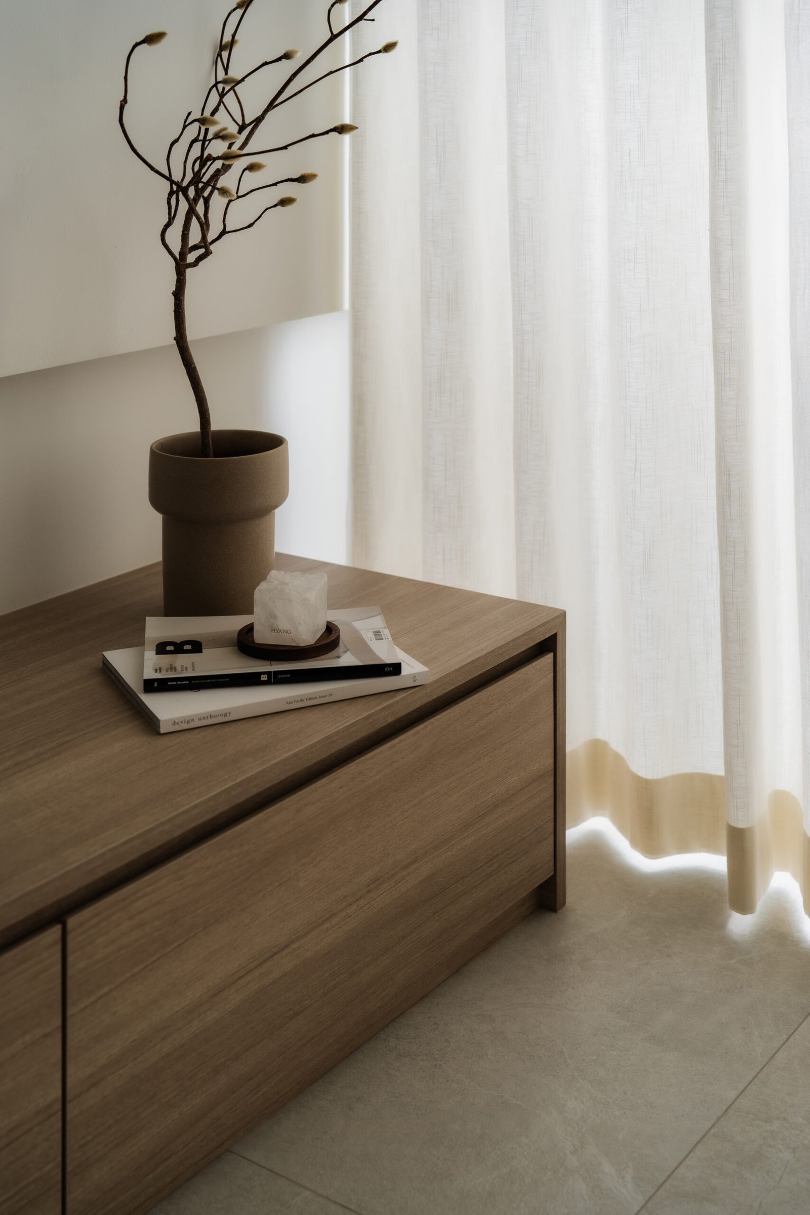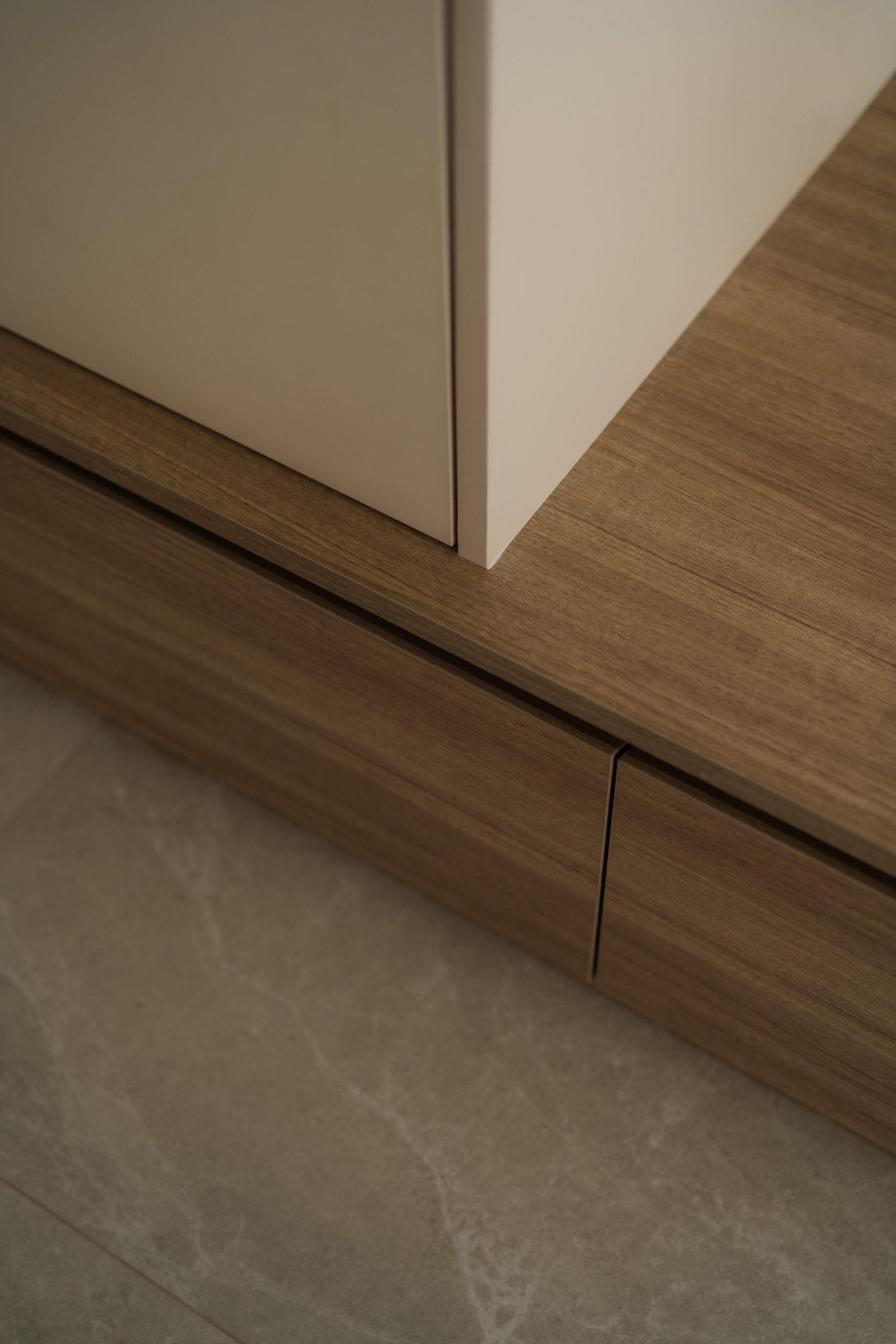 The living room, where the family naturally gathers, was kept cosy and uncluttered. The TV console extends seamlessly into a tall cabinet, tucking away their belongings without adding visual weight. Microcement laminates paired with wood textures create the quiet, grounded atmosphere that defines Japandi interiors.