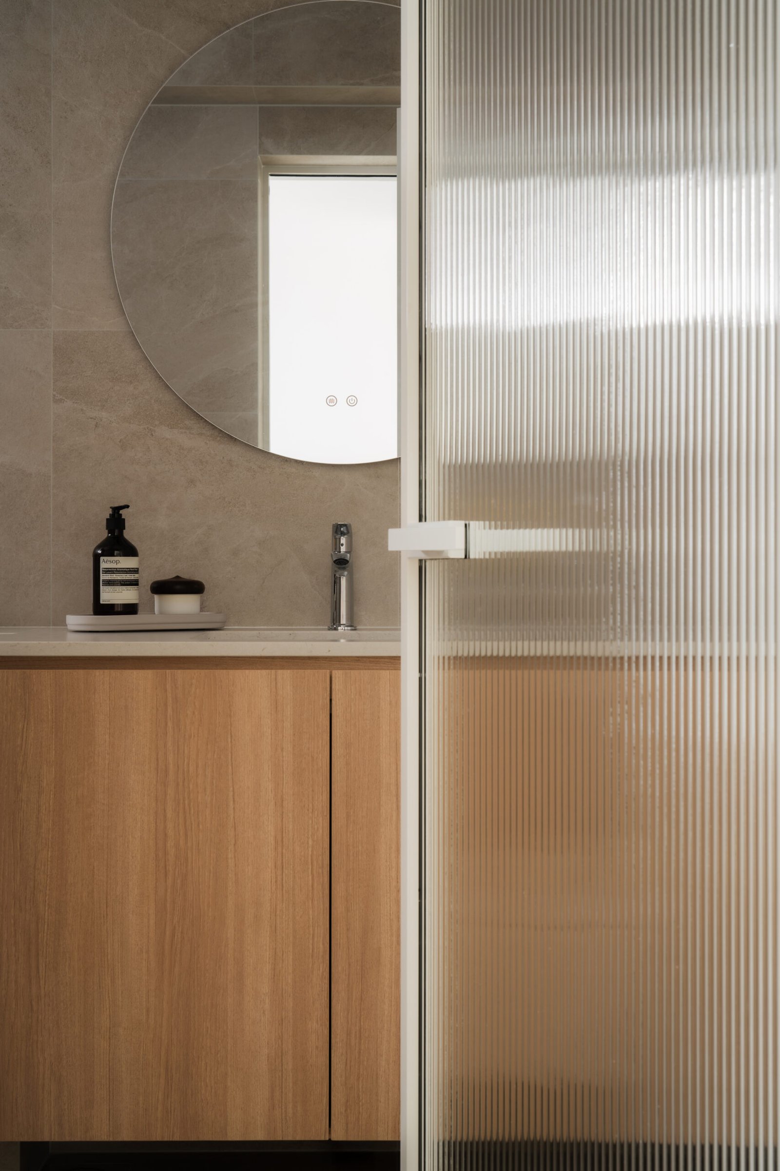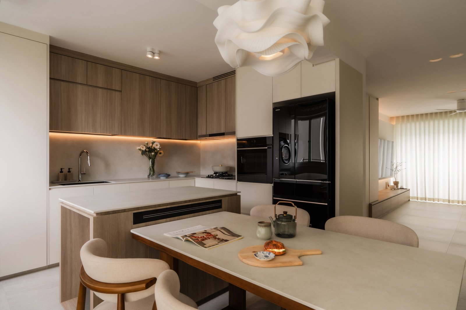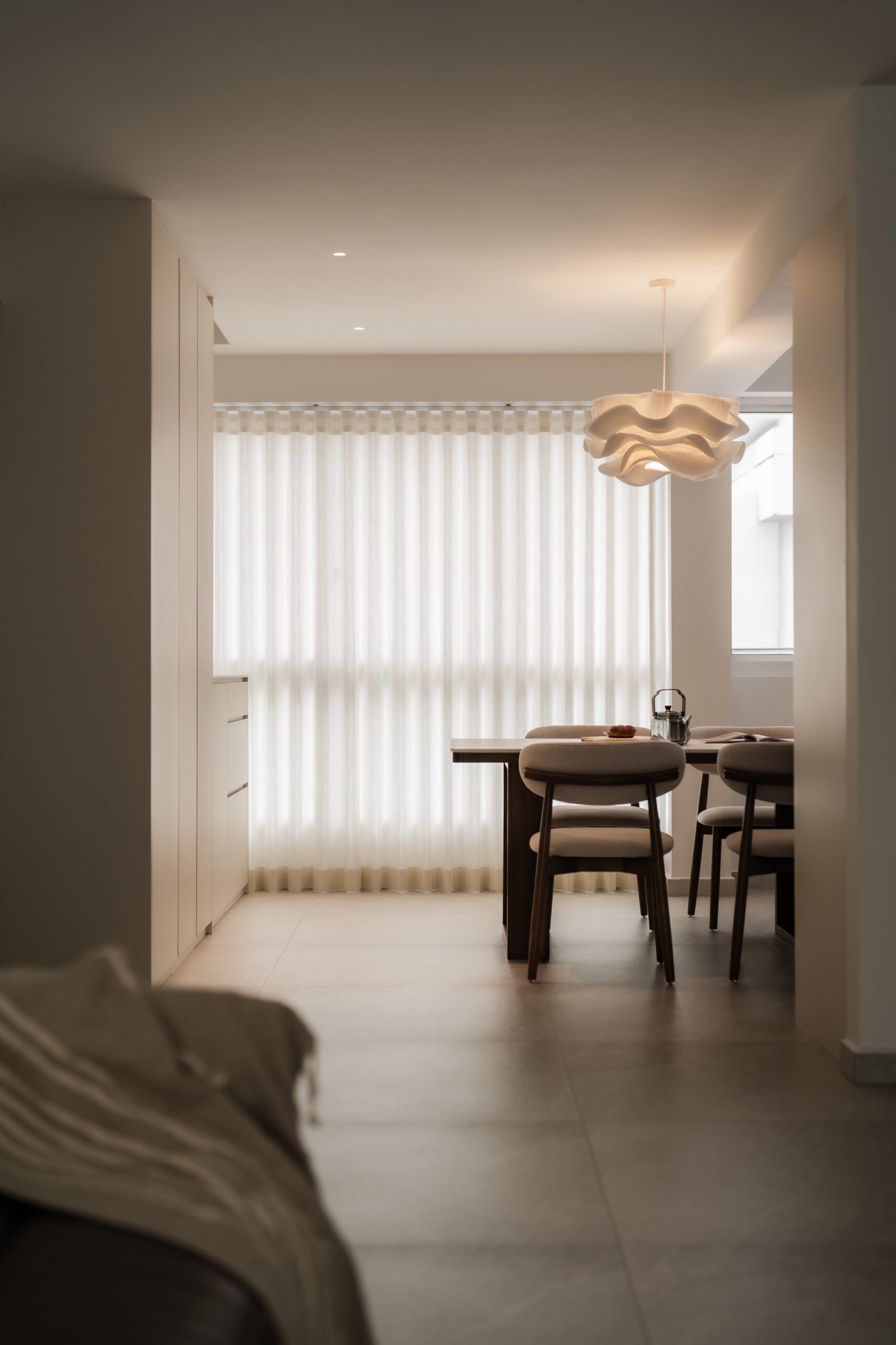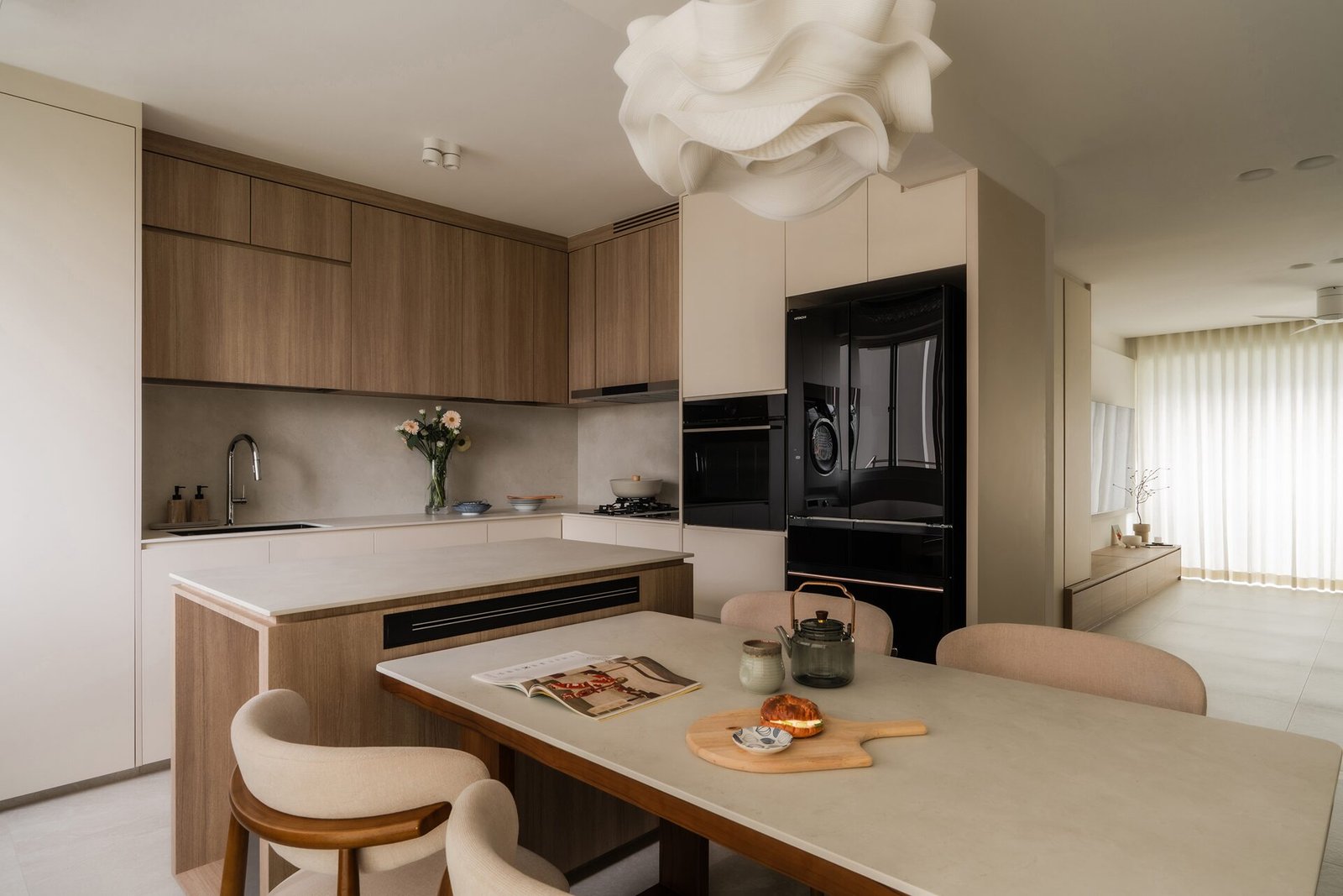 The living room, where the family naturally gathers, was kept cosy and uncluttered. The TV console extends seamlessly into a tall cabinet, tucking away their belongings without adding visual weight. Microcement laminates paired with wood textures create the quiet, grounded atmosphere that defines Japandi interiors.