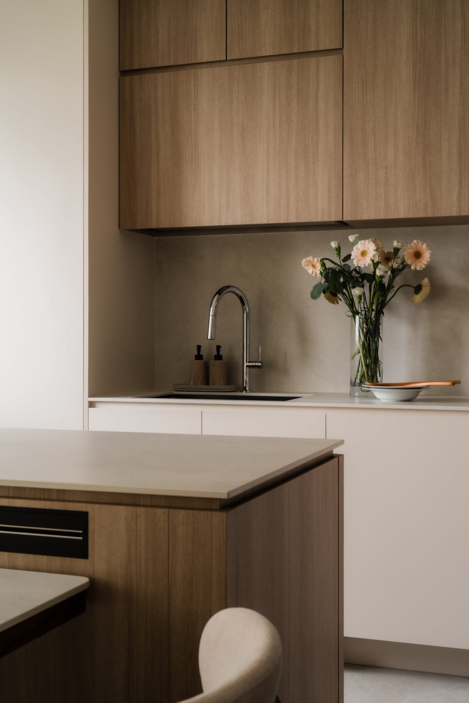 The family wanted a warm and natural palette with earthy tones, textured looking materials and practical storage that blends into the environment. With the children becoming more independent and the parents often working from home, the home was thoughtfully reconfigured to support both shared time and personal space.