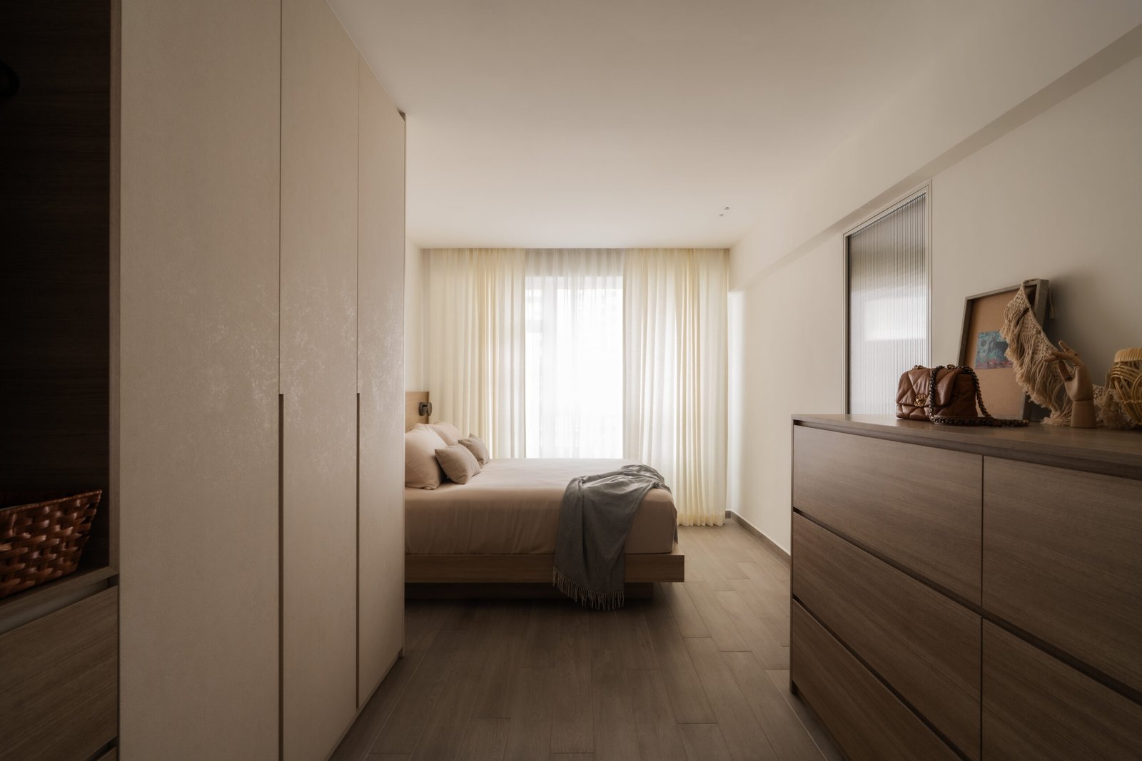 The master bedroom underwent the most transformative changes. Relocating the entrance created additional wardrobe space, giving the couple more room to organise their daily life with ease. The bathroom door was also repositioned so the wet area now sits closer to the window, bringing in natural light and improving ventilation throughout the day. With the bed now closer to the window, mornings are greeted with soft daylight, replacing the previous placement that faced the bathroom door.