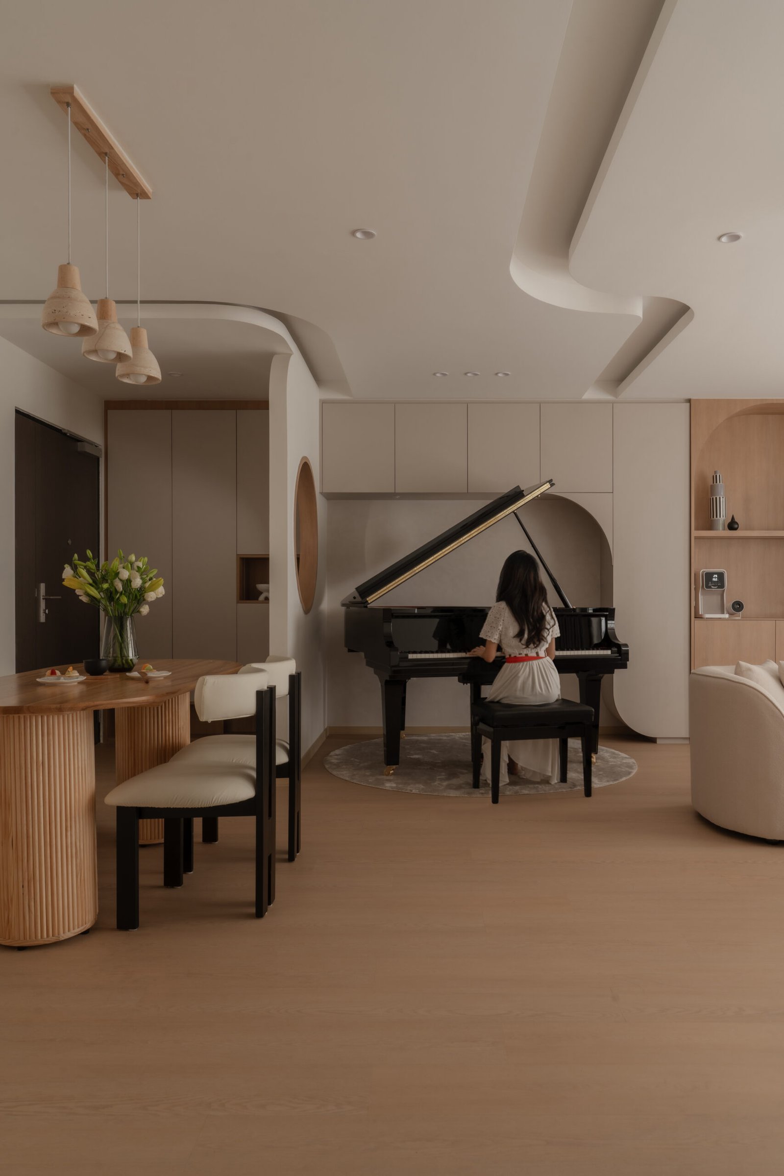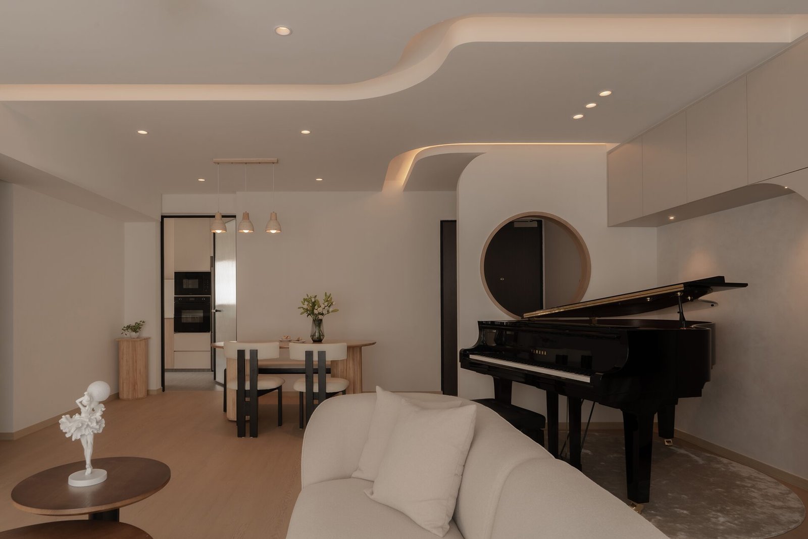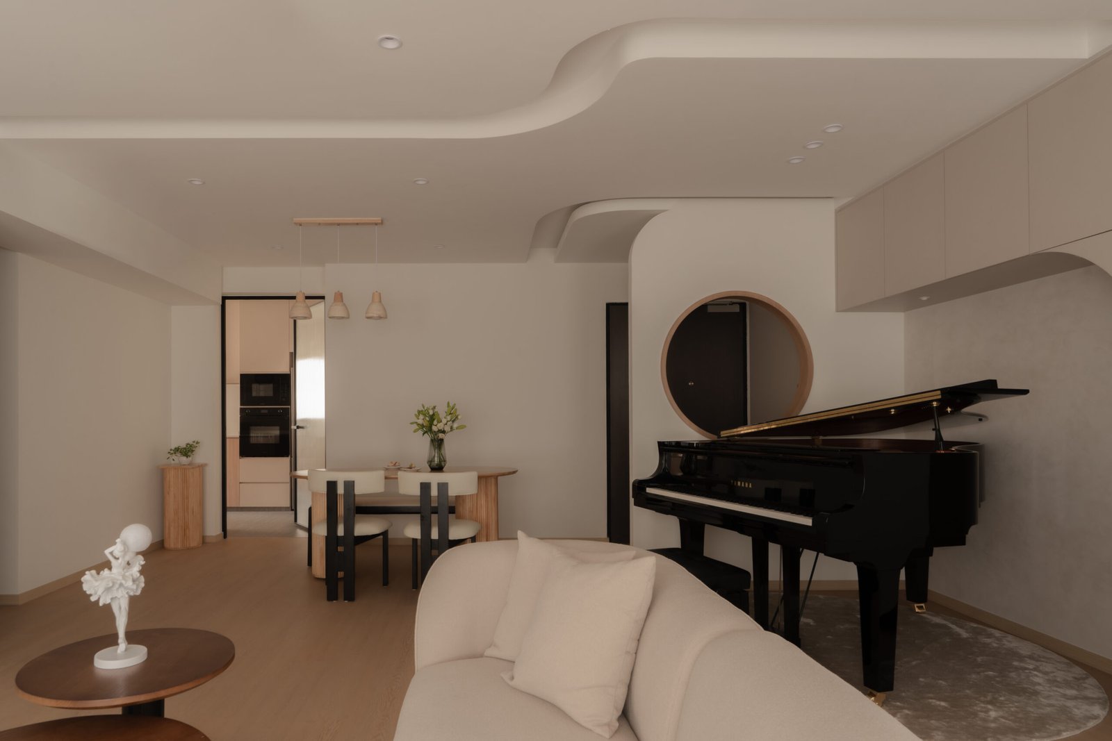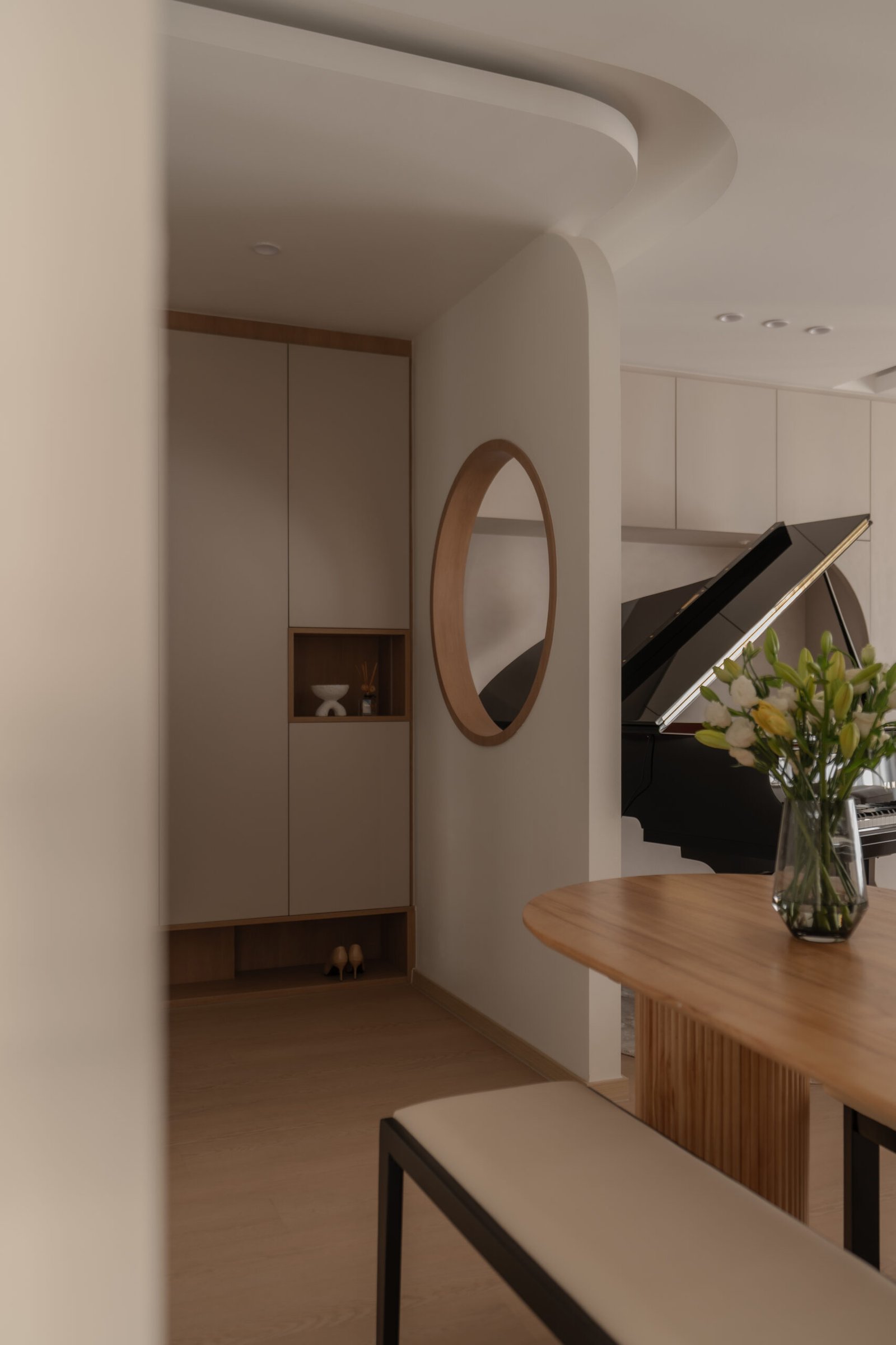 With a Scandinavian modern direction in mind, the couple envisioned a space that felt warm, intimate and practical for work, music and family life. Flexibility was essential because the home shifts between roles throughout the day. Smart lighting supports that rhythm, creating soft transitions between teaching sessions, playtime and quiet evenings. Originally completely open, the layout gave little sense of separation. Adding a wall defined the foyer while a circular opening allowed a soft, inviting view of the piano as one steps inside. Curves became a unifying language throughout the home. They continue from the foyer into the ceiling, subtly marking the transitions between dining, living and teaching zones. Viewed from different angles, these curves create a quiet visual movement that echoes the flow of music. Beyond aesthetics, the softened edges naturally make the home feel safer and more comforting for a young child. In the living and dining area, the family chose a projector instead of a TV to keep the space uncluttered and serene. Storage extends seamlessly from the piano to the window, with a dedicated recess that allows the piano to sit against the limewash walls. A dry pantry by the window keeps hosting easy. The master bedroom carries the same calm, cosy palette as the rest of the home. A walk-in wardrobe with glass display shelves showcases bags beautifully, while the layout allows one person to get ready without disturbing the other. A dedicated vanity adds convenience, and the round fluted wood bedhead, soft cove lighting, and limewash walls complete the serene, restful environment. From the piano that greets you at the entrance to the soft arcs that carry the eye across the ceiling, this home unfolds like a carefully composed piece of music.