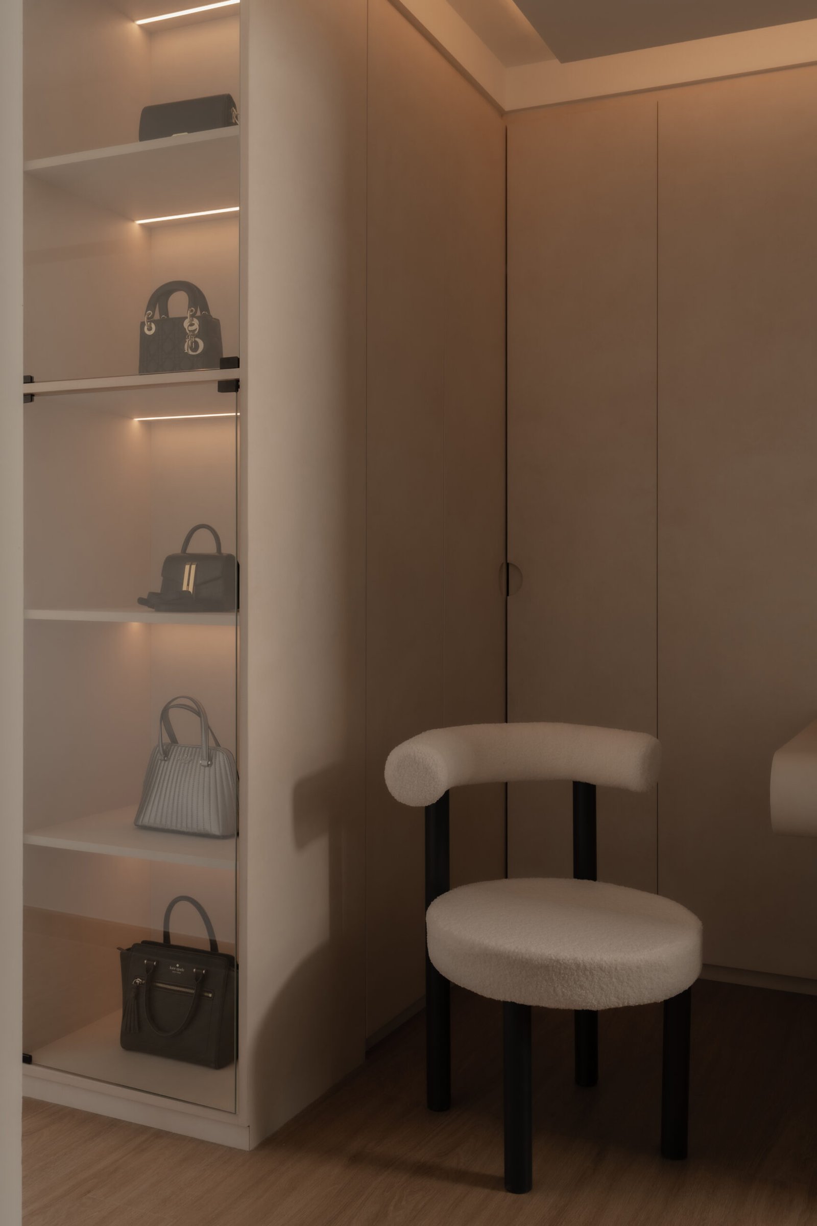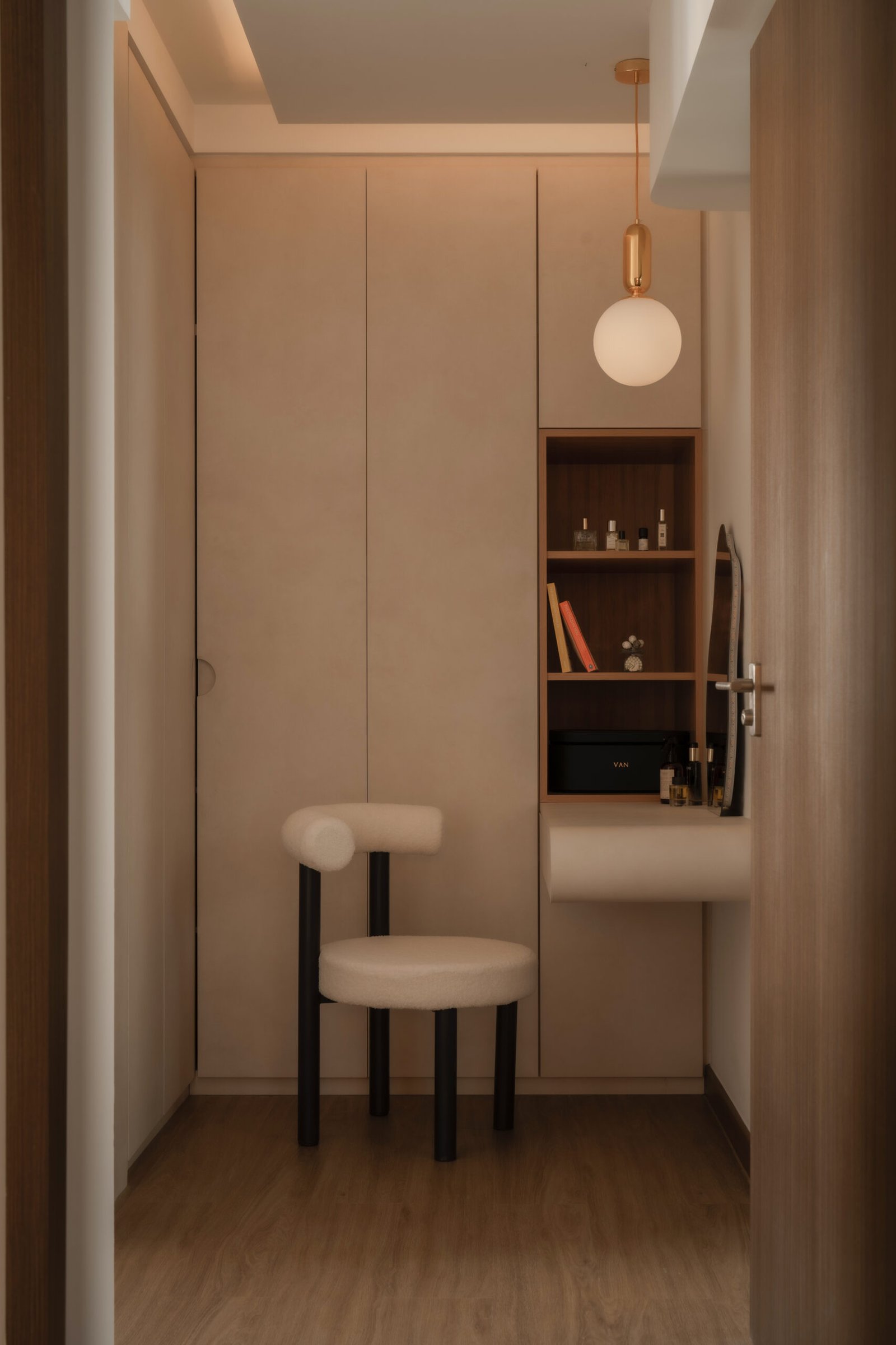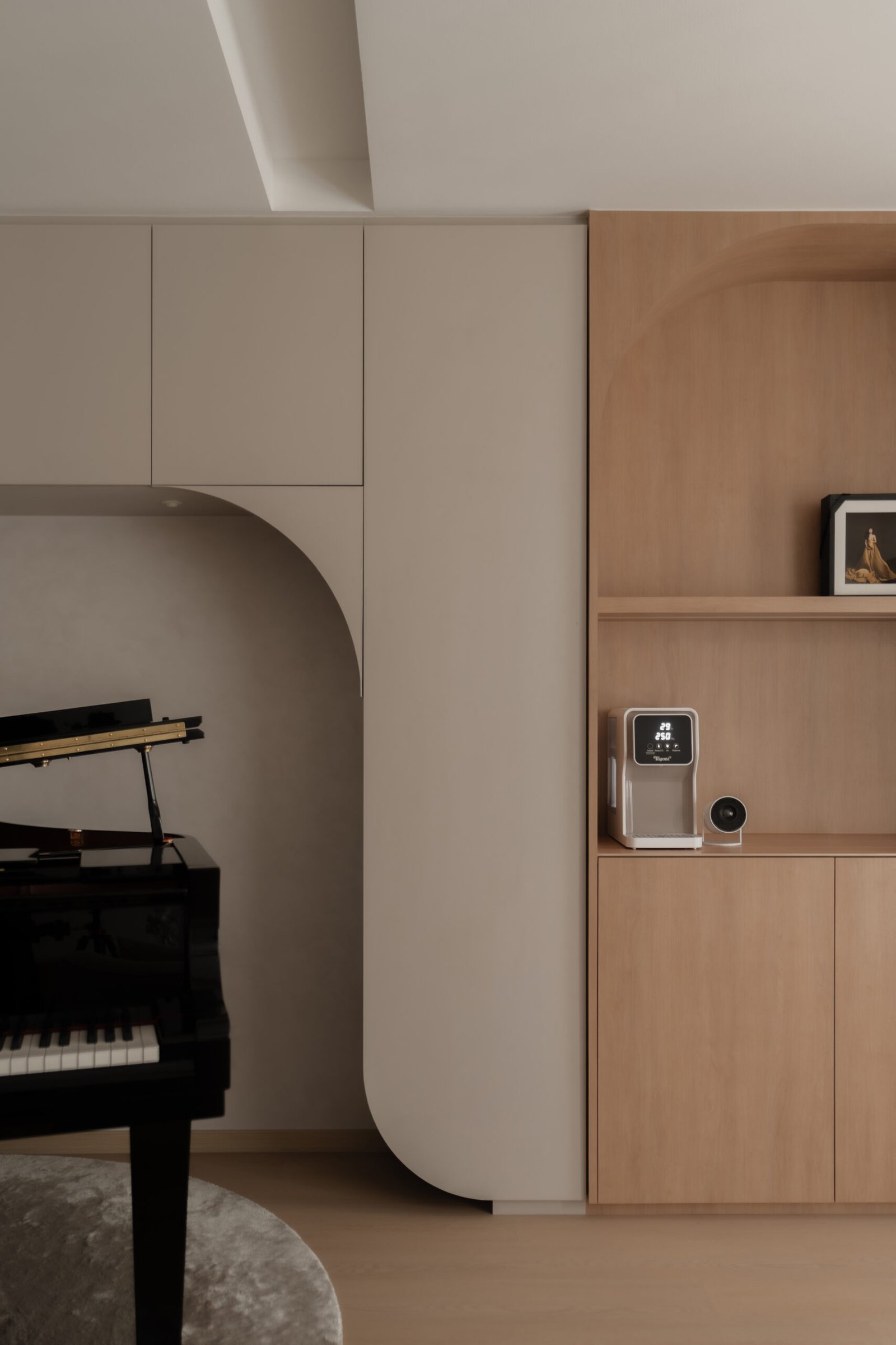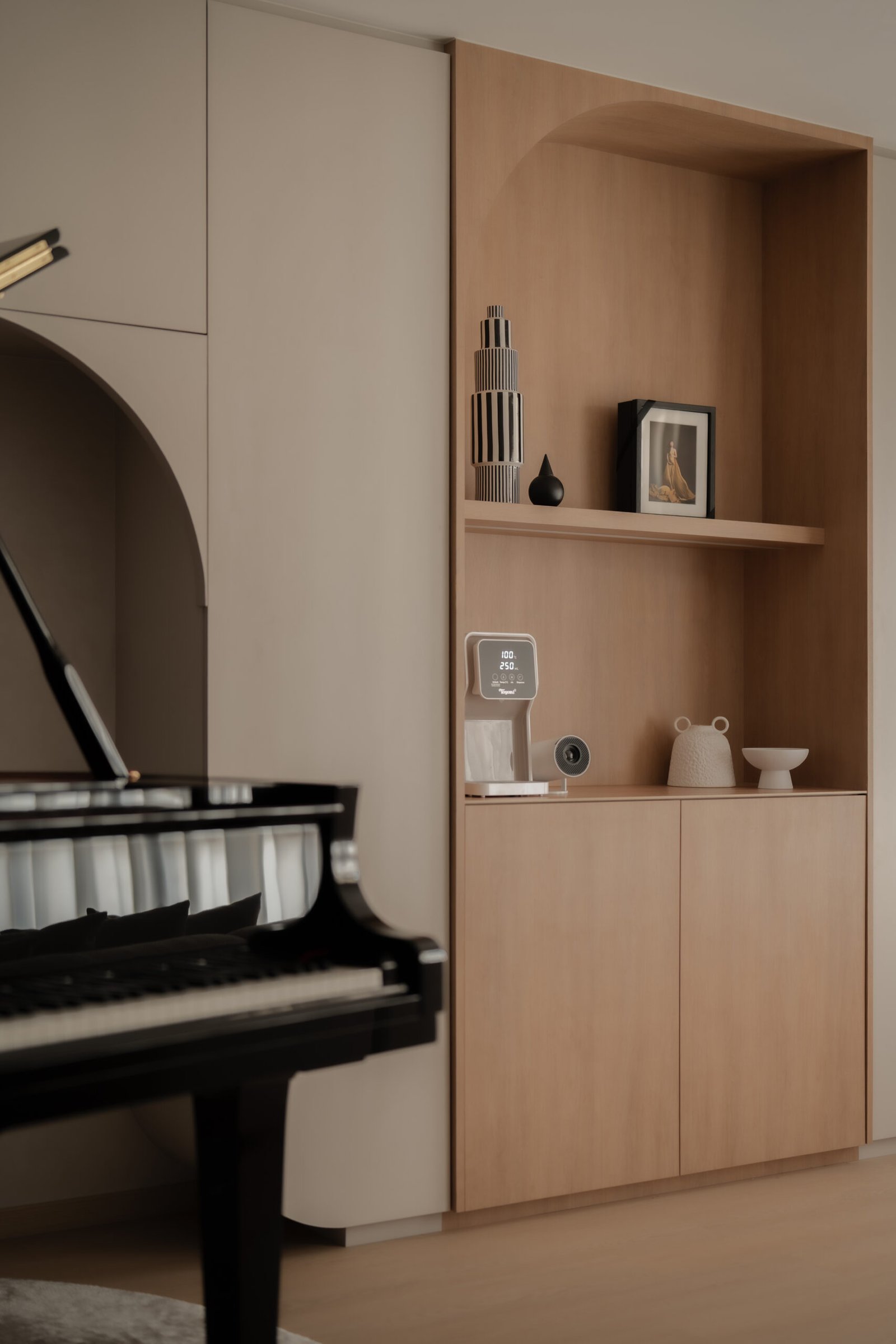 With a Scandinavian modern direction in mind, the couple envisioned a space that felt warm, intimate and practical for work, music and family life. Flexibility was essential because the home shifts between roles throughout the day. Smart lighting supports that rhythm, creating soft transitions between teaching sessions, playtime and quiet evenings. Originally completely open, the layout gave little sense of separation. Adding a wall defined the foyer while a circular opening allowed a soft, inviting view of the piano as one steps inside. Curves became a unifying language throughout the home. They continue from the foyer into the ceiling, subtly marking the transitions between dining, living and teaching zones. Viewed from different angles, these curves create a quiet visual movement that echoes the flow of music. Beyond aesthetics, the softened edges naturally make the home feel safer and more comforting for a young child. In the living and dining area, the family chose a projector instead of a TV to keep the space uncluttered and serene. Storage extends seamlessly from the piano to the window, with a dedicated recess that allows the piano to sit against the limewash walls. A dry pantry by the window keeps hosting easy. The master bedroom carries the same calm, cosy palette as the rest of the home. A walk-in wardrobe with glass display shelves showcases bags beautifully, while the layout allows one person to get ready without disturbing the other. A dedicated vanity adds convenience, and the round fluted wood bedhead, soft cove lighting, and limewash walls complete the serene, restful environment. From the piano that greets you at the entrance to the soft arcs that carry the eye across the ceiling, this home unfolds like a carefully composed piece of music.