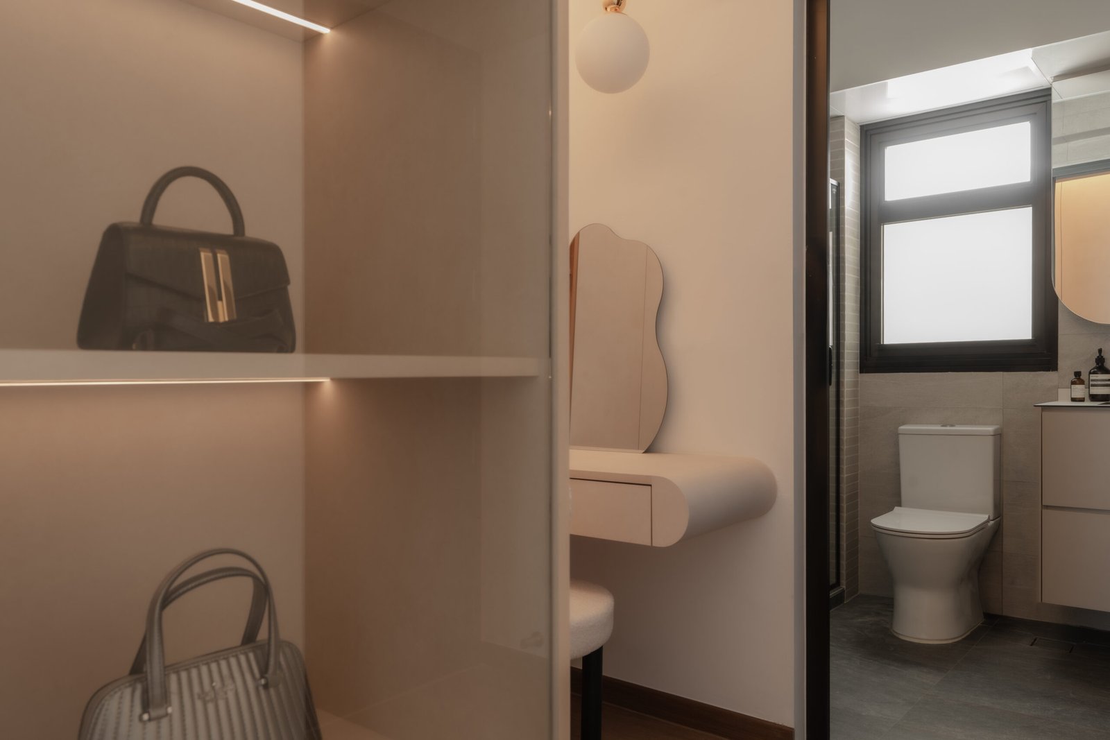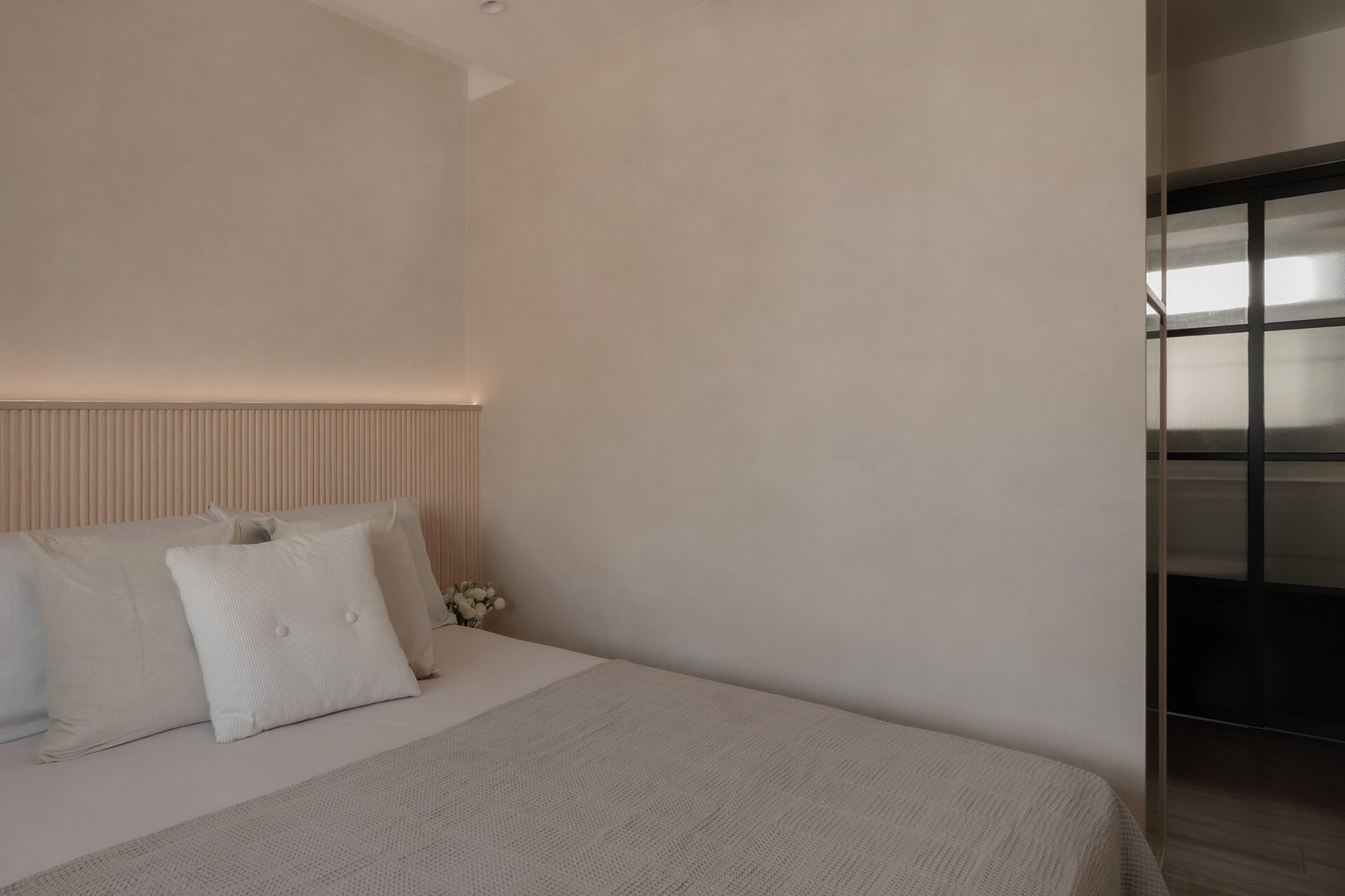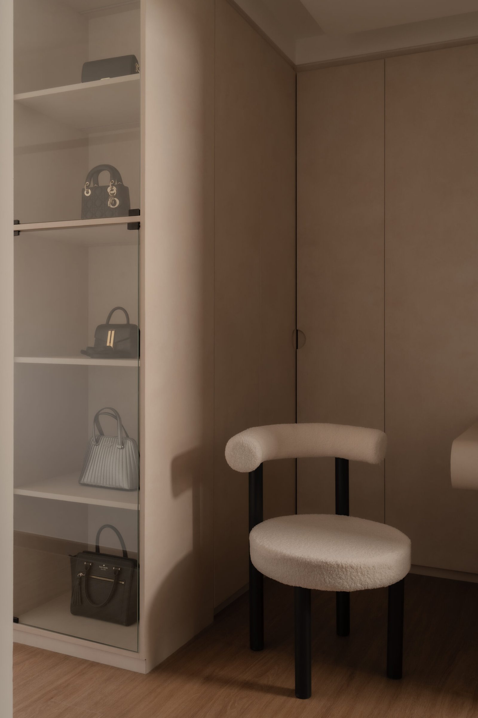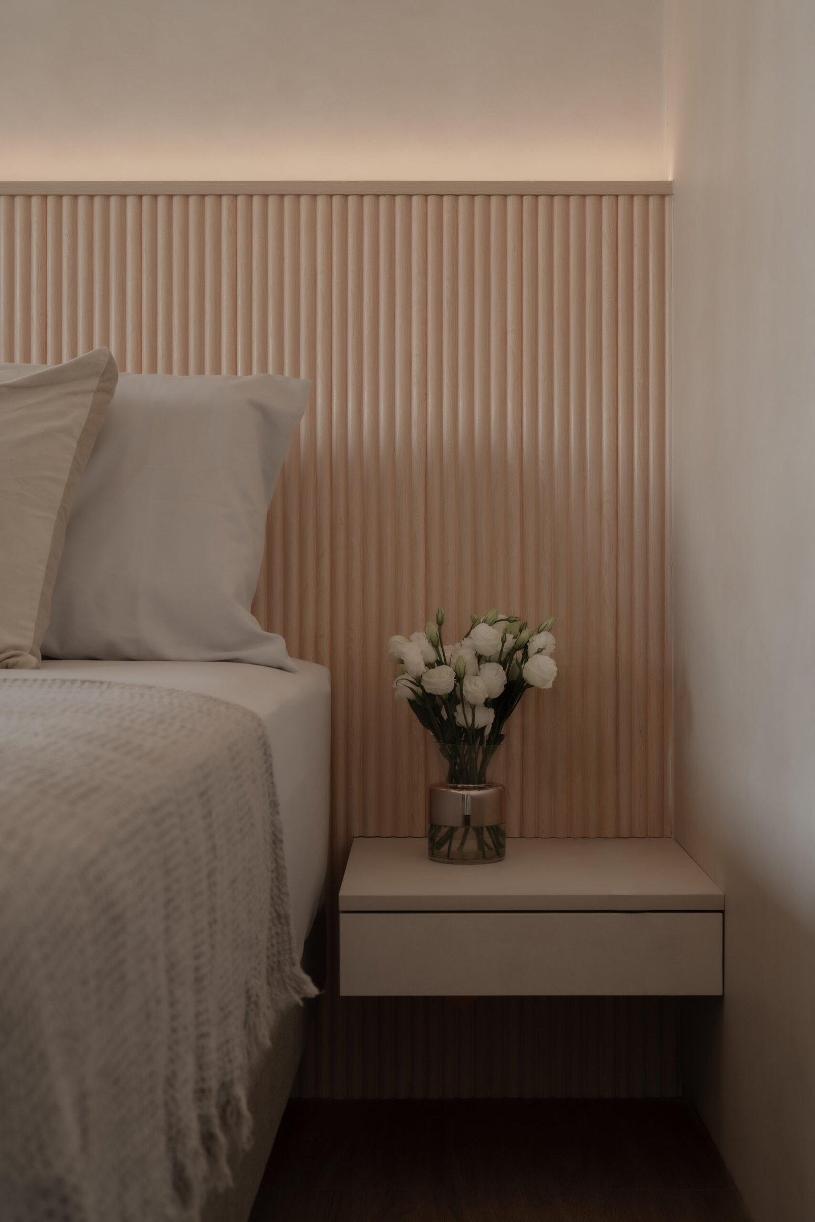 With a Scandinavian modern direction in mind, the couple envisioned a space that felt warm, intimate and practical for work, music and family life. Flexibility was essential because the home shifts between roles throughout the day. Smart lighting supports that rhythm, creating soft transitions between teaching sessions, playtime and quiet evenings. Originally completely open, the layout gave little sense of separation. Adding a wall defined the foyer while a circular opening allowed a soft, inviting view of the piano as one steps inside. Curves became a unifying language throughout the home. They continue from the foyer into the ceiling, subtly marking the transitions between dining, living and teaching zones. Viewed from different angles, these curves create a quiet visual movement that echoes the flow of music. Beyond aesthetics, the softened edges naturally make the home feel safer and more comforting for a young child. In the living and dining area, the family chose a projector instead of a TV to keep the space uncluttered and serene. Storage extends seamlessly from the piano to the window, with a dedicated recess that allows the piano to sit against the limewash walls. A dry pantry by the window keeps hosting easy. The master bedroom carries the same calm, cosy palette as the rest of the home. A walk-in wardrobe with glass display shelves showcases bags beautifully, while the layout allows one person to get ready without disturbing the other. A dedicated vanity adds convenience, and the round fluted wood bedhead, soft cove lighting, and limewash walls complete the serene, restful environment. From the piano that greets you at the entrance to the soft arcs that carry the eye across the ceiling, this home unfolds like a carefully composed piece of music.
