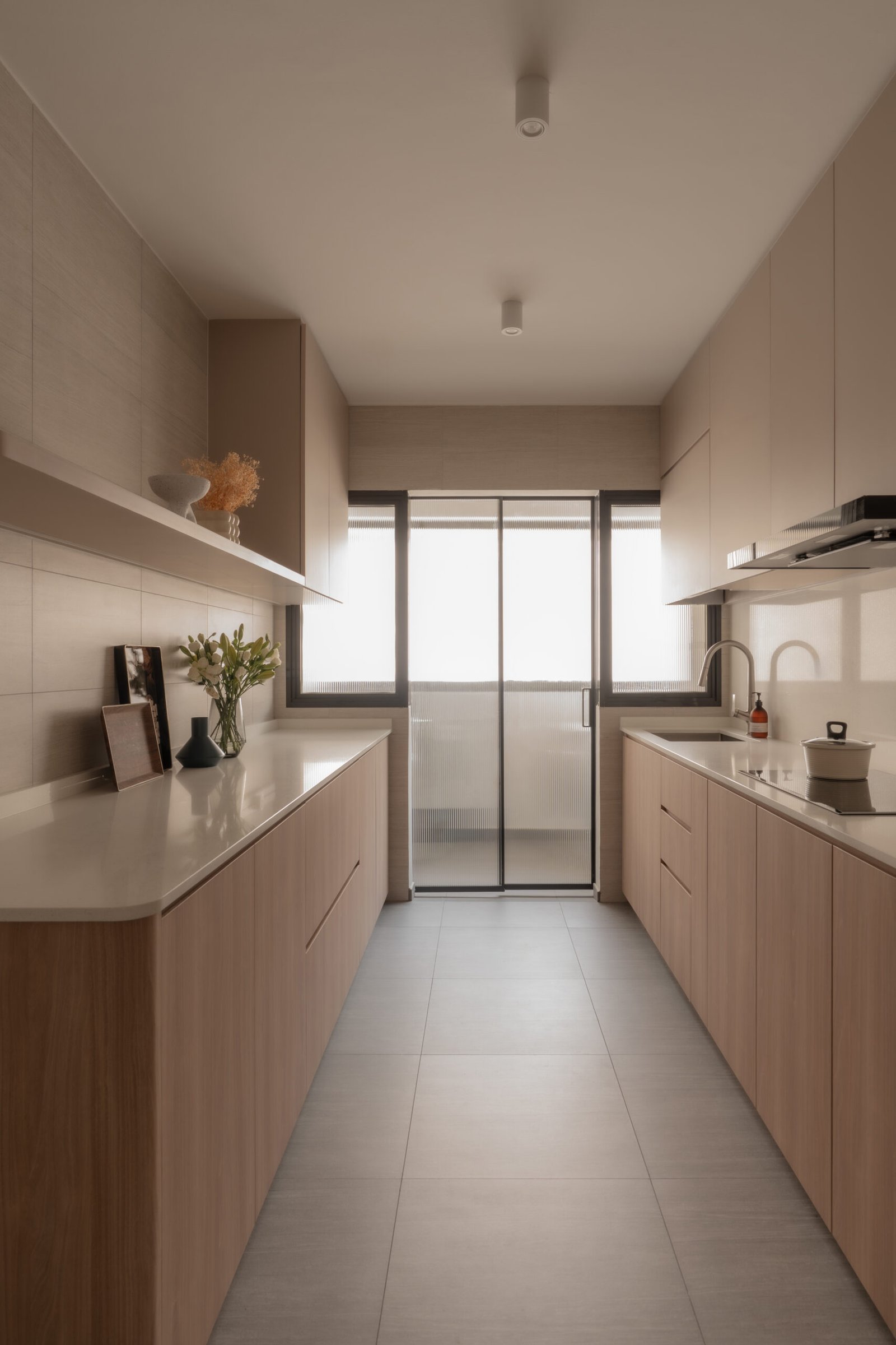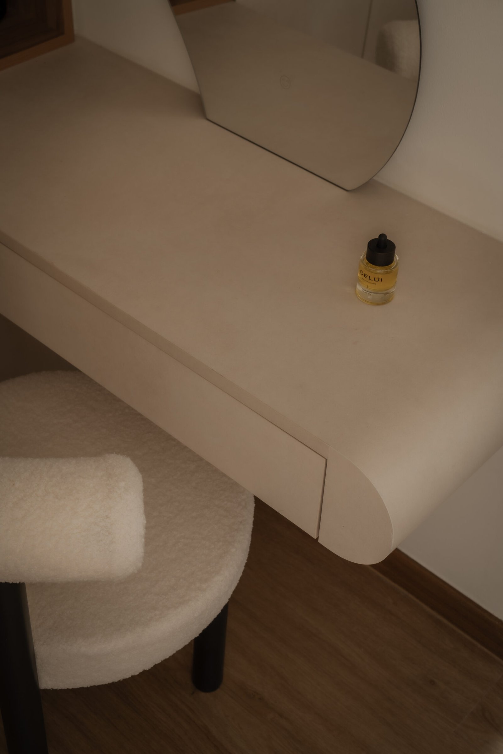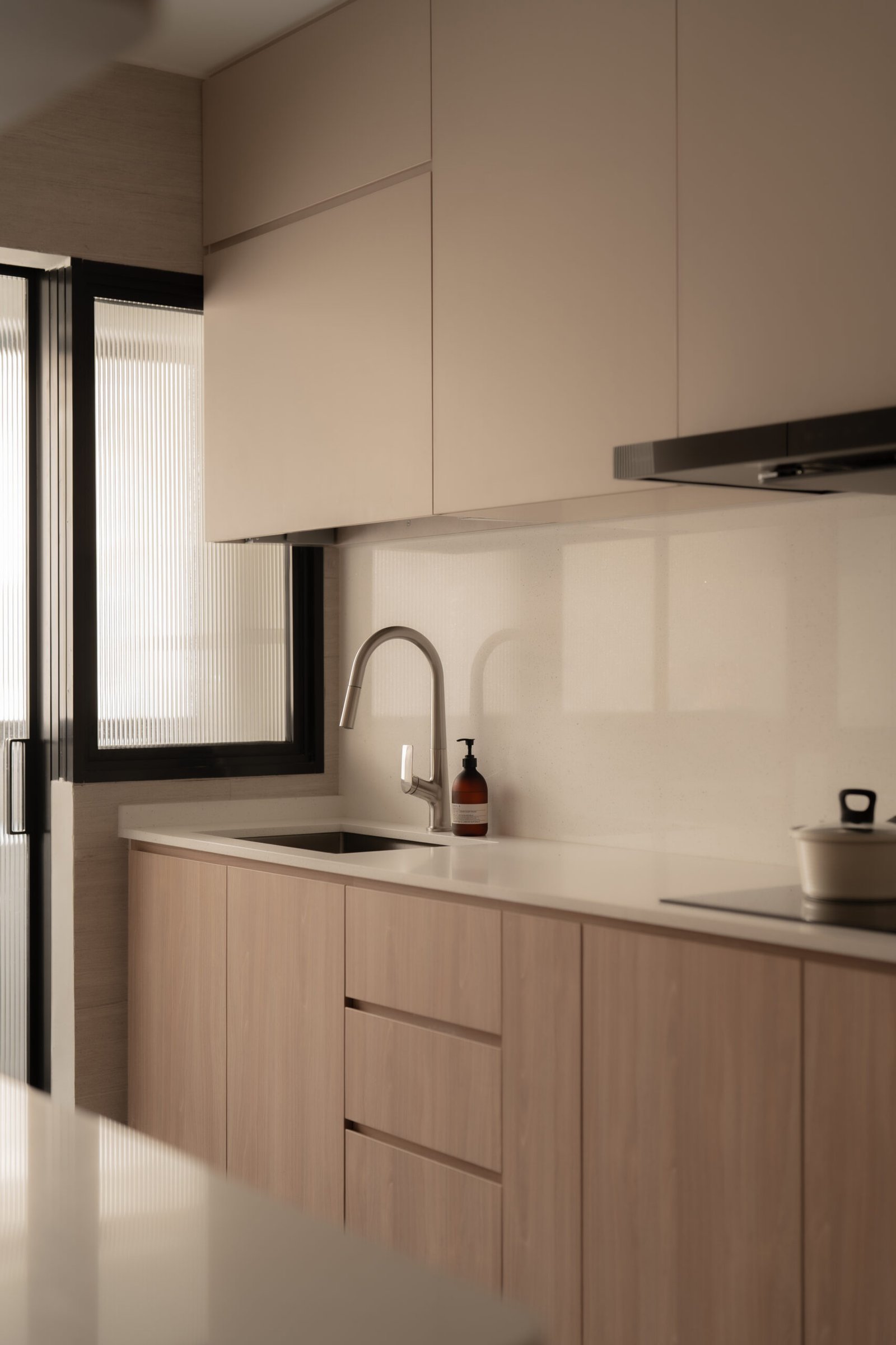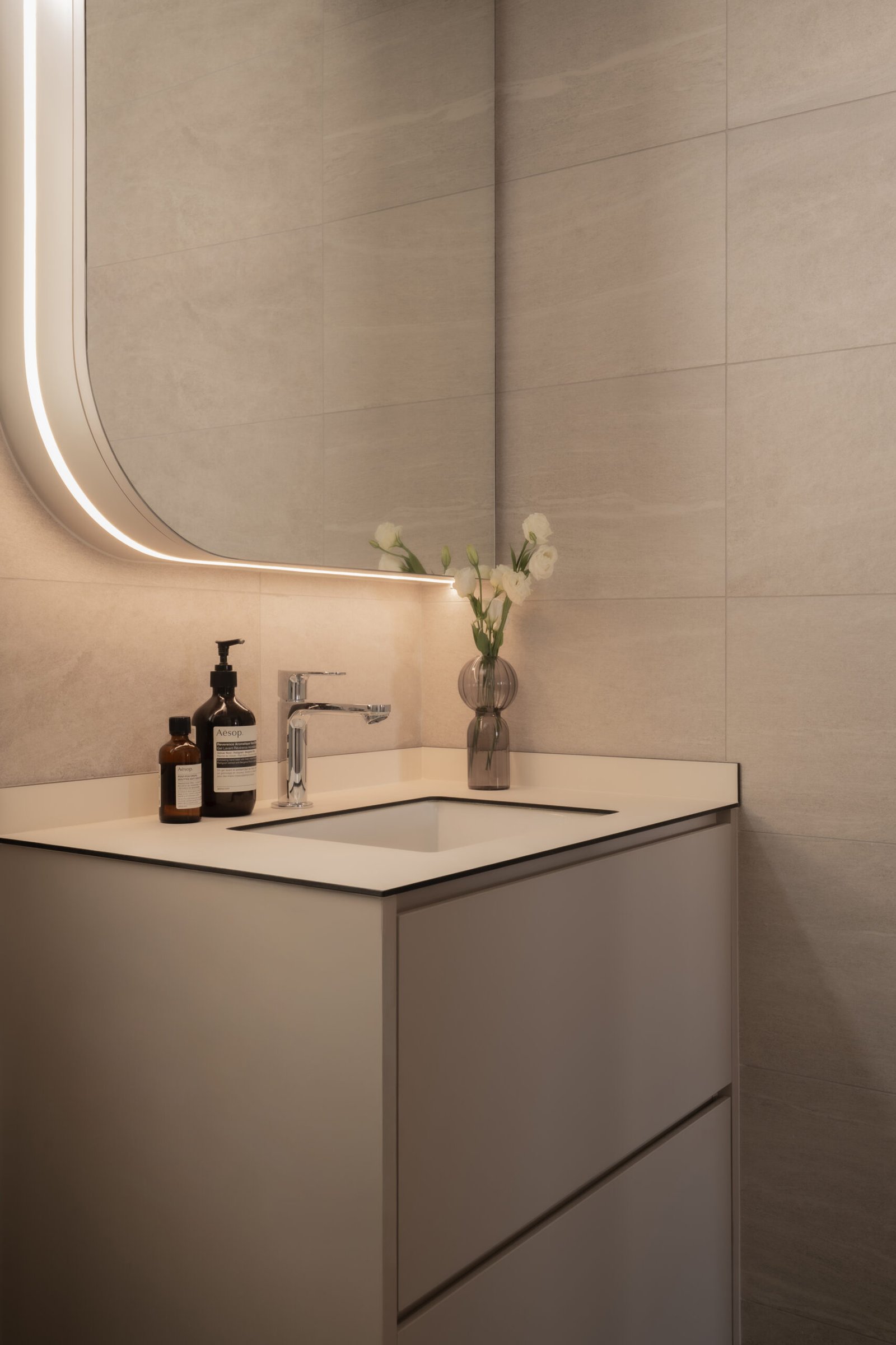 With a Scandinavian modern direction in mind, the couple envisioned a space that felt warm, intimate and practical for work, music and family life. Flexibility was essential because the home shifts between roles throughout the day. Smart lighting supports that rhythm, creating soft transitions between teaching sessions, playtime and quiet evenings. Originally completely open, the layout gave little sense of separation. Adding a wall defined the foyer while a circular opening allowed a soft, inviting view of the piano as one steps inside. Curves became a unifying language throughout the home. They continue from the foyer into the ceiling, subtly marking the transitions between dining, living and teaching zones. Viewed from different angles, these curves create a quiet visual movement that echoes the flow of music. Beyond aesthetics, the softened edges naturally make the home feel safer and more comforting for a young child. In the living and dining area, the family chose a projector instead of a TV to keep the space uncluttered and serene. Storage extends seamlessly from the piano to the window, with a dedicated recess that allows the piano to sit against the limewash walls. A dry pantry by the window keeps hosting easy. The master bedroom carries the same calm, cosy palette as the rest of the home. A walk-in wardrobe with glass display shelves showcases bags beautifully, while the layout allows one person to get ready without disturbing the other. A dedicated vanity adds convenience, and the round fluted wood bedhead, soft cove lighting, and limewash walls complete the serene, restful environment. From the piano that greets you at the entrance to the soft arcs that carry the eye across the ceiling, this home unfolds like a carefully composed piece of music.
