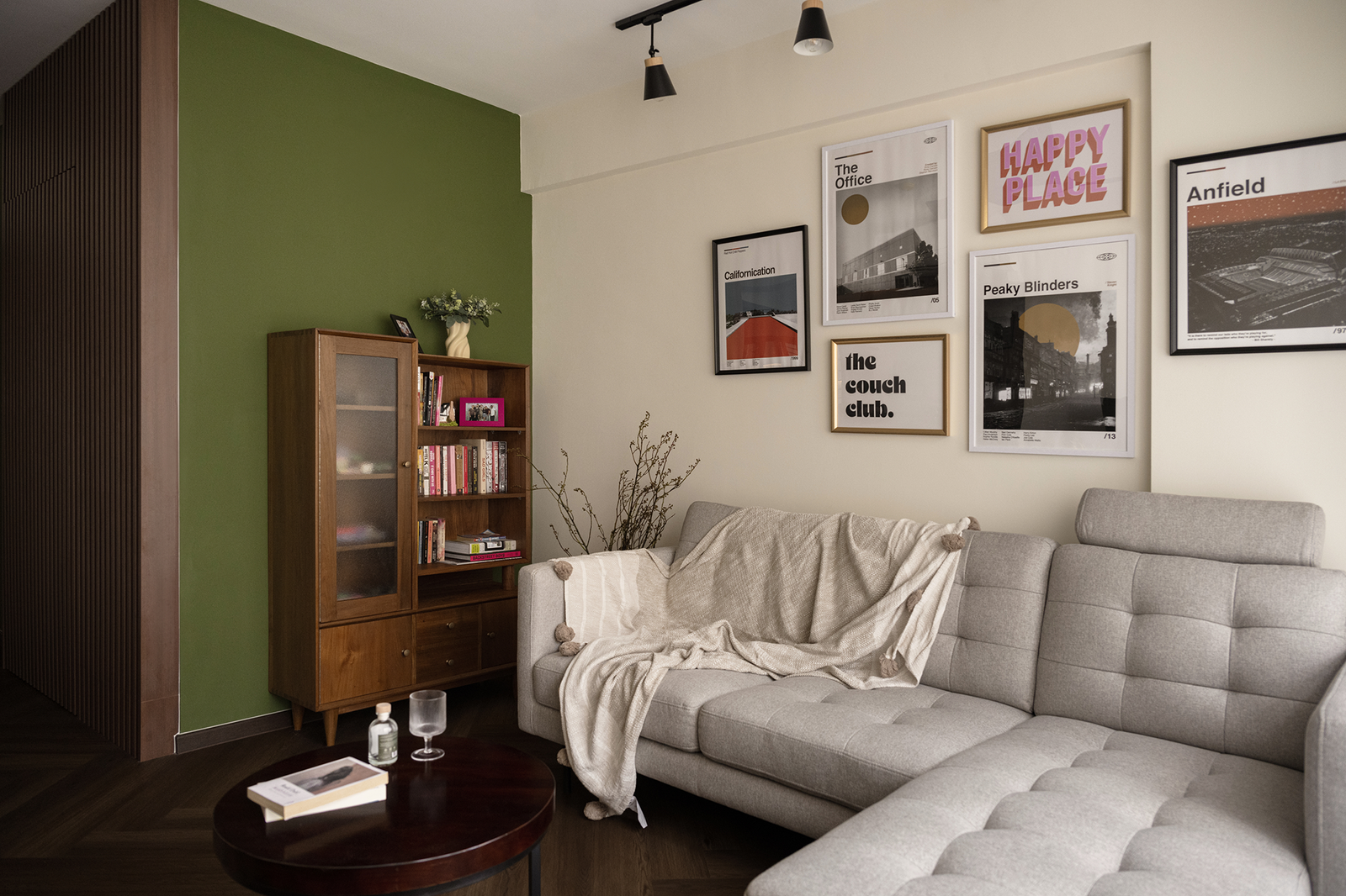Loose furniture arrangements allow the living area to feel open and flexible, while an accent green wall adds depth and highlights key focal points. Framed posters and curated items create an intimate gallery that speaks to the couple’s shared life and interests, balancing vibrancy with a sense of calm.