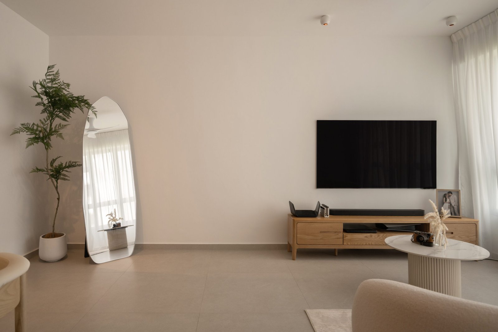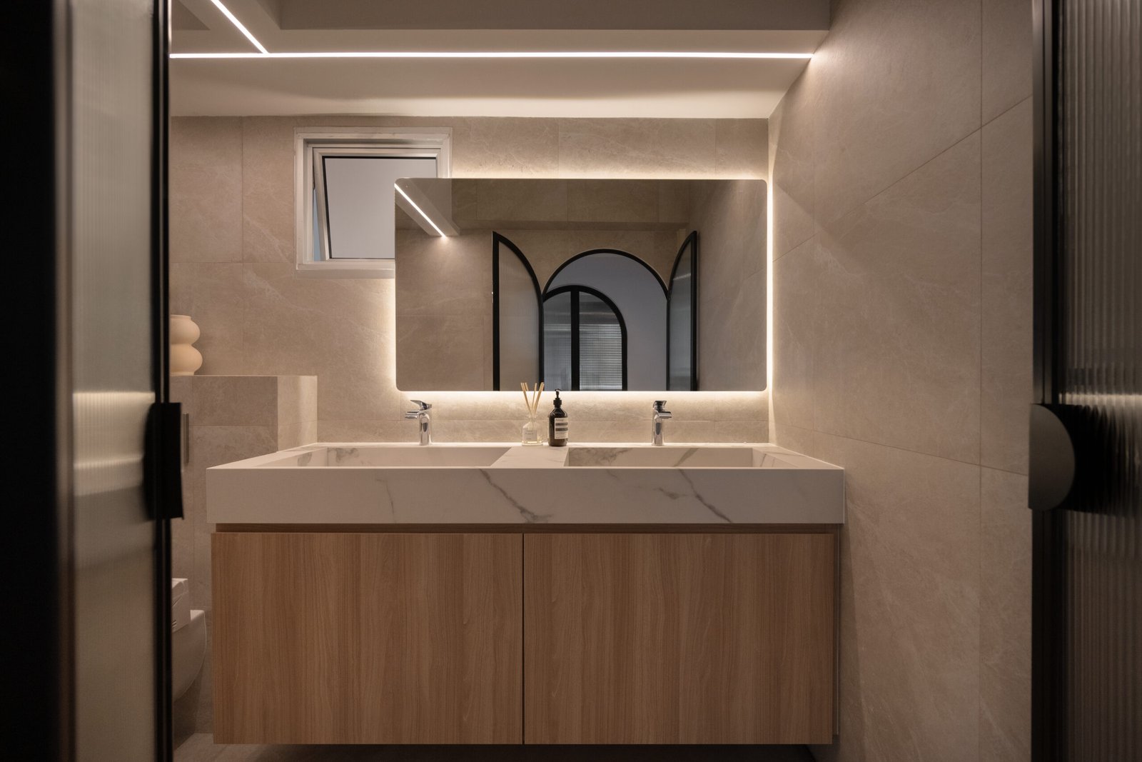 Soft wood tones meet crisp whites to form a serene canvas, while arches, curves, and slim black accents add definition. Light plays a starring role here, thoughtfully layered to bring depth to textures and highlight the home’s architectural lines, shifting from bright and lively in the day to moody and intimate by night.