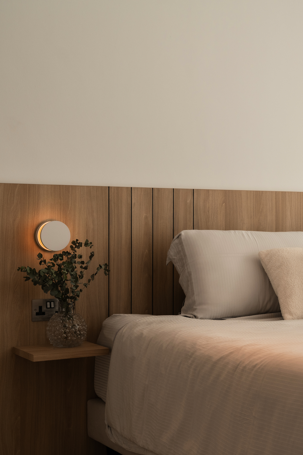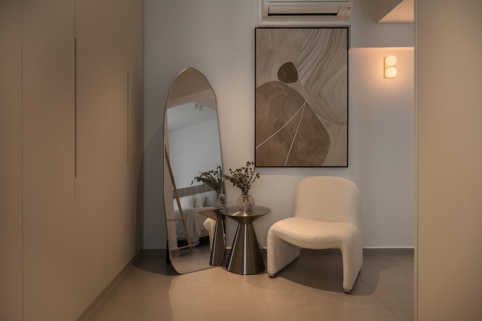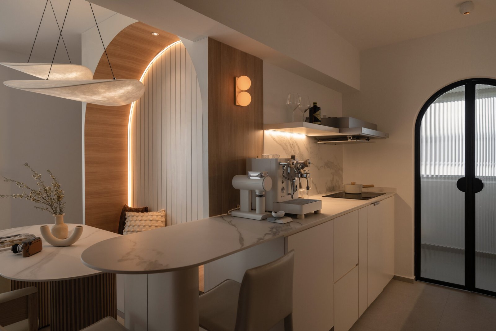 The dining area becomes an instant focal point. Set within a softly arched alcove, the niche features subtle fluted detailing and LED lighting that trace its gentle curve, creating a play of light and shadow that wraps the space in a cosy glow. It’s a spot that draws the eye the moment you enter, setting the tone for the home’s inviting atmosphere.