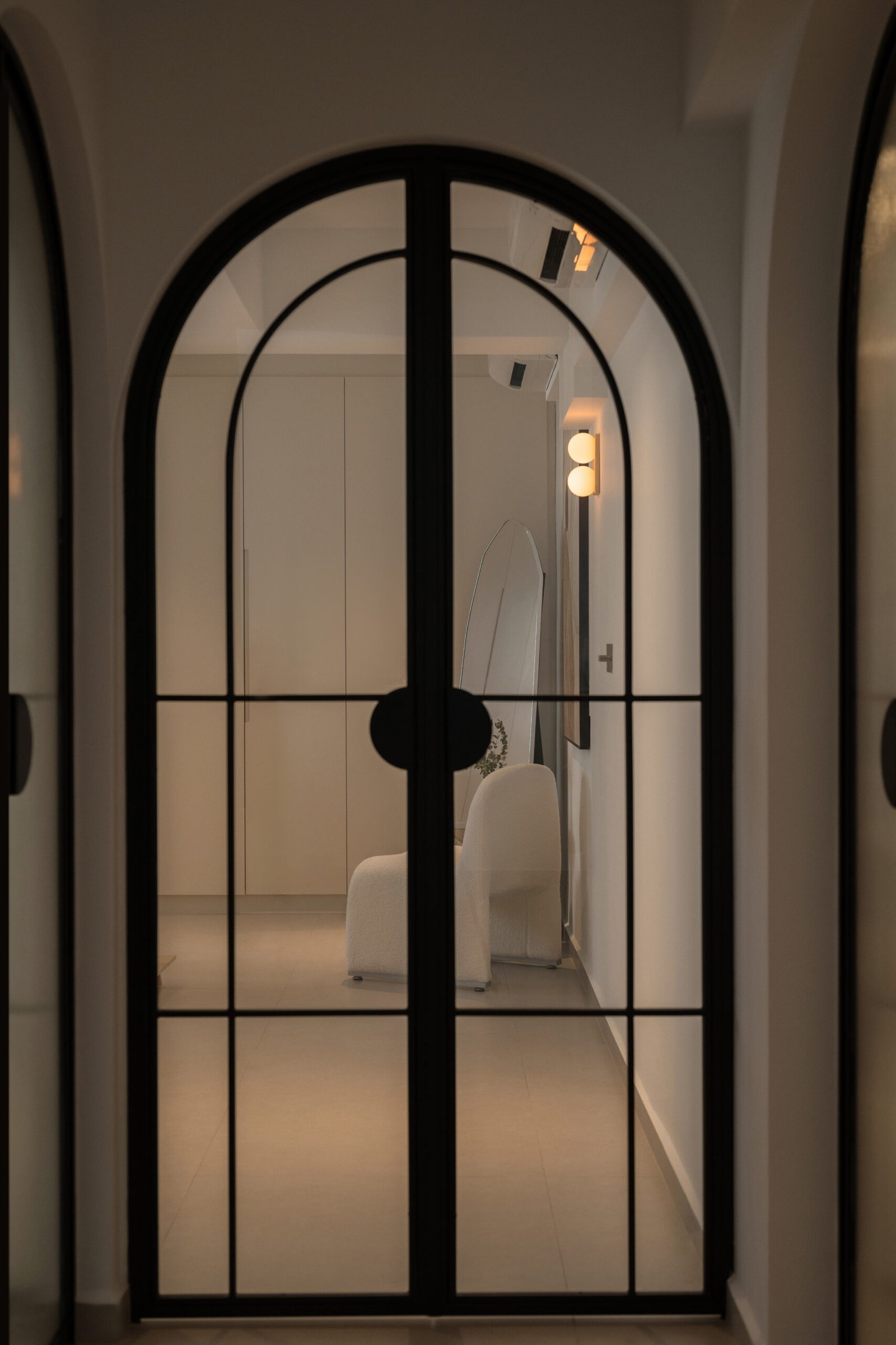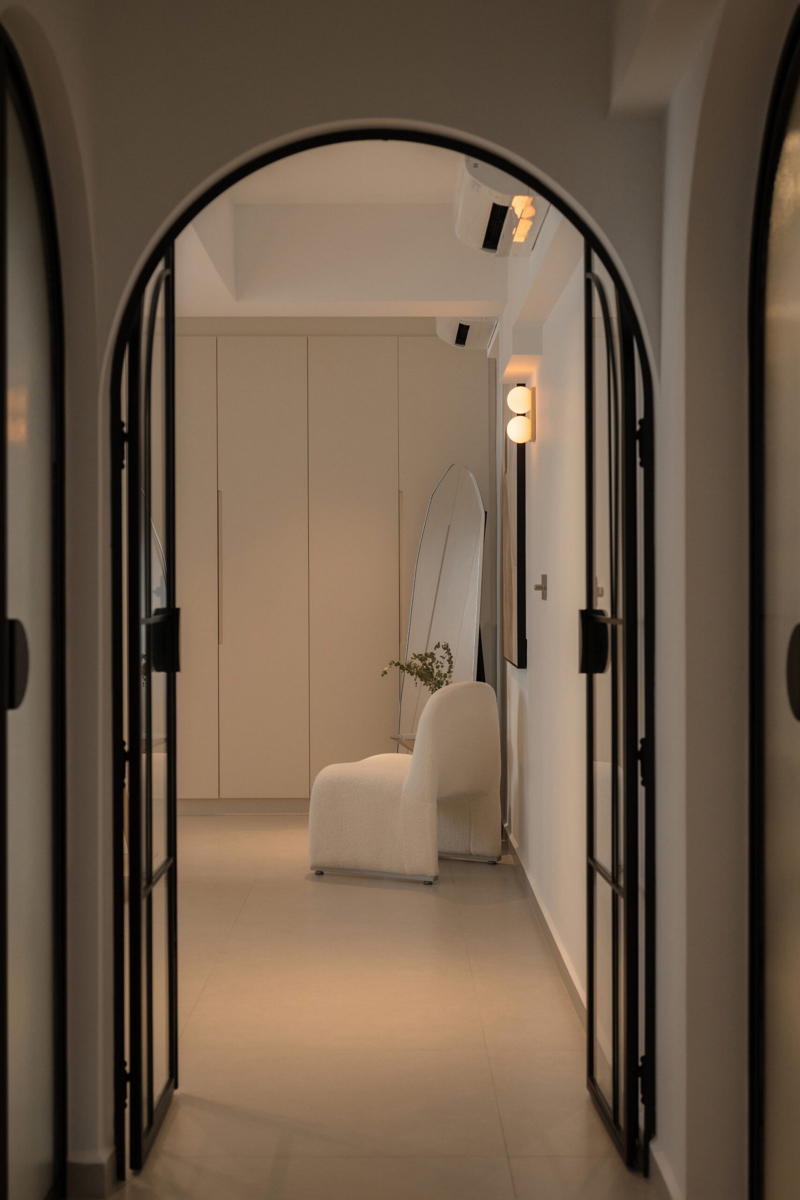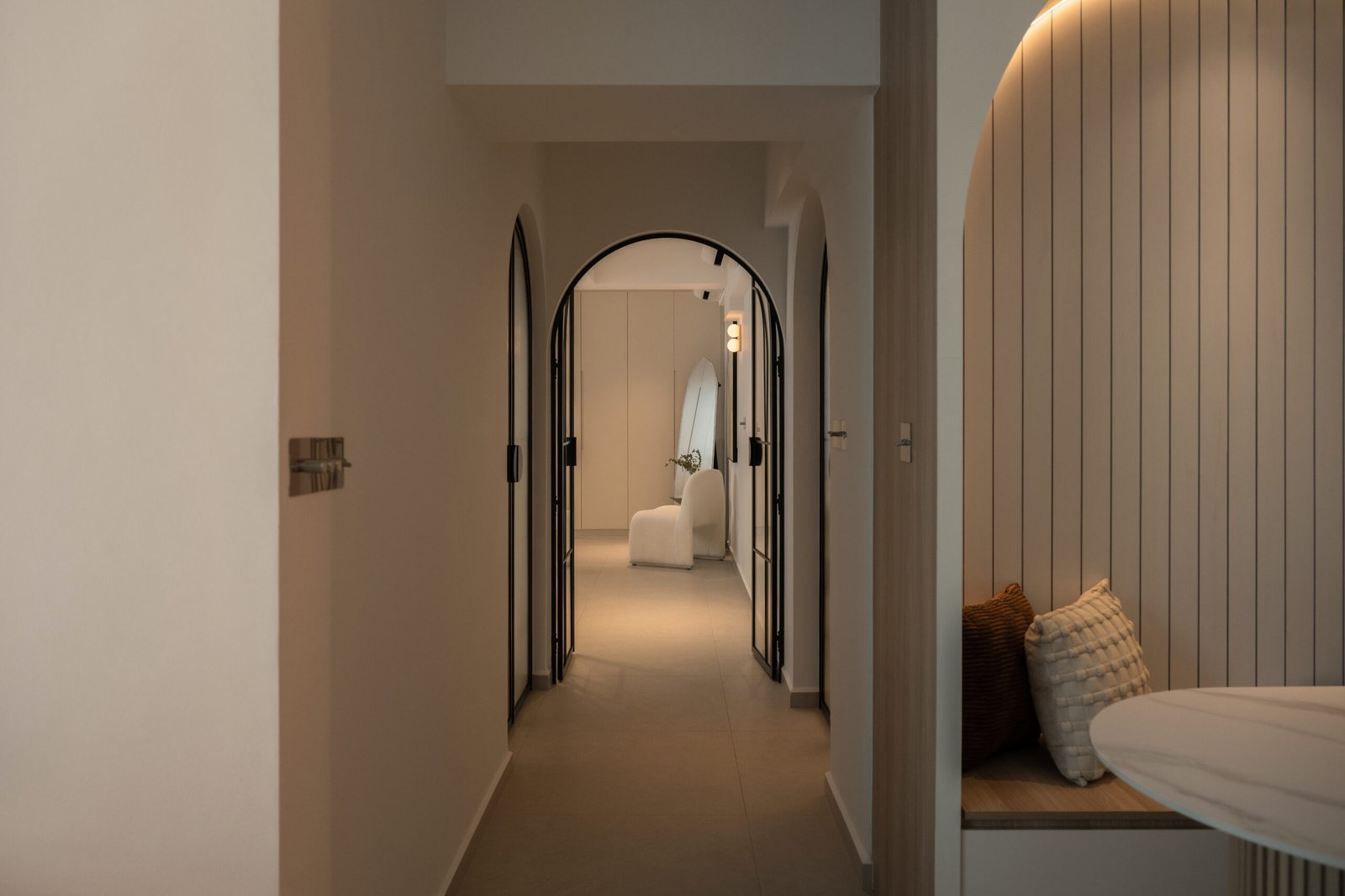 The walkway is a defining feature of the home, lined with three graceful arched doors leading to the master bedroom, study-gym area, and bathroom — a detail that not only creates a striking visual rhythm but also softens the geometry of the space.
