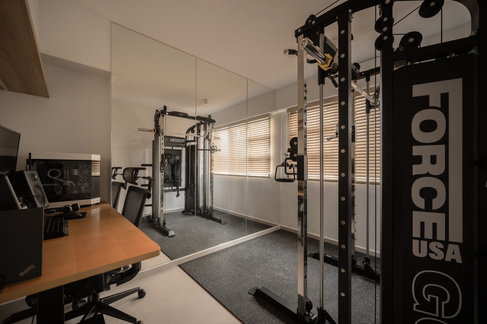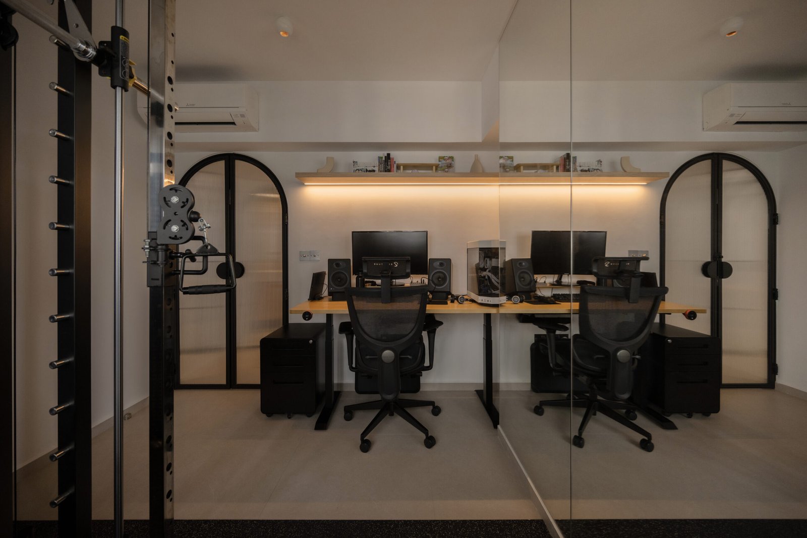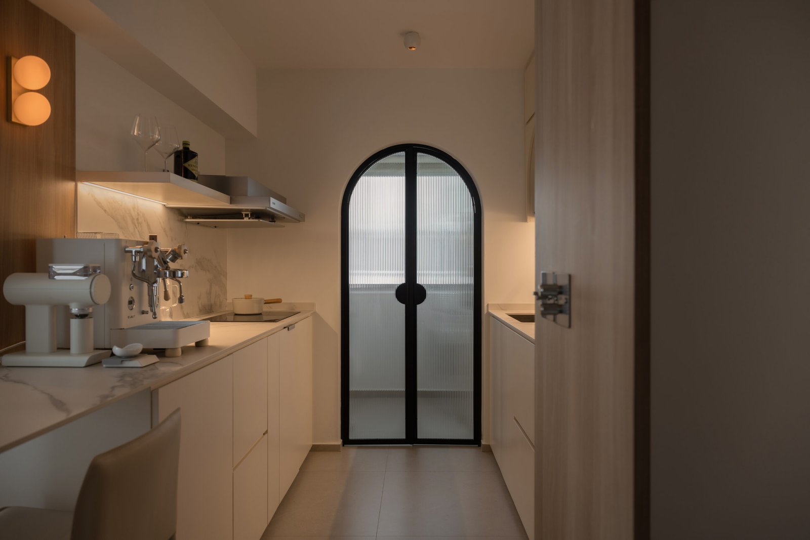 The walkway is a defining feature of the home, lined with three graceful arched doors leading to the master bedroom, study-gym area, and bathroom — a detail that not only creates a striking visual rhythm but also softens the geometry of the space.
