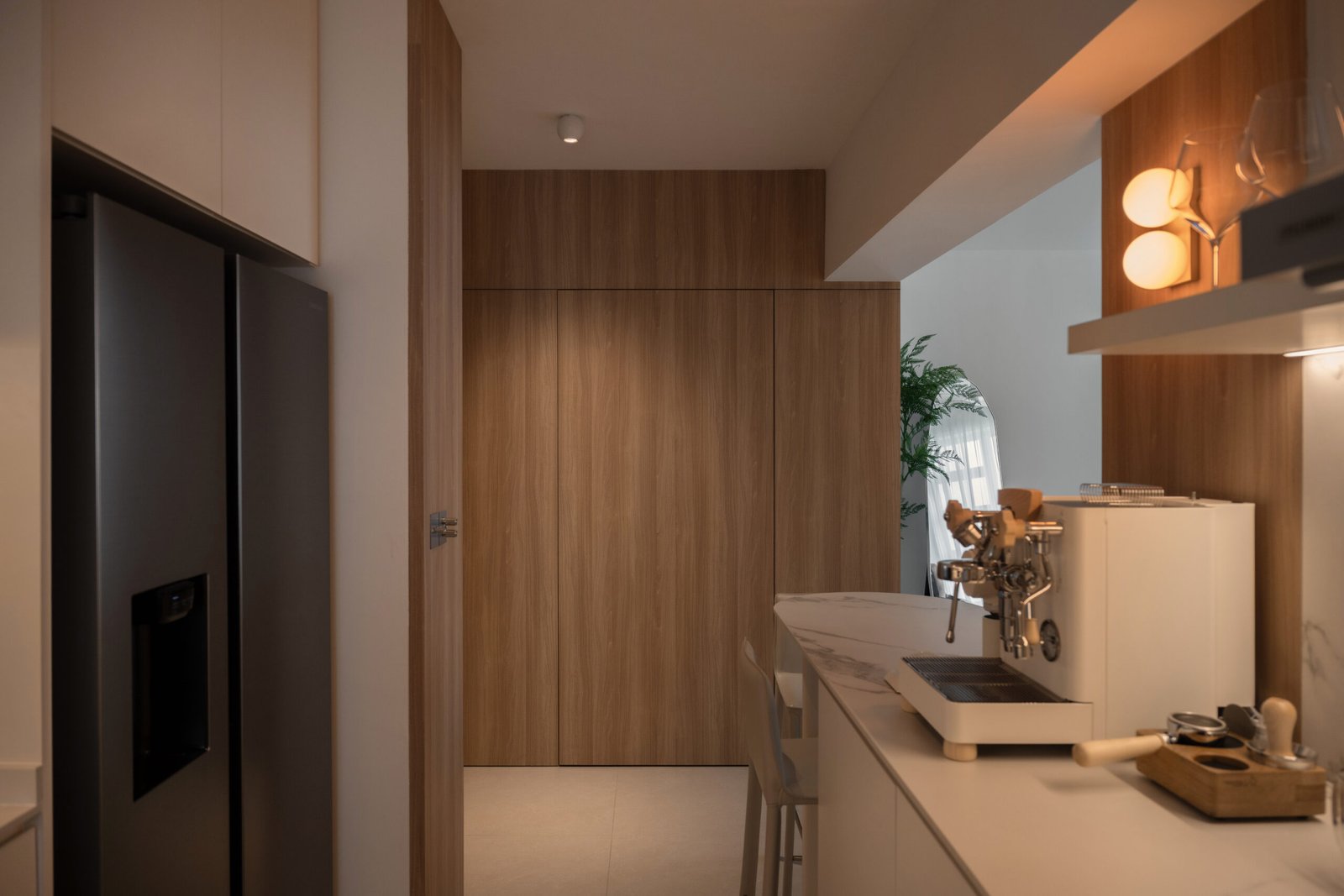 Flowing from here, the kitchen blends practicality with personality. Closed cabinetry keeps everyday clutter out of sight, while the opposite side hosts a coffee and hob counter, a ritual space for morning brews or weekend indulgences. A simple open shelf displays curated pieces, giving the area warmth and charm. The marble-like peninsula stretches toward the dining area, doubling as a casual gathering spot or a place to chat while coffee steams.