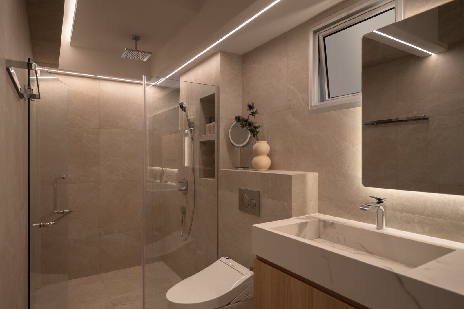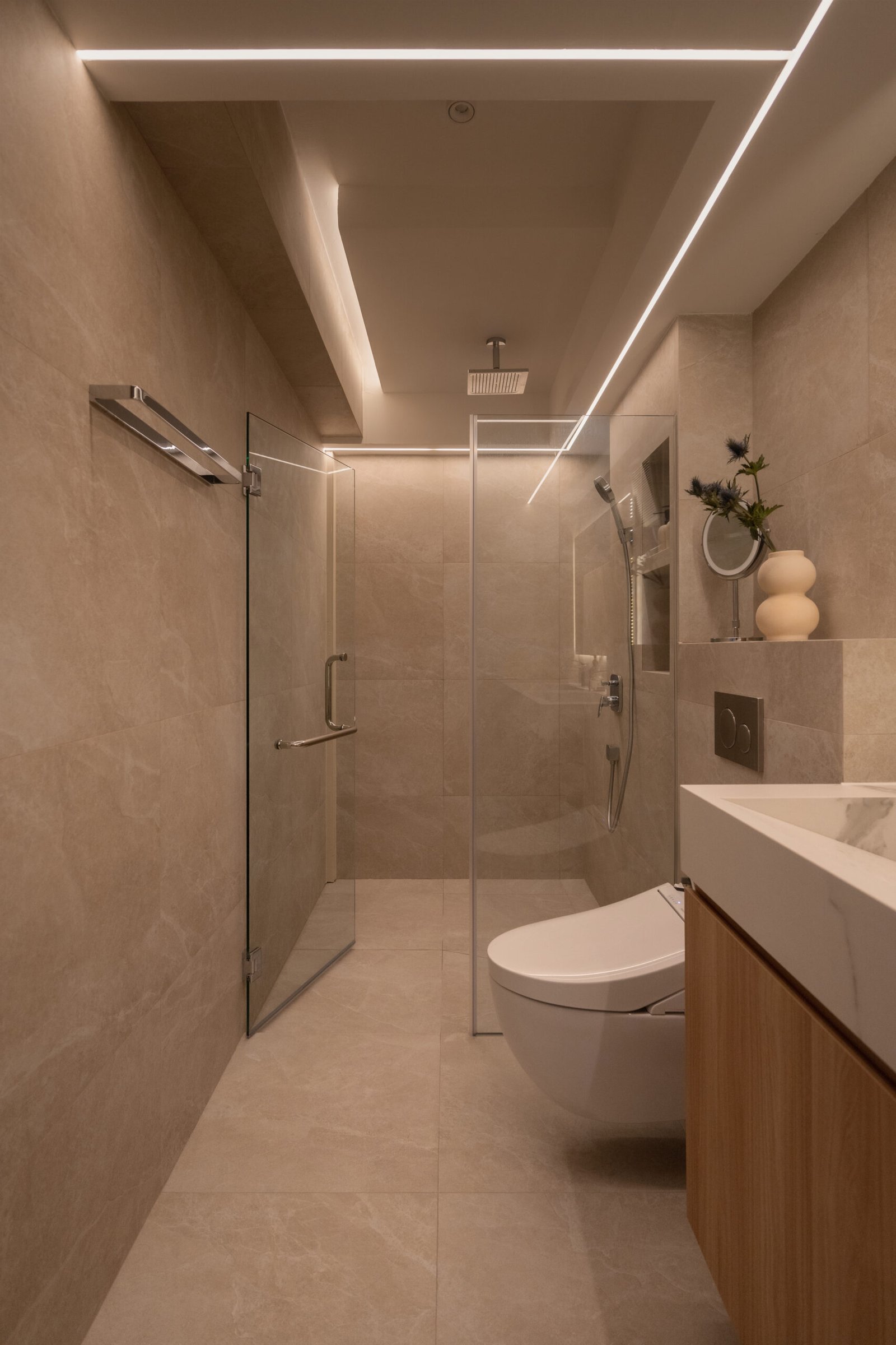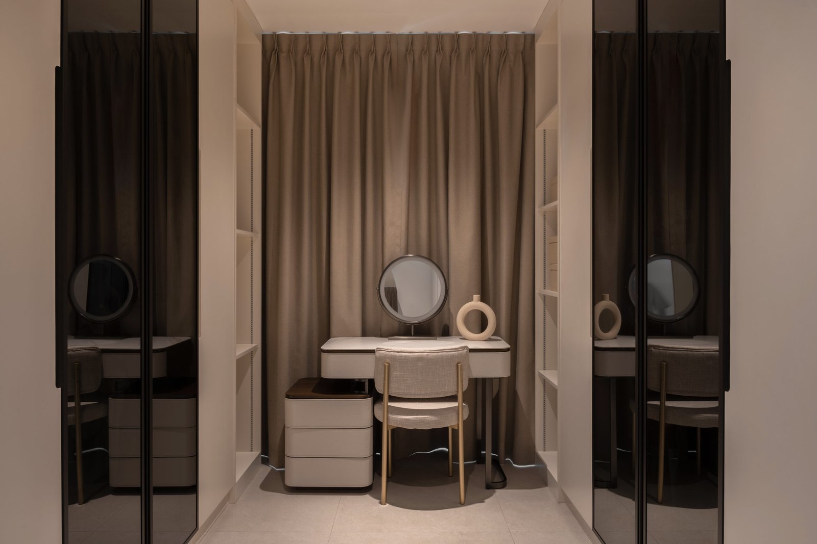 In the private quarters, the master suite was expanded by merging an adjoining room to create a spacious walk-in wardrobe. A mix of modern and classic finishes including black translucent glass panels for the wardrobe gives the space a refined appeal. The bathrooms, once separate, now combine into a generous his-and-hers retreat, styled like a boutique spa — clean lines, ample counter space, and lighting that feels calm and restorative.