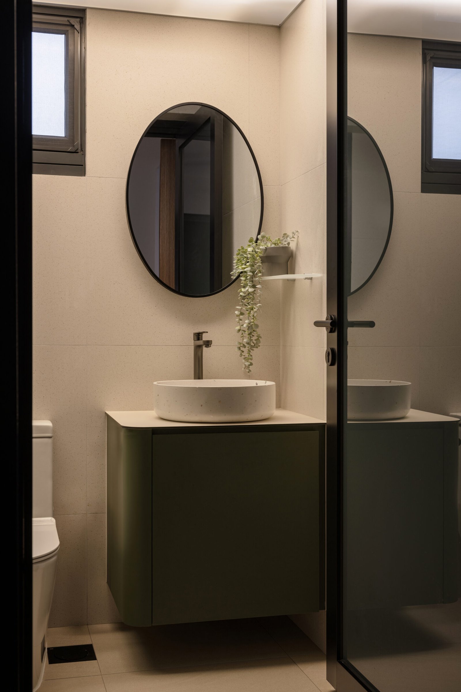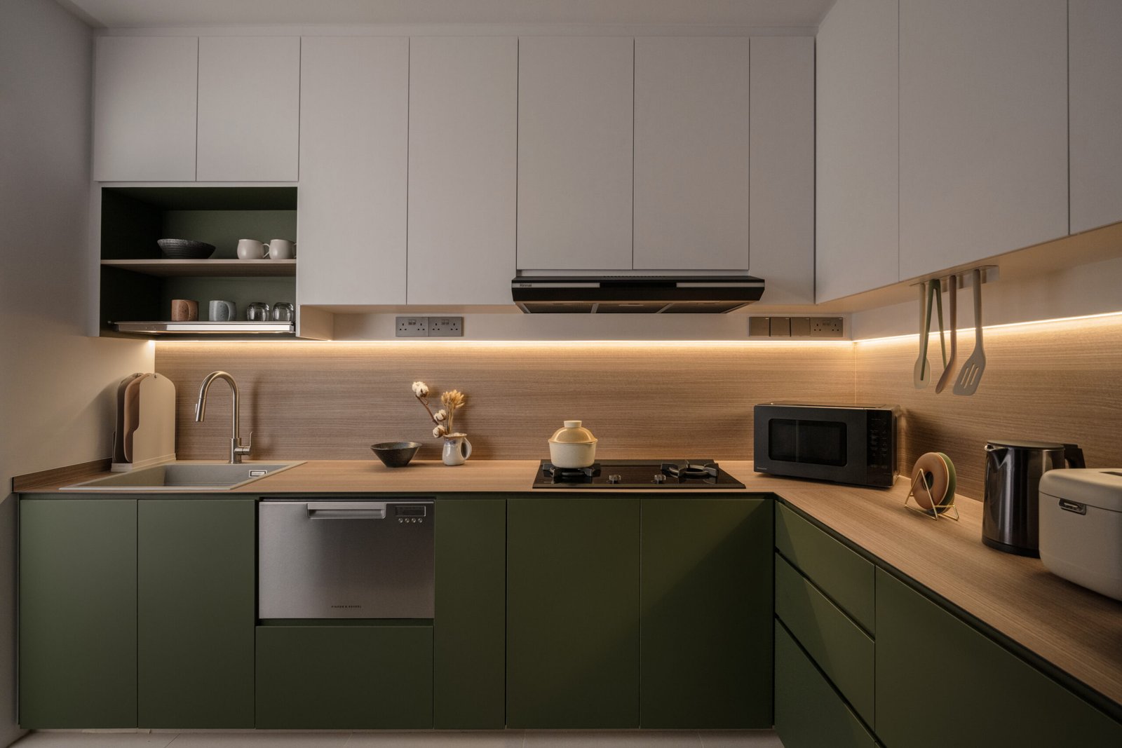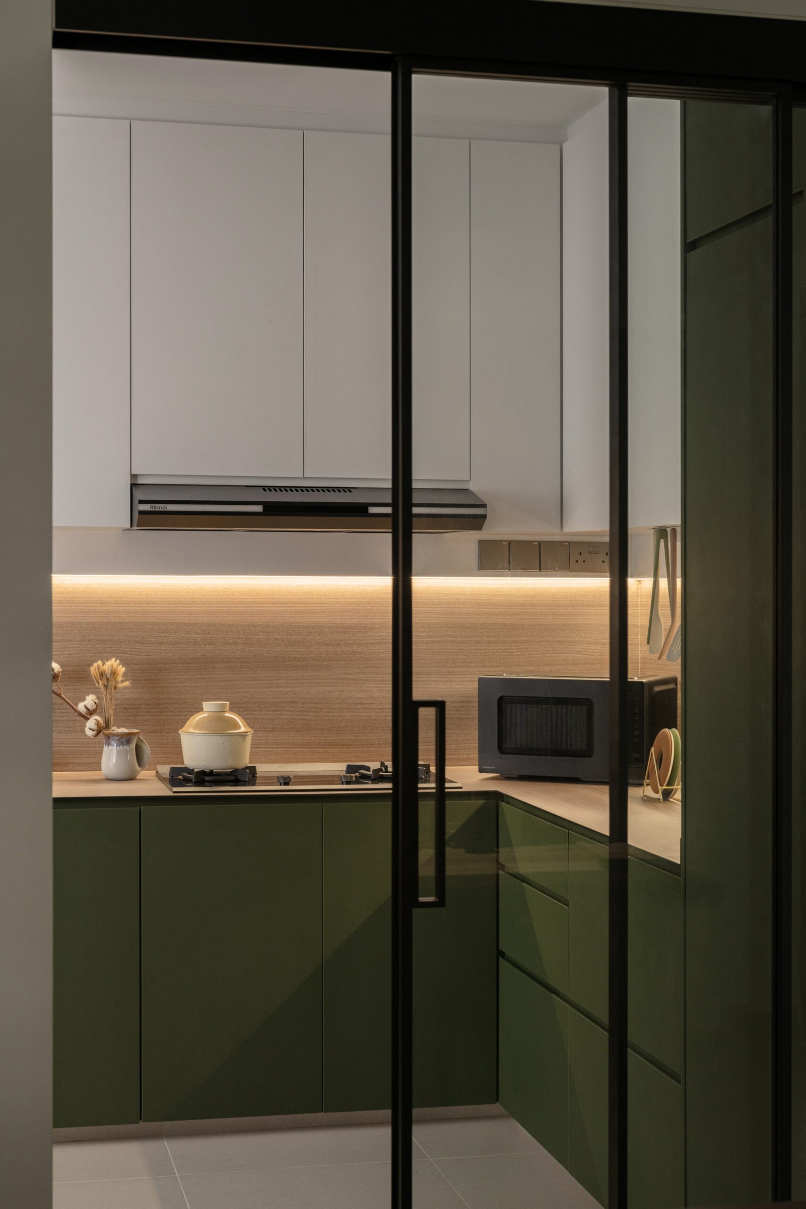 This flat transforms everyday living with a green-centric palette and warm wood tones. Green flows throughout from cabinets and walls to curated details, creating a cohesive, vibrant, and surprisingly spacious home that reflects the homeowners’ love for the colour.