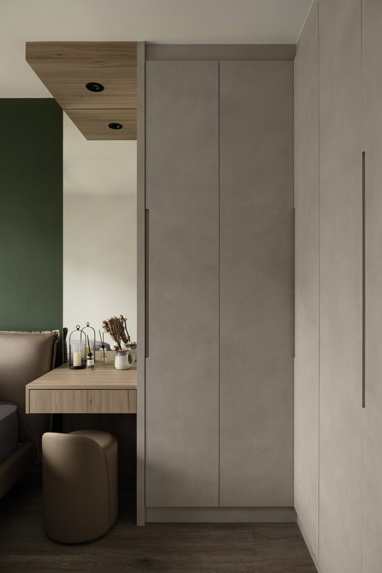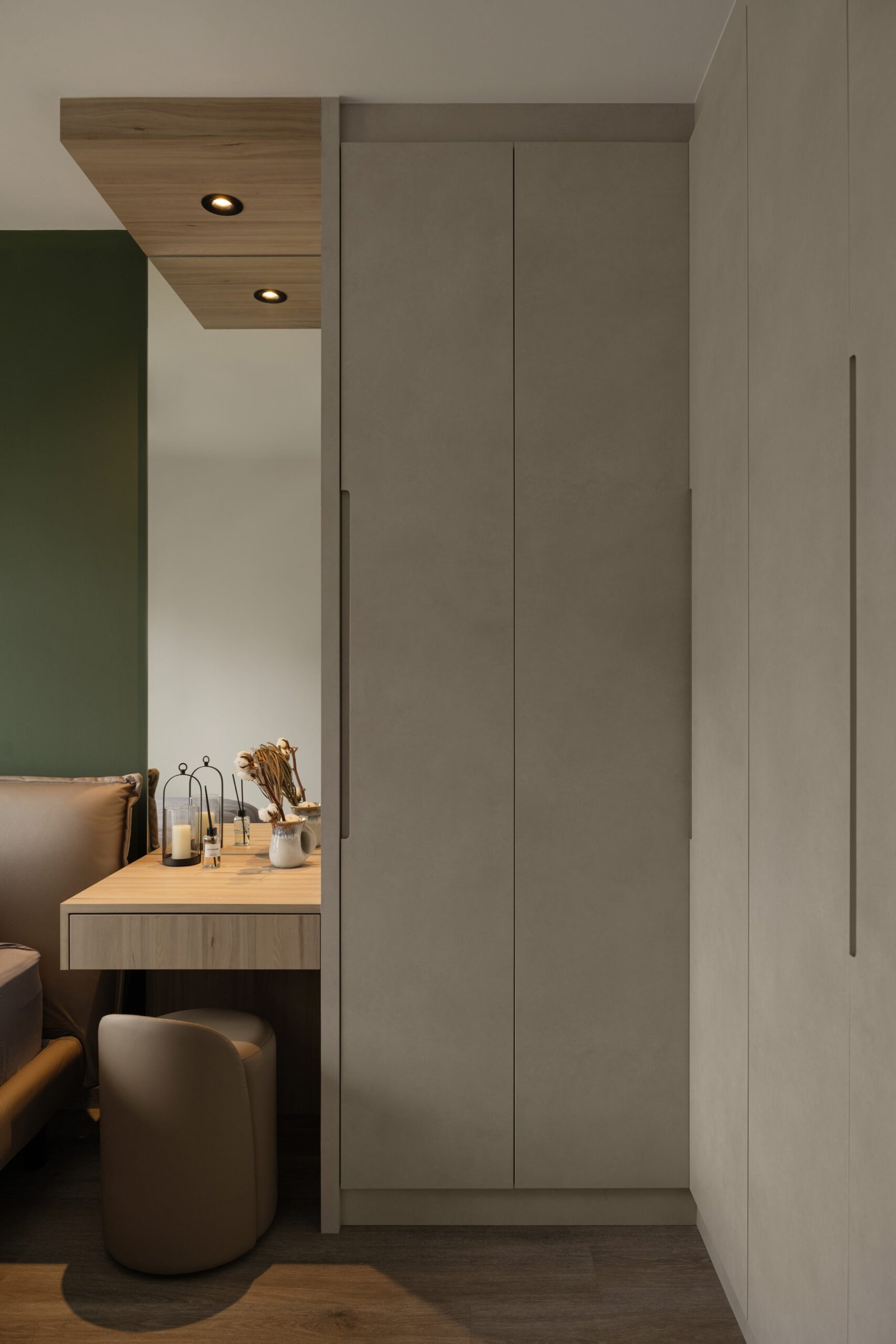 In the master suite, a dark green feature wall and floor-to-ceiling wardrobe are softened by an L-shaped layout, keeping the room airy while leaving space for storage. The master bathroom continues the green wall tiles and a curving vanity creating a calm, organic retreat.