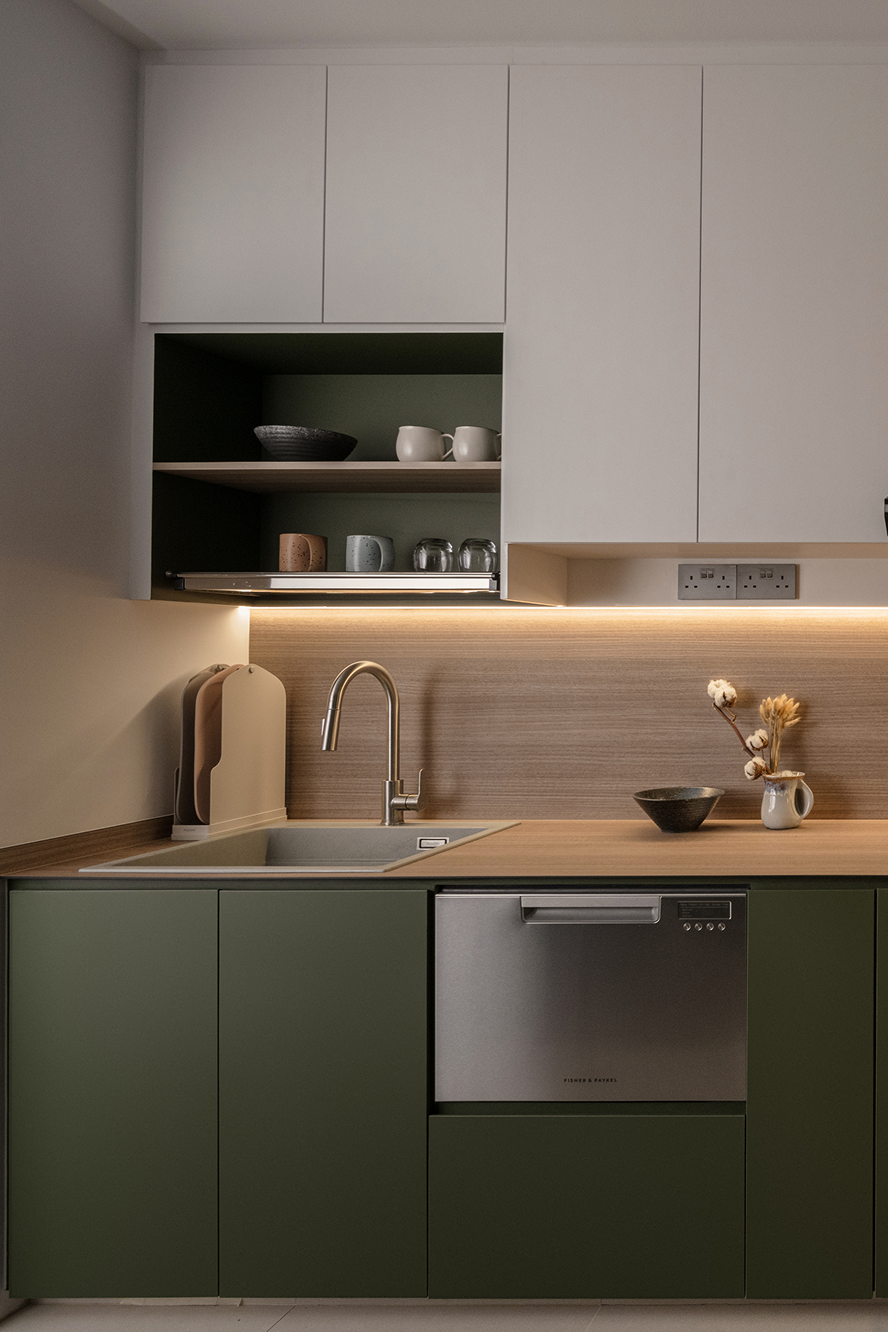 Green finds its first bold expression in the kitchen, where olive-hued lower cabinets meet wood-look countertops and crisp white upper cabinets. The combination brings warmth and personality, balancing the playful, nature-inspired aesthetic with practicality and understated sophistication.