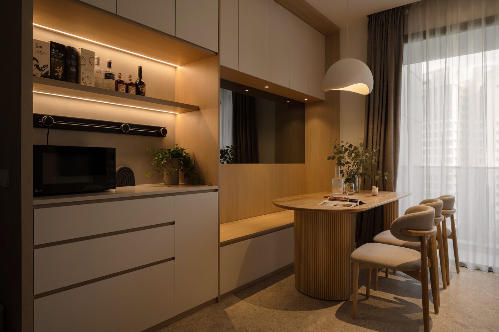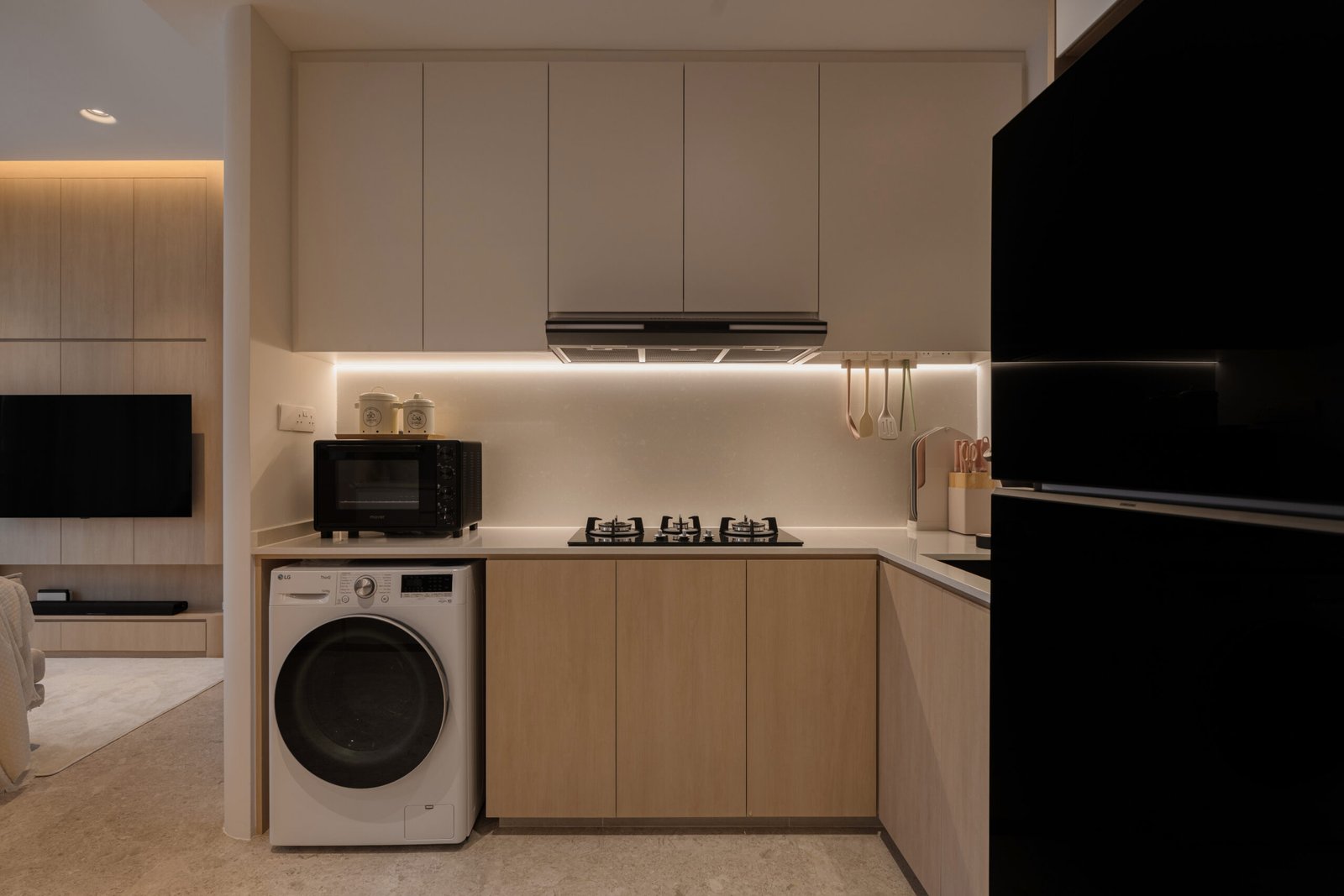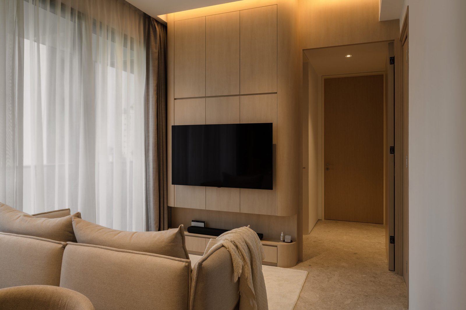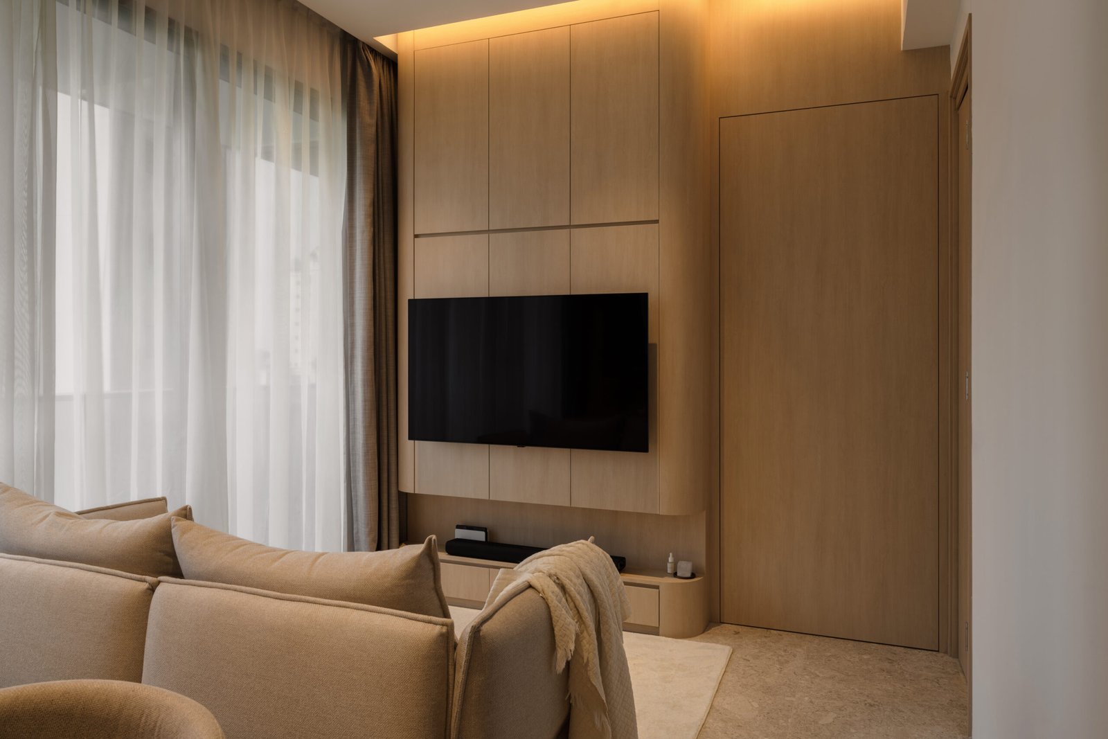 Storage was a key priority, but instead of bulky cabinetry, the design hides it in plain sight. A TV feature wall finished in light wood laminate doubles as sleek storage, while a concealed doorway within it leads to the private quarters. Rounded carpentry edges and seamless finishes keep the look refined, with every line contributing to a sense of flow.