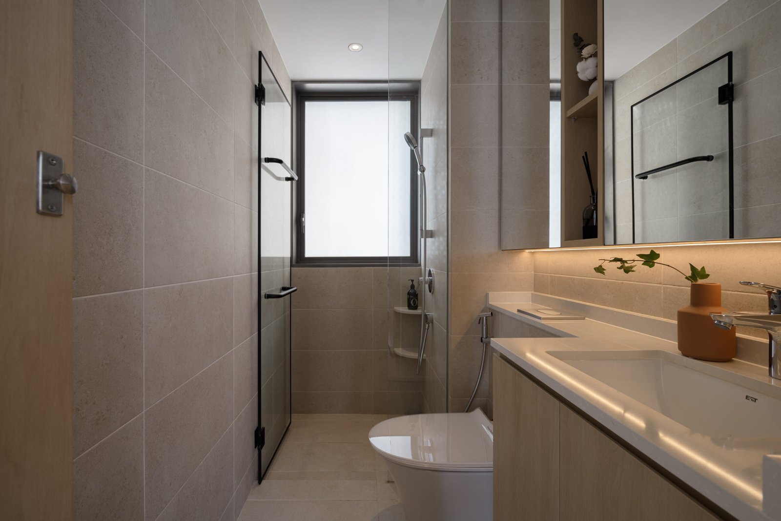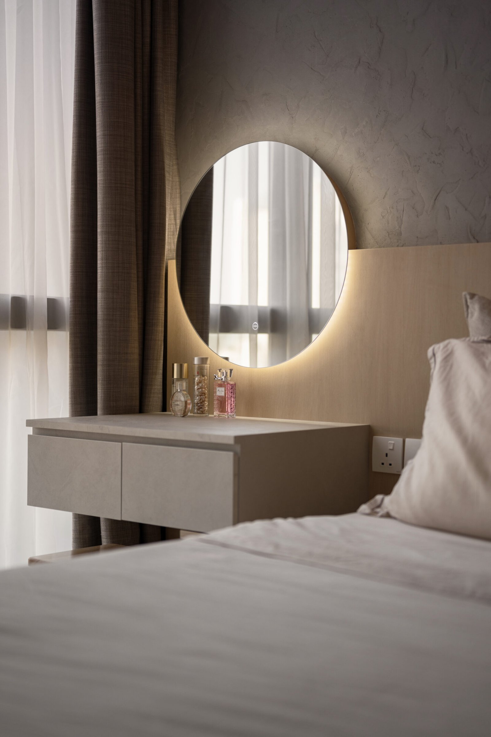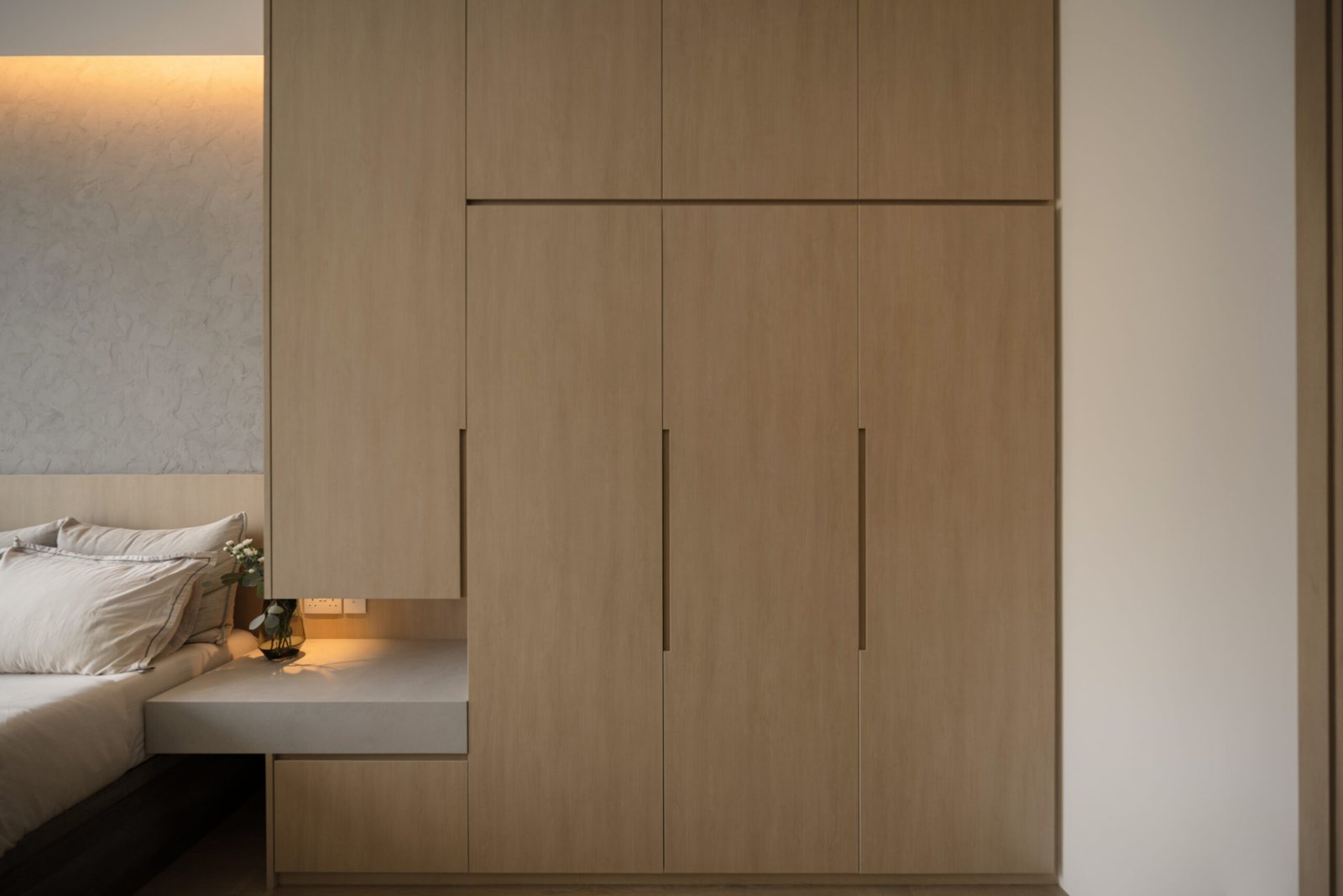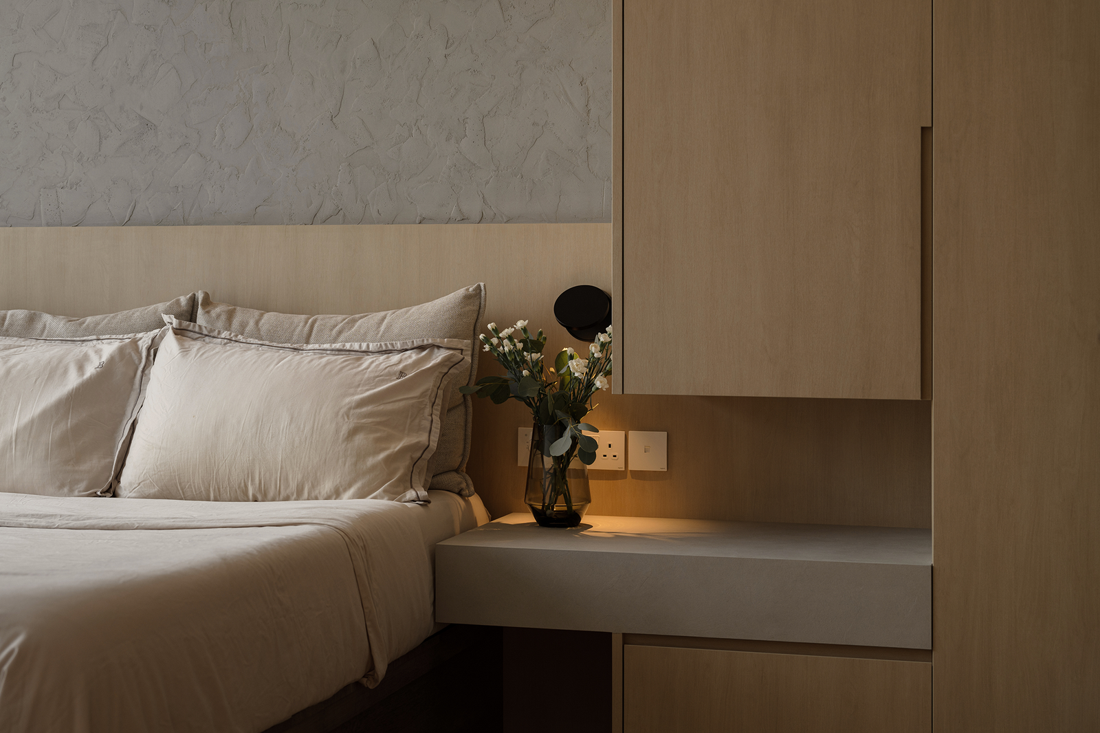 In the private quarters, tactile elements come into play. A textured cement wall anchors the master bedroom with quiet character, while integrated furniture ensures that even a modest footprint works hard. The vanity was shifted outward from the en-suite, a small yet thoughtful gesture that opens up the bathroom while adding convenience to everyday routines.