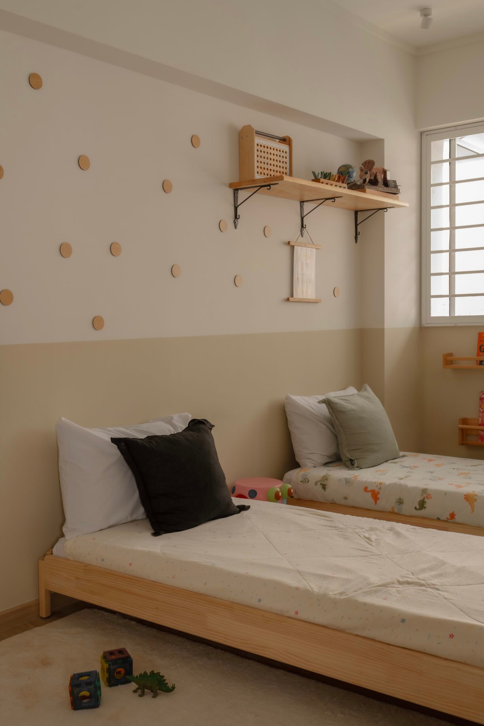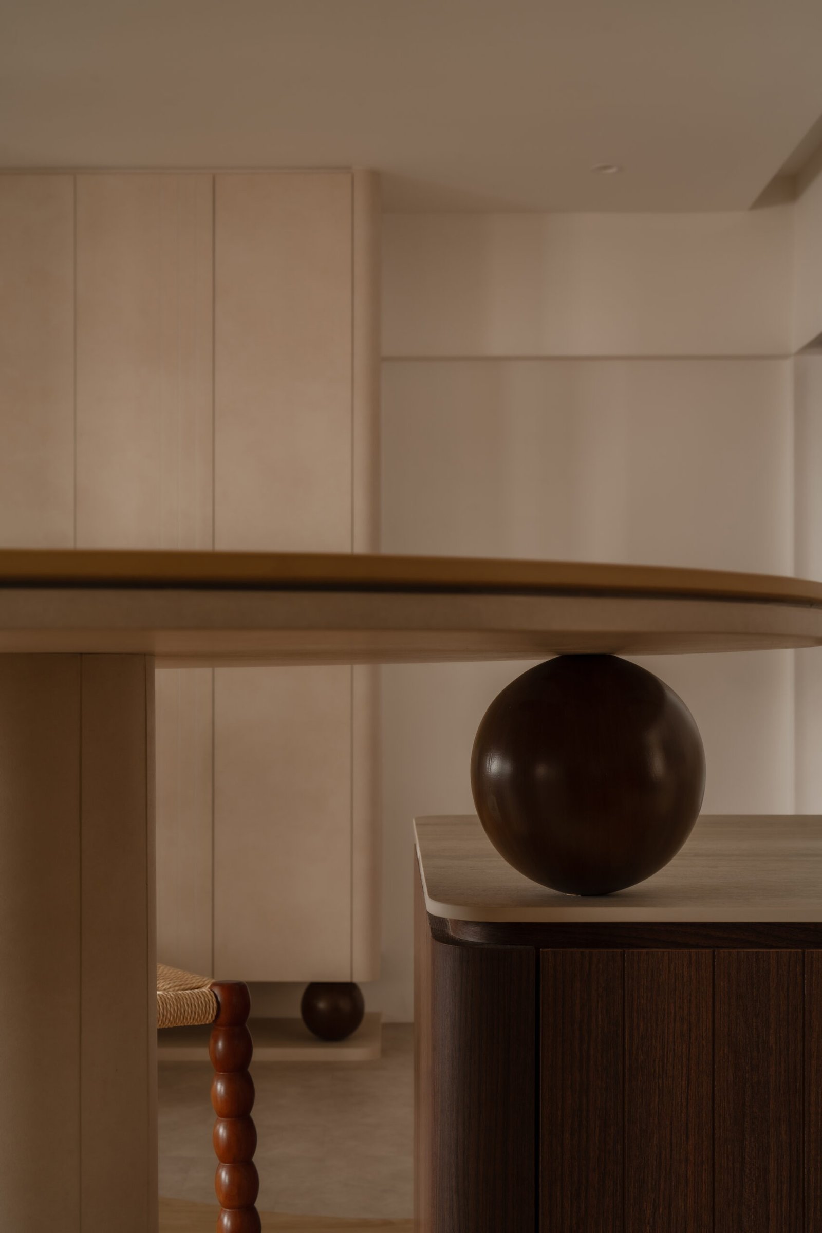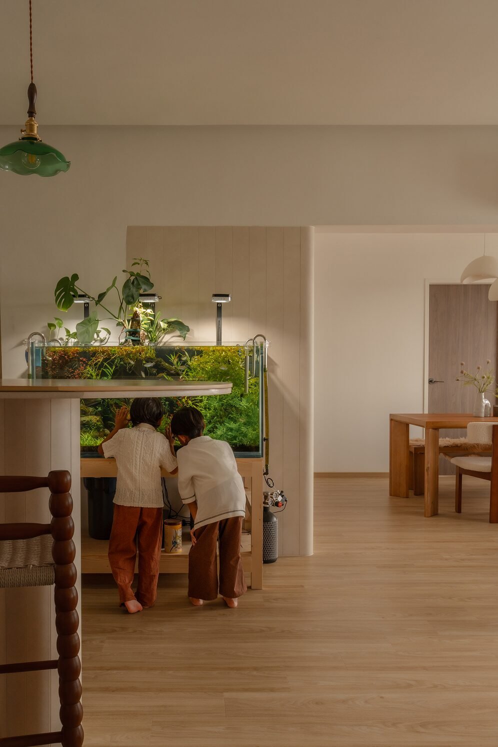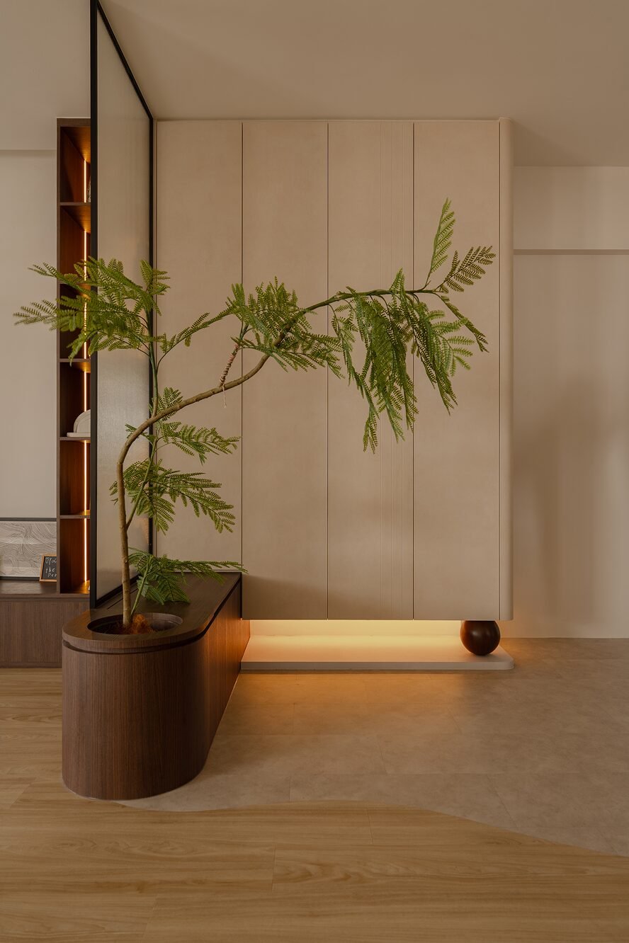 Designing their home meant embracing both worlds. The spaces needed to be kid-friendly and open, allowing the children to play freely, while also offering calm, serene corners inspired by the parents’ interests. Natural materials, soft lighting, and subtle textures create warmth and grounding throughout, while curves in the carpentry add both safety and softness, reflecting a careful attention to daily life.