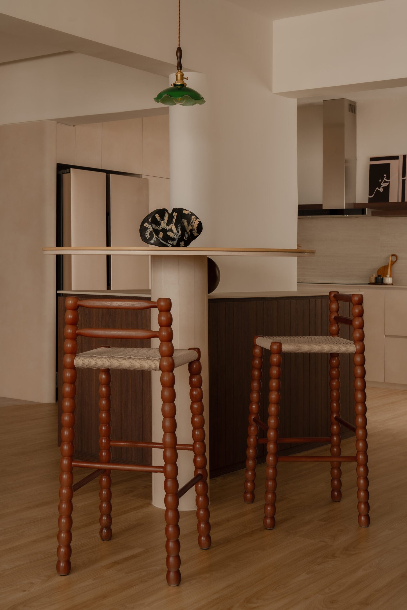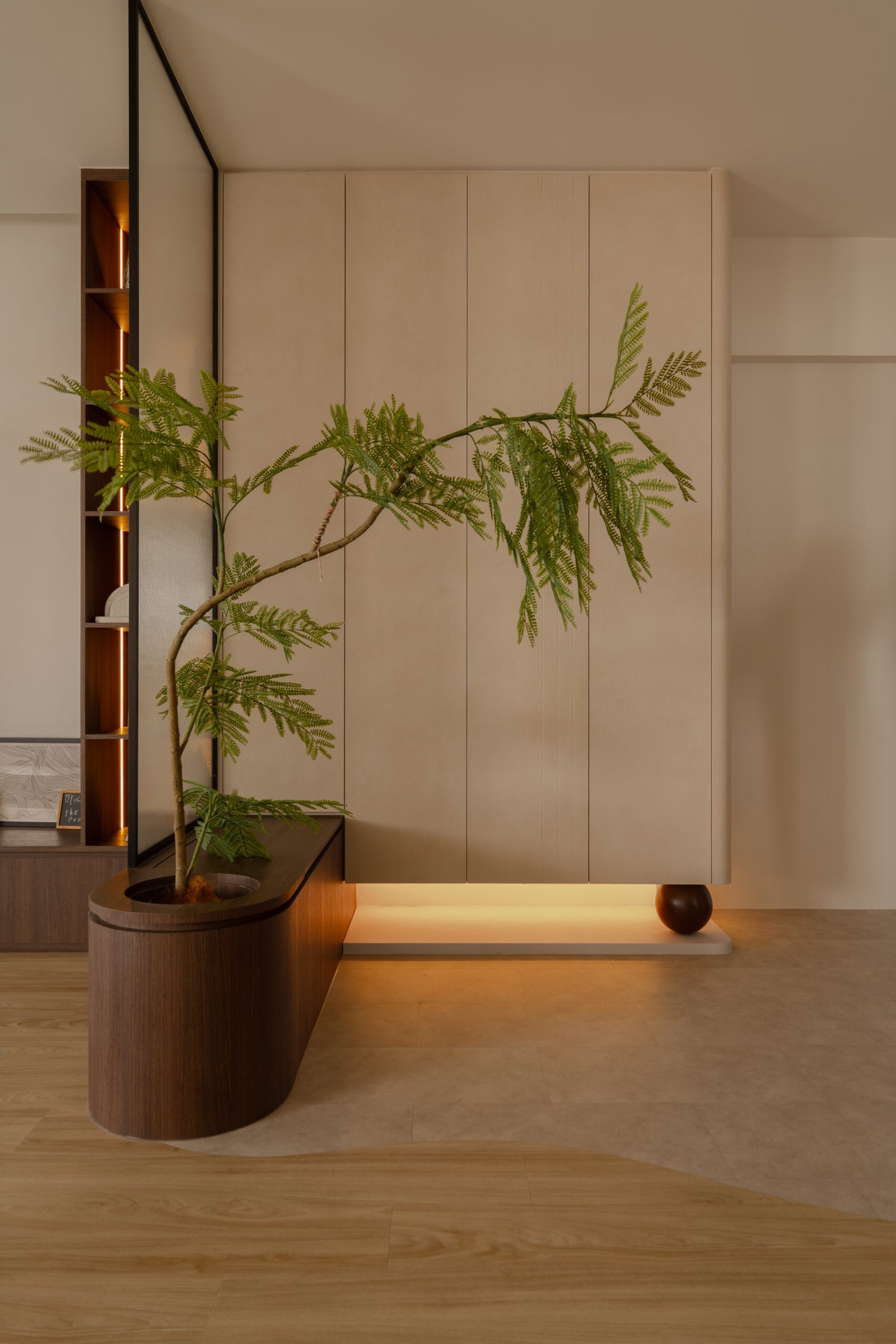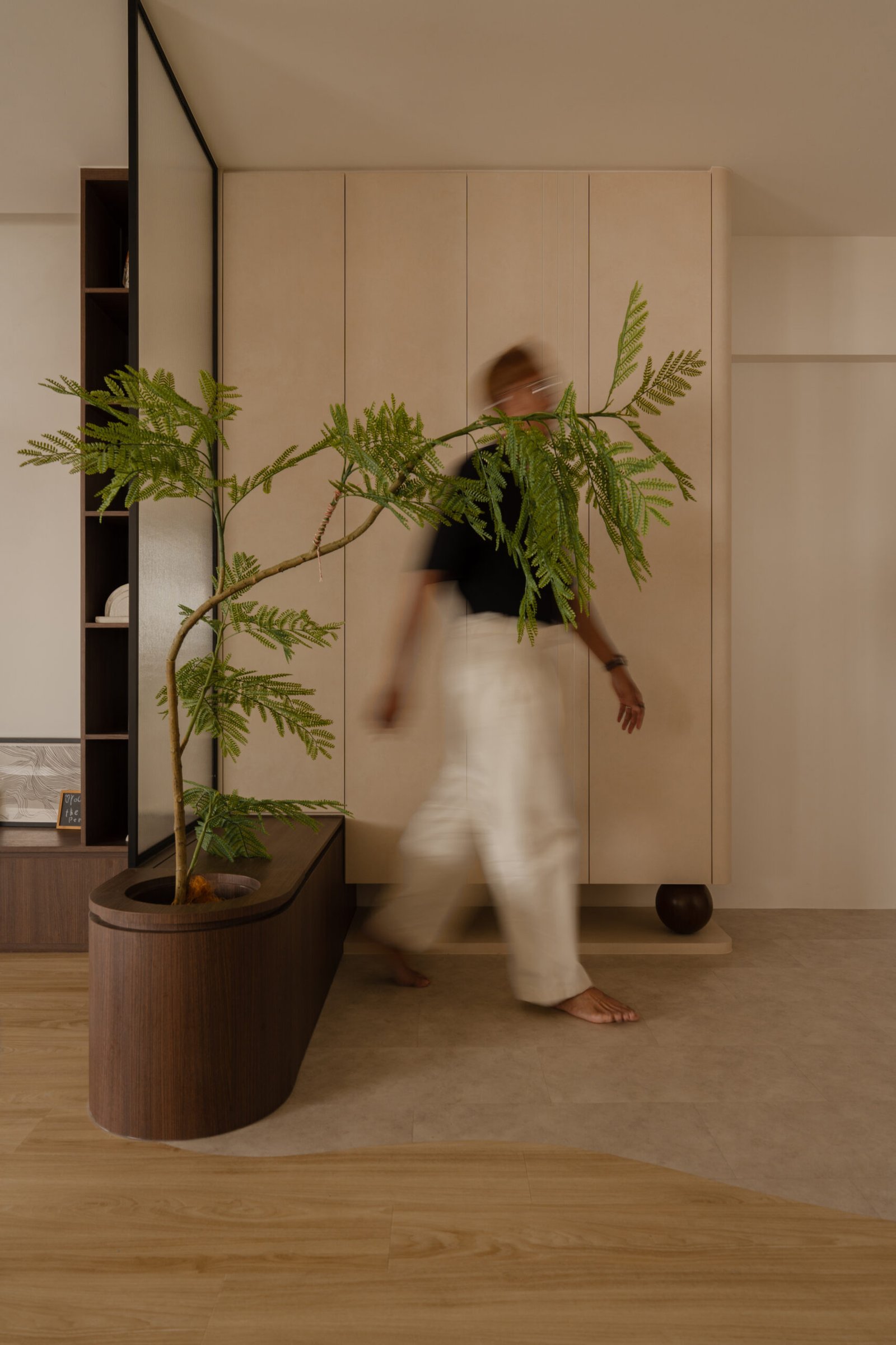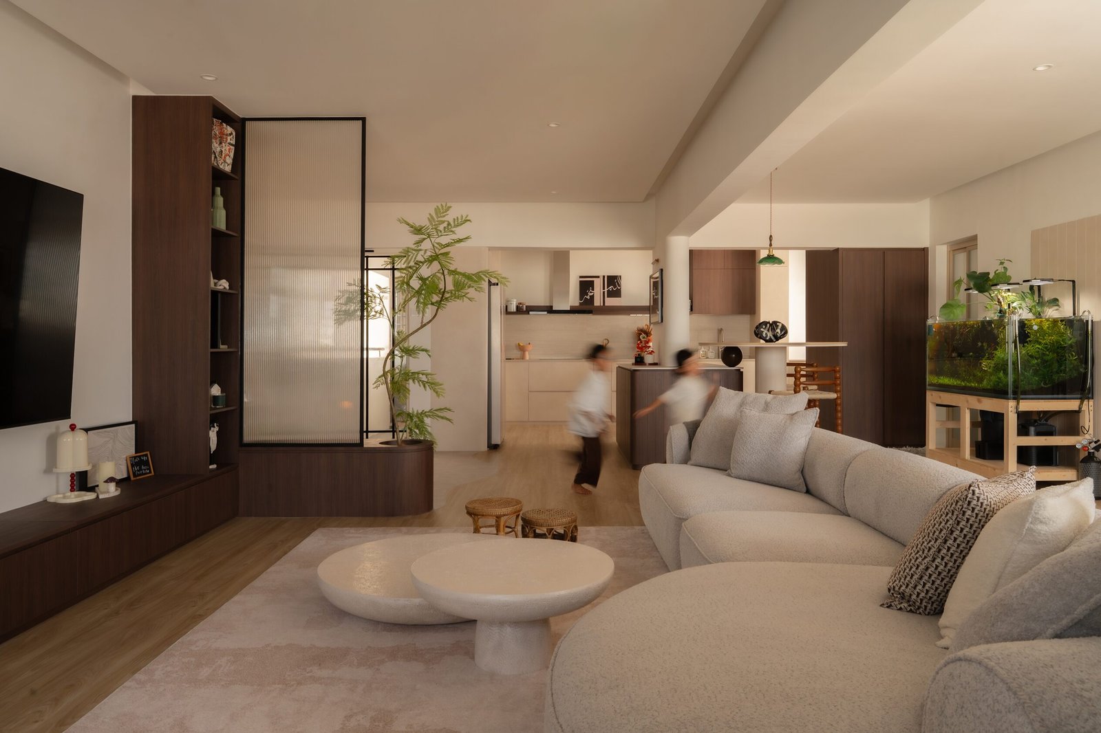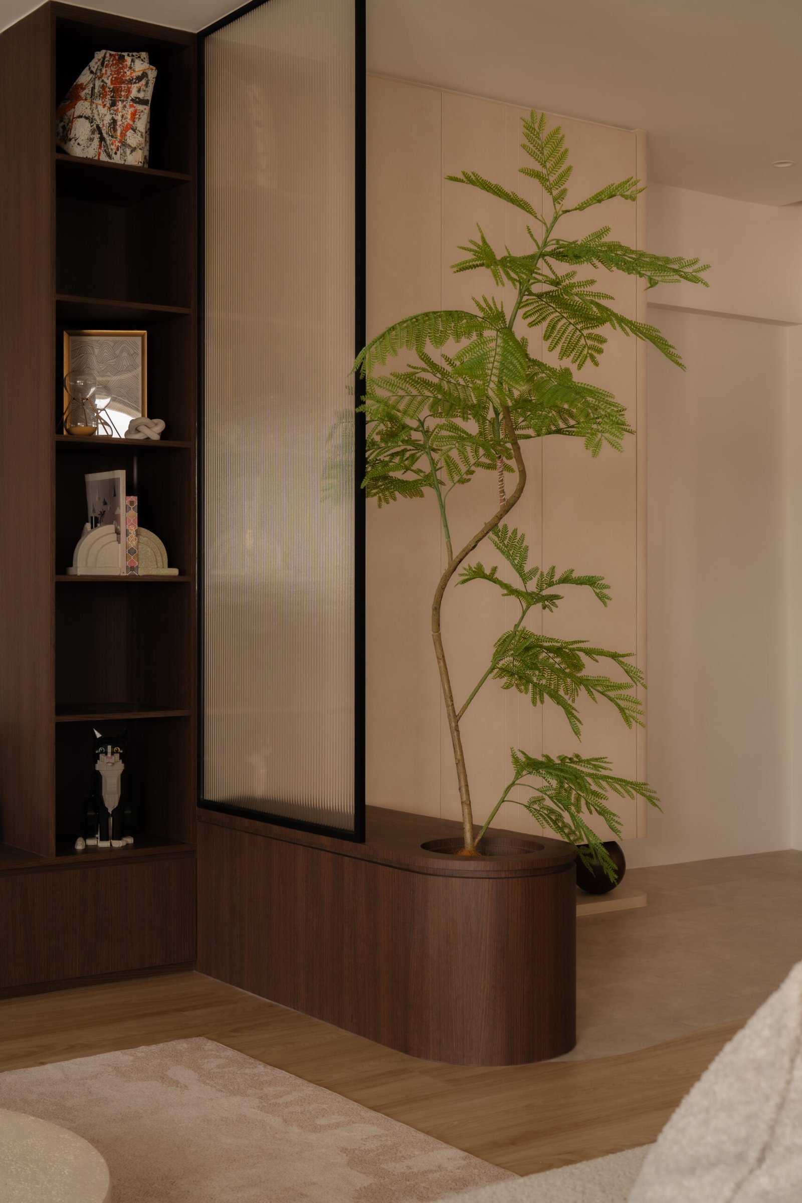 Designing their home meant embracing both worlds. The spaces needed to be kid-friendly and open, allowing the children to play freely, while also offering calm, serene corners inspired by the parents’ interests. Natural materials, soft lighting, and subtle textures create warmth and grounding throughout, while curves in the carpentry add both safety and softness, reflecting a careful attention to daily life.