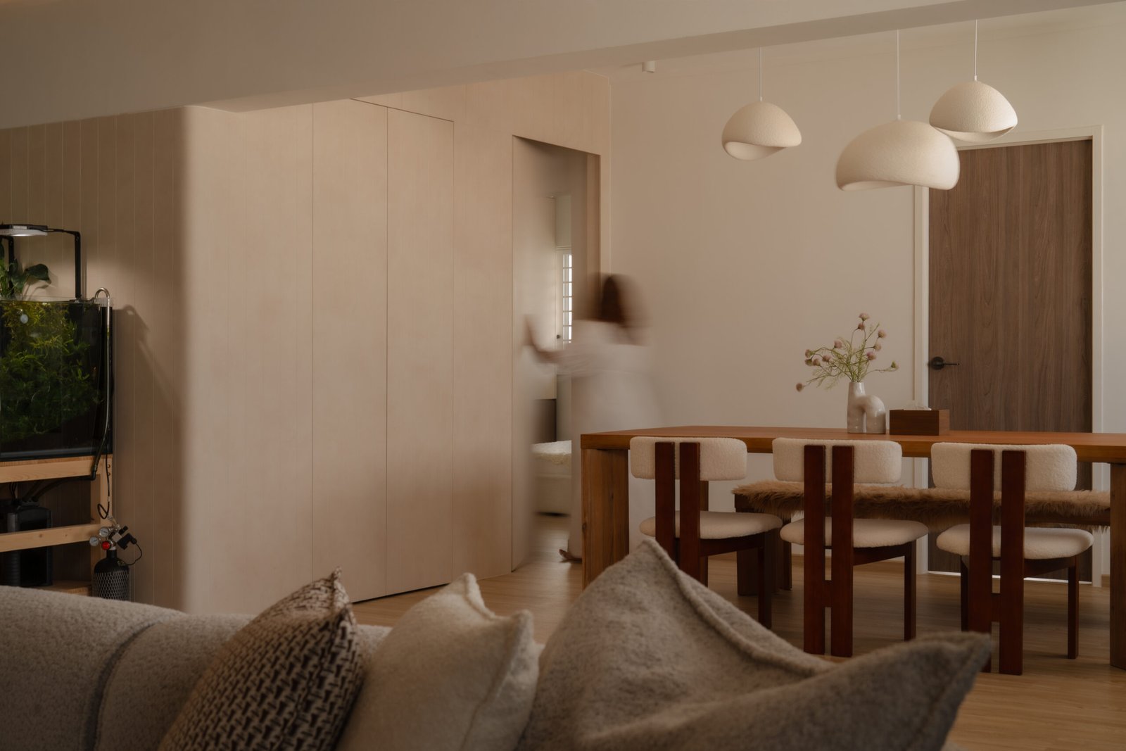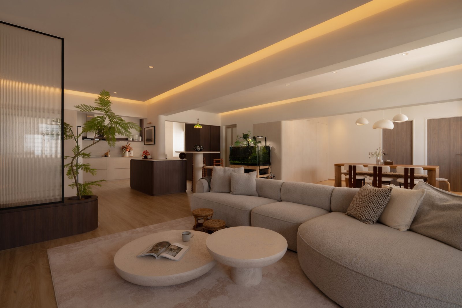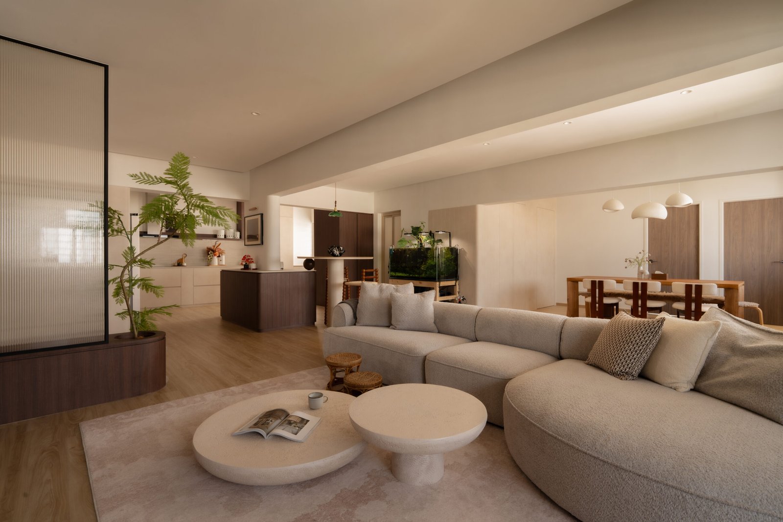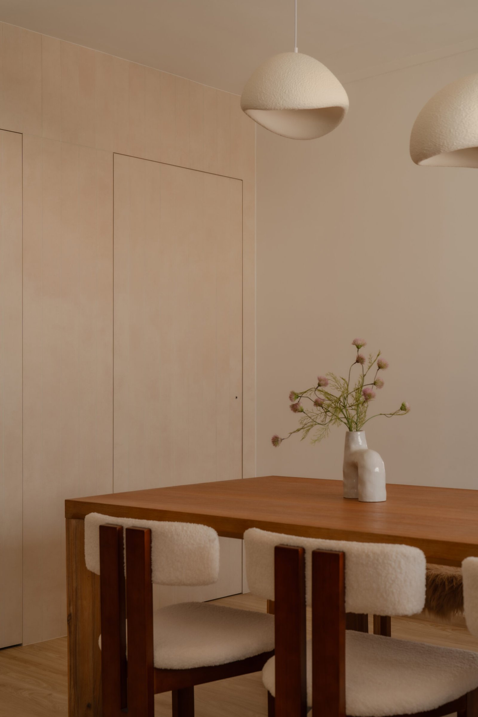 Designing their home meant embracing both worlds. The spaces needed to be kid-friendly and open, allowing the children to play freely, while also offering calm, serene corners inspired by the parents’ interests. Natural materials, soft lighting, and subtle textures create warmth and grounding throughout, while curves in the carpentry add both safety and softness, reflecting a careful attention to daily life.