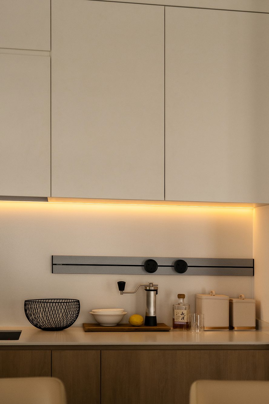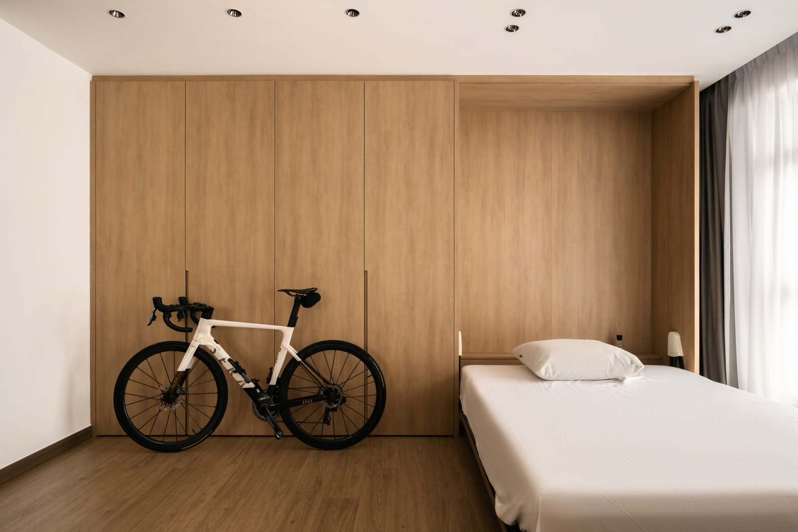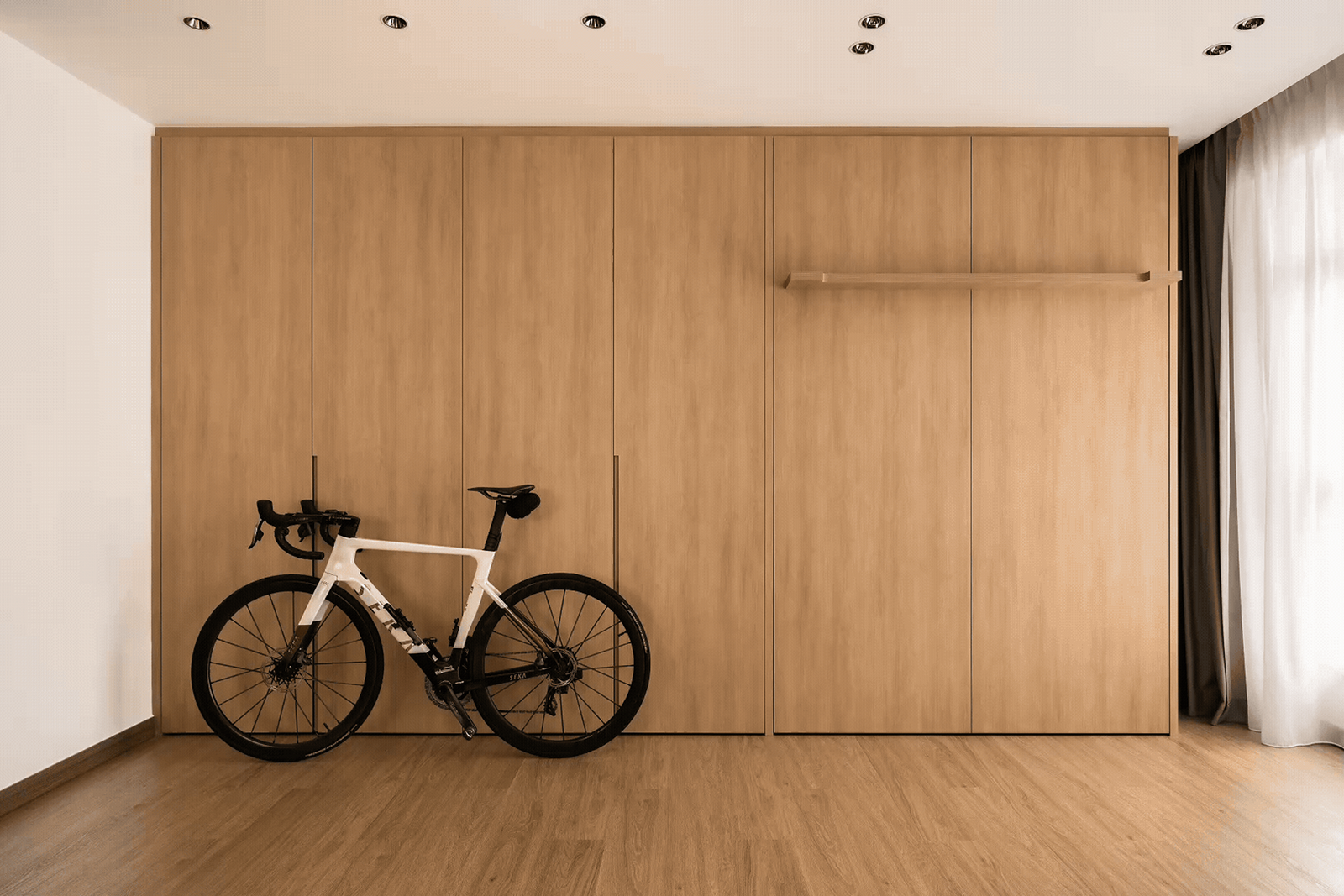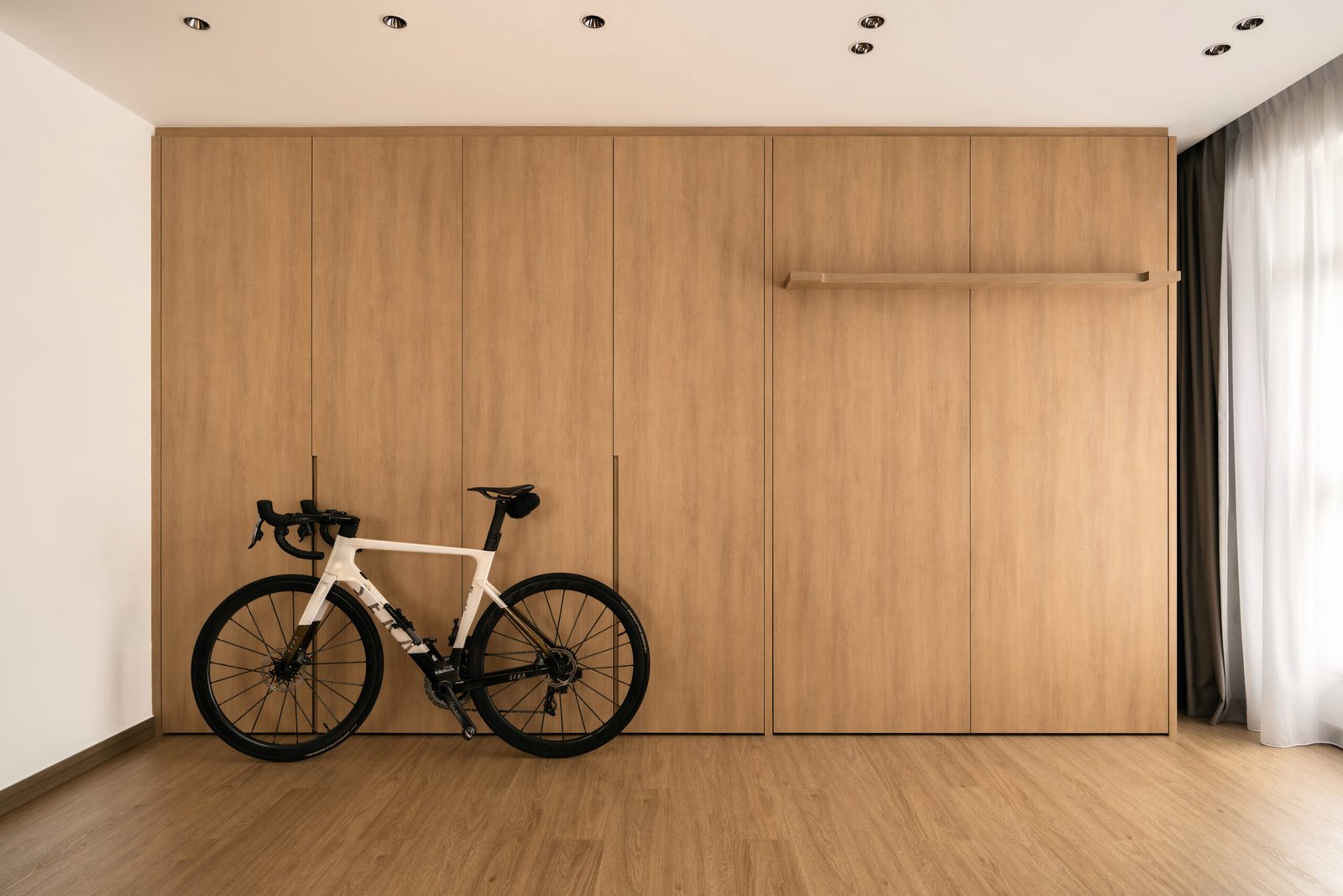 Upon entering, the layout immediately reveals the apartment’s openness and continuity. Smart technology manages lighting and curtains with ease, while a Murphy bed and a cleverly concealed cupboard for his bicycle transform the studio area into a flexible retreat. Even practical upgrades, like enhanced bathroom ventilation, were considered to ensure comfort without compromising the home’s clean, minimalist flow.
