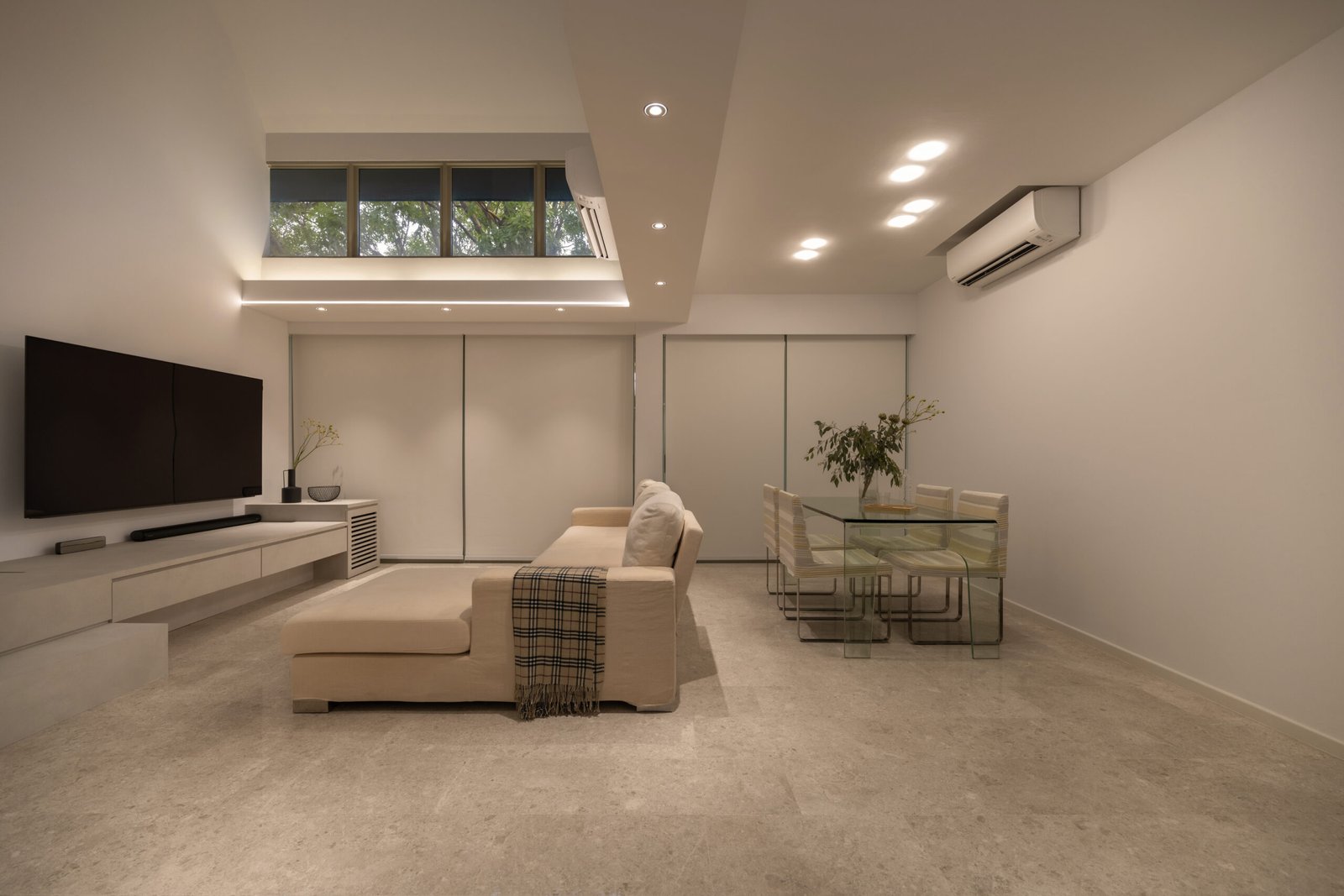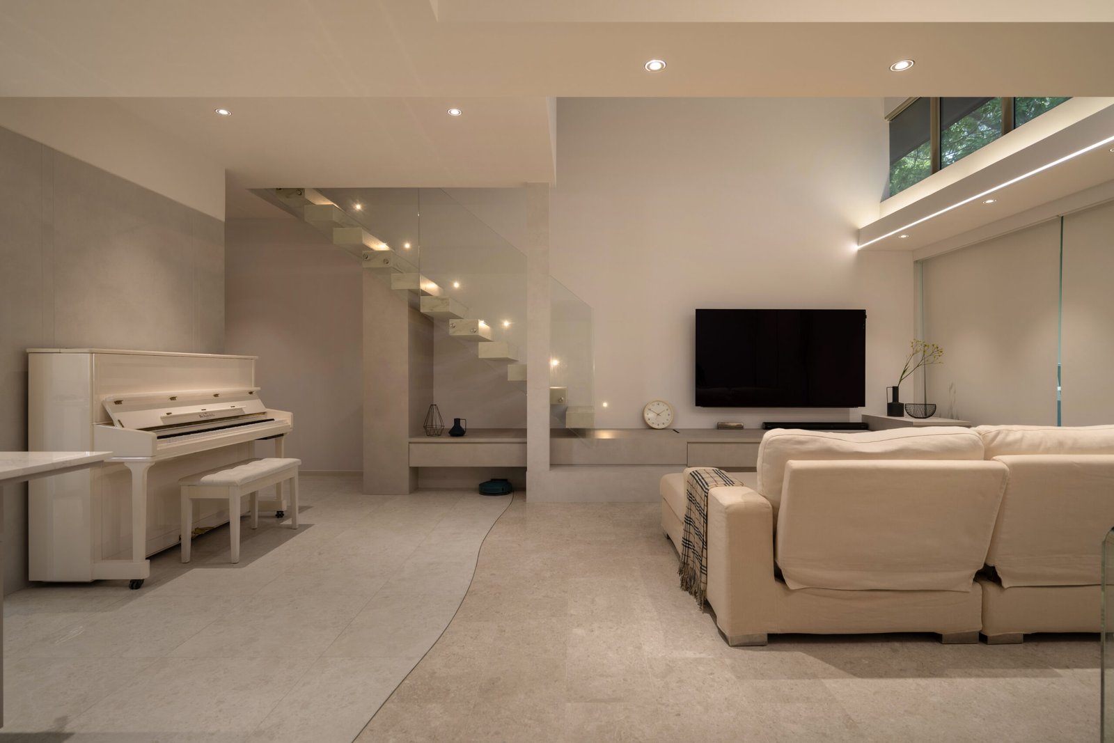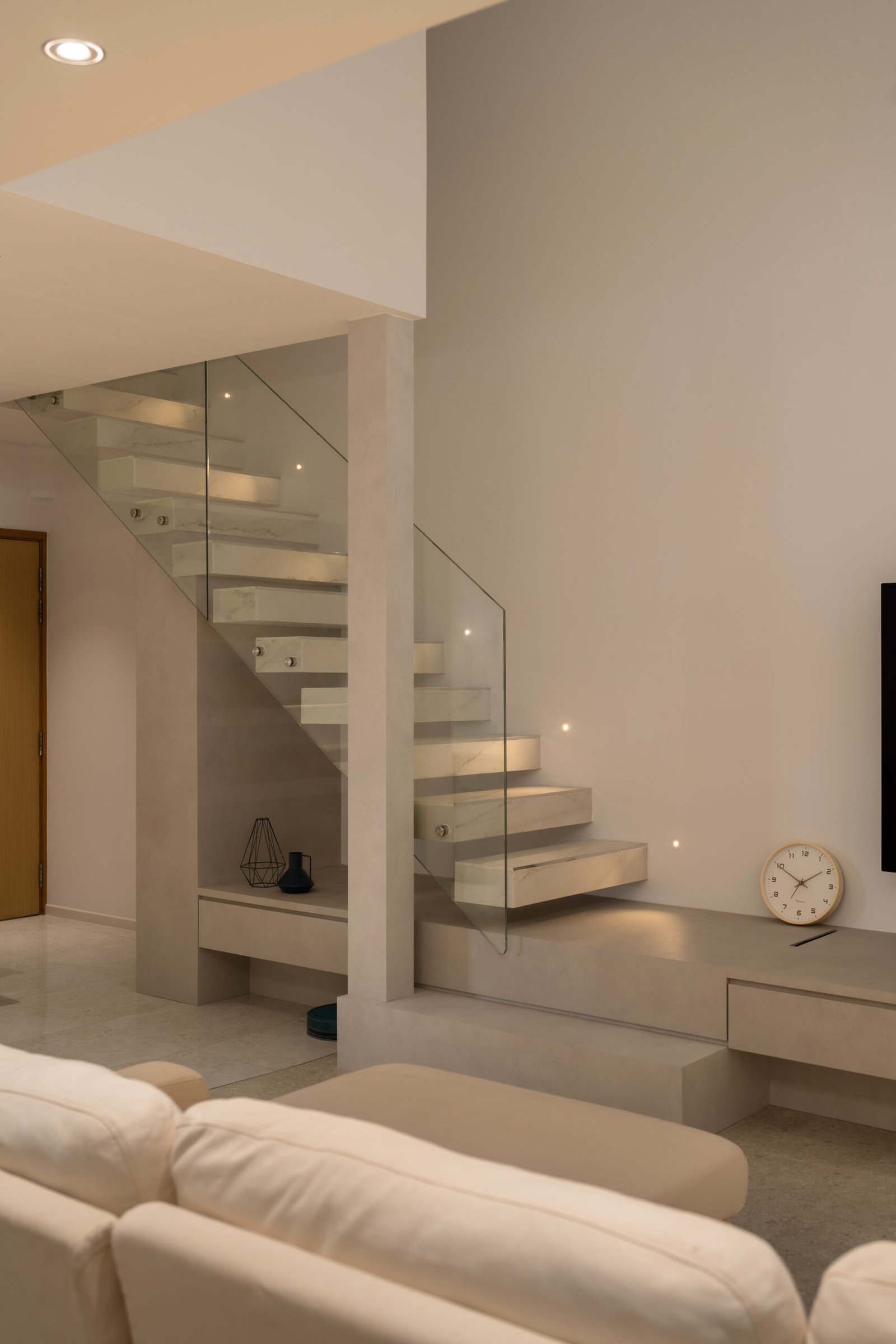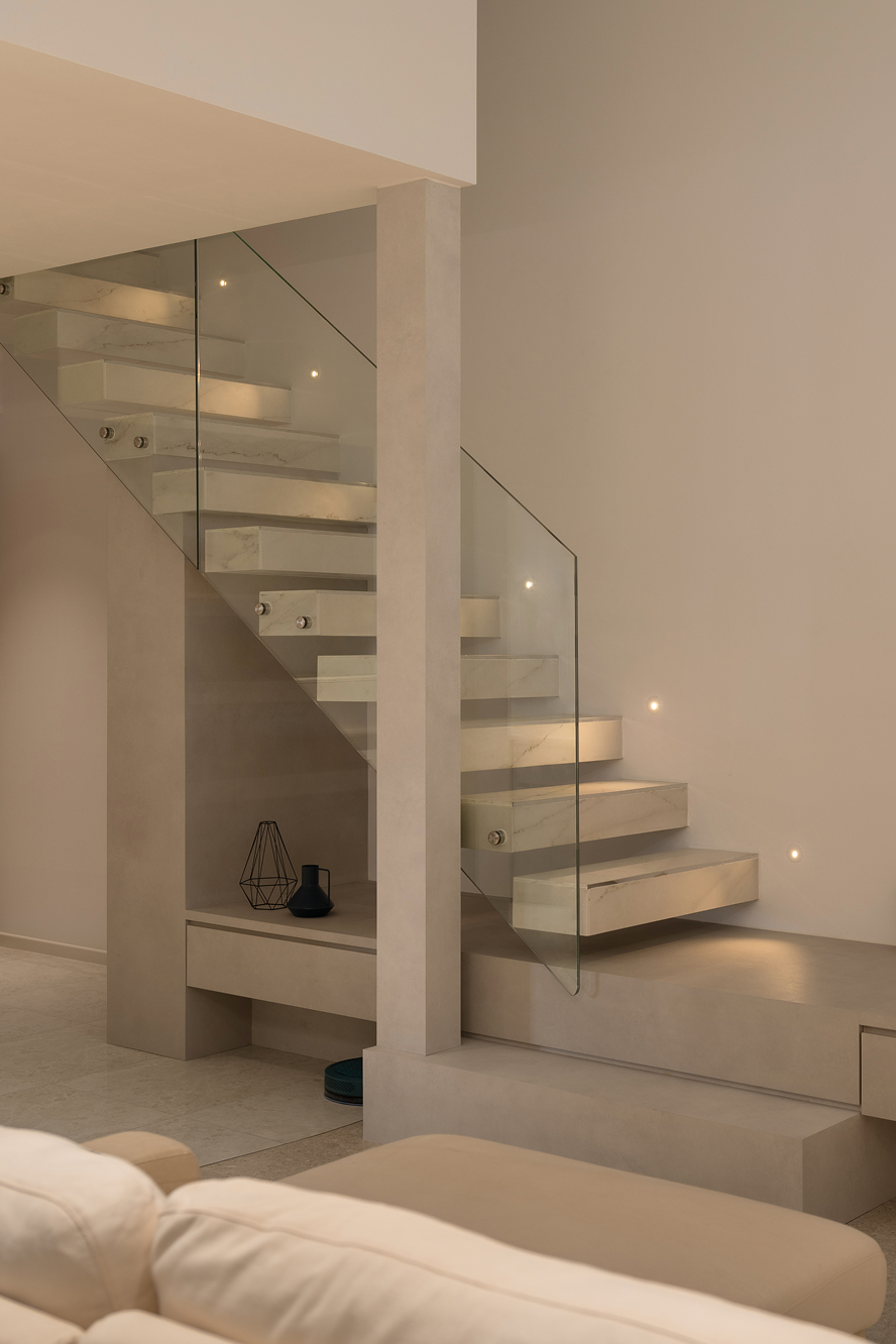 To accommodate their twins and a nanny, a loft was added upstairs, increasing the floor area and providing dedicated, functional rooms for everyone. The staircase became a centerpiece of the redesign. Relocated to maximise the double-height ceiling, it features glass railings and sleek Dekton surface steps, keeping the structure light and airy.