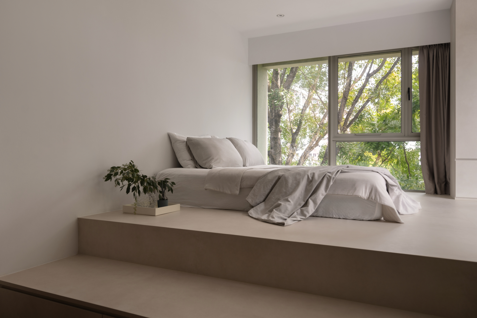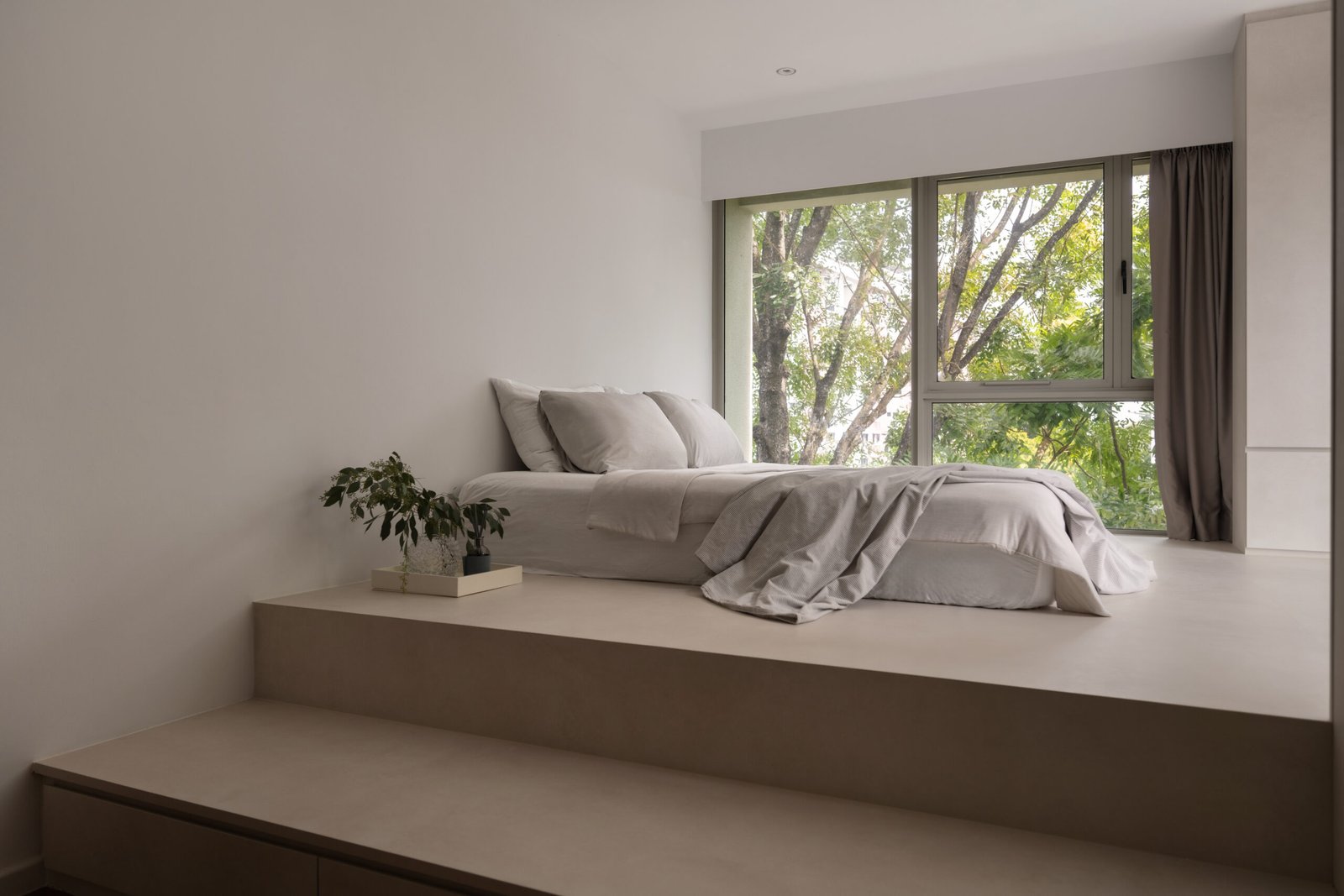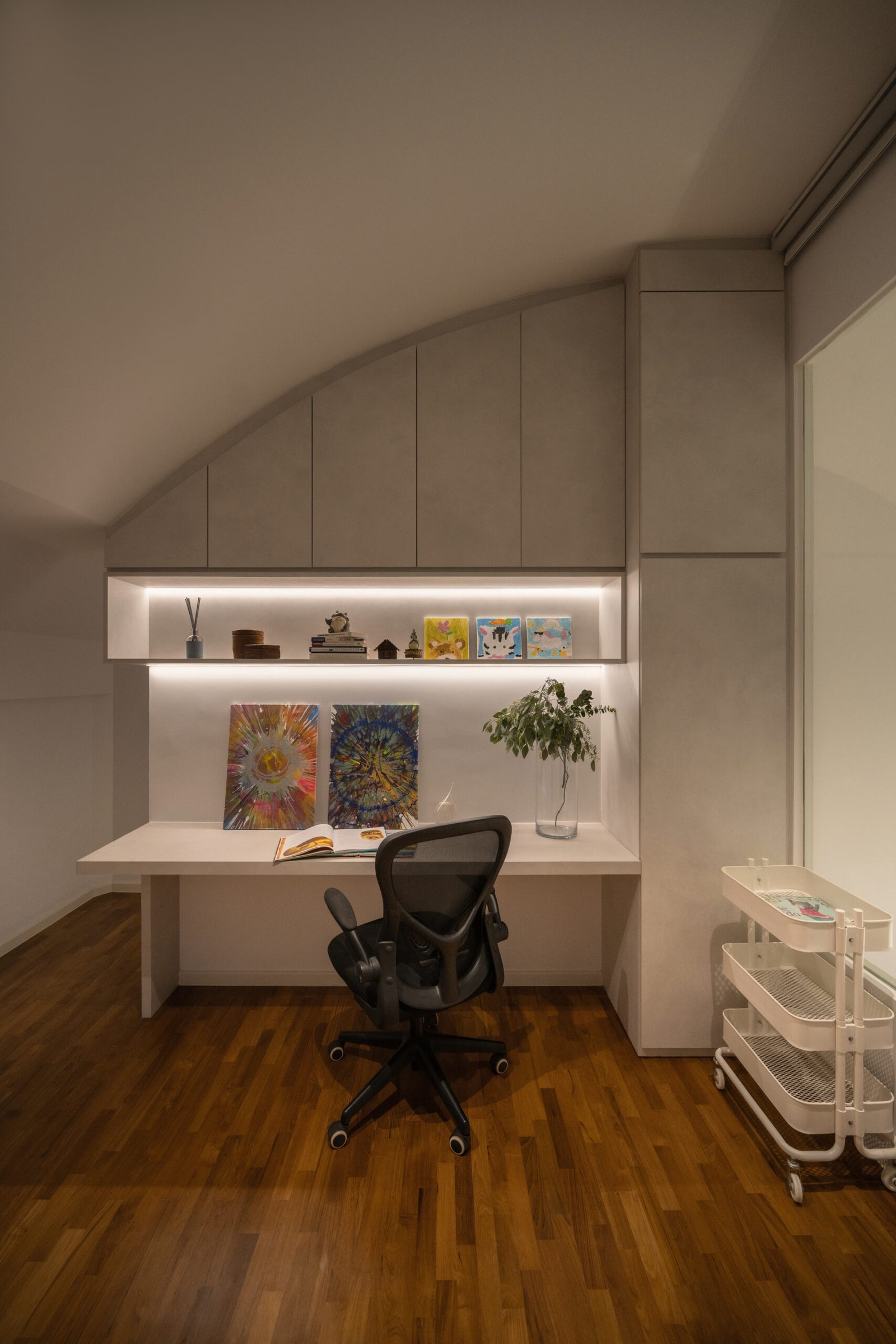 In the master bedroom, a two-tiered raised platform was designed to accommodate co-sleeping comfortably, with one tier specifically created for the twins’ mattresses. Warm beige laminates add a soothing, cosy atmosphere, making the room feel inviting for the whole family.