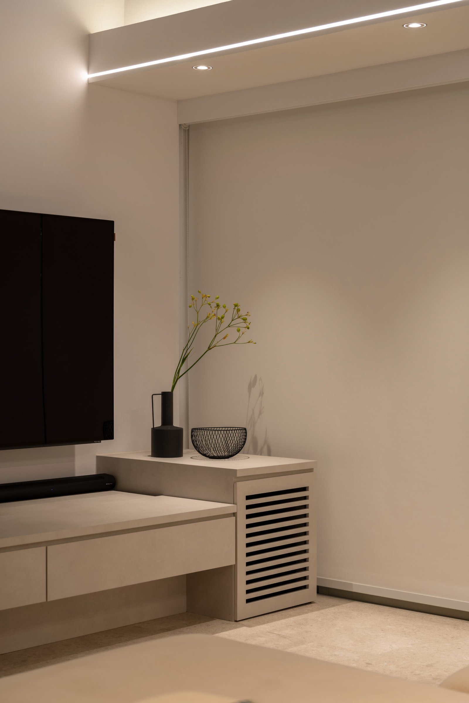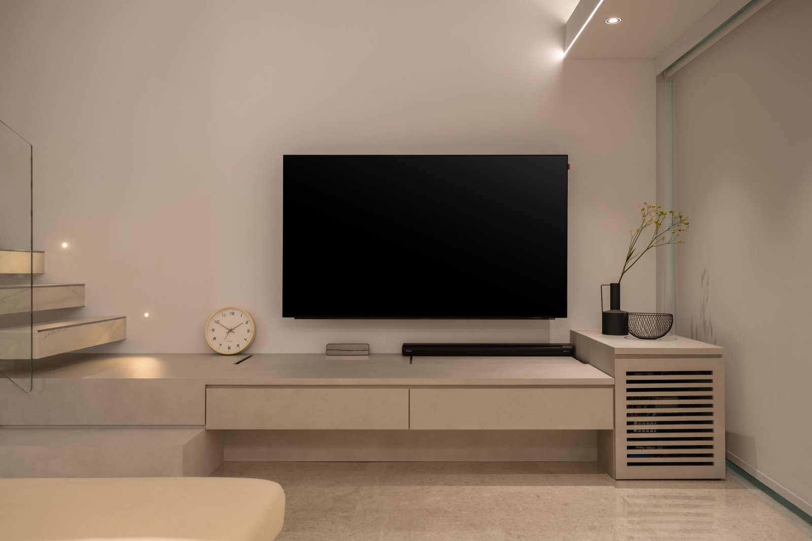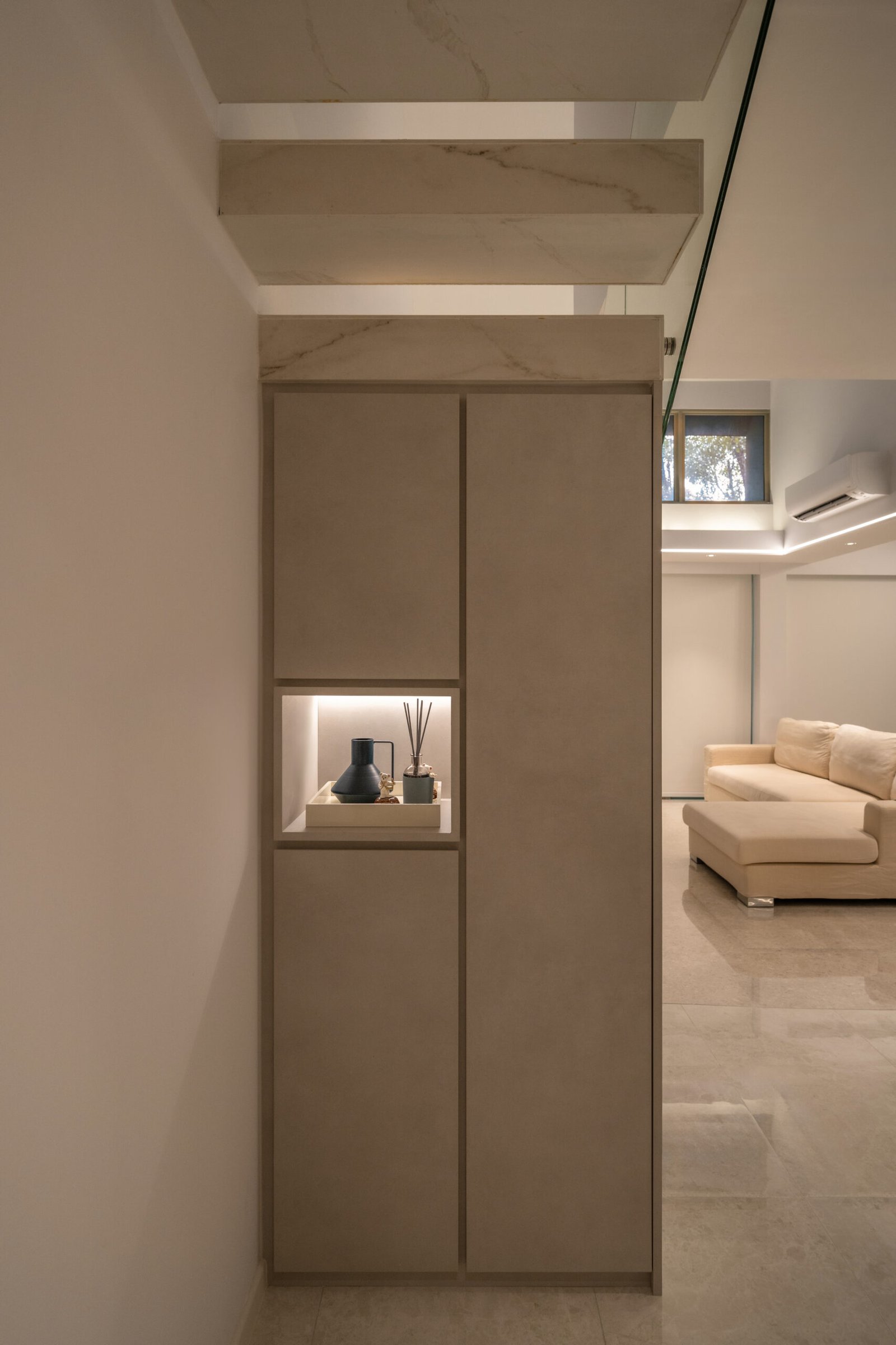 In the master bedroom, a two-tiered raised platform was designed to accommodate co-sleeping comfortably, with one tier specifically created for the twins’ mattresses. Warm beige laminates add a soothing, cosy atmosphere, making the room feel inviting for the whole family.