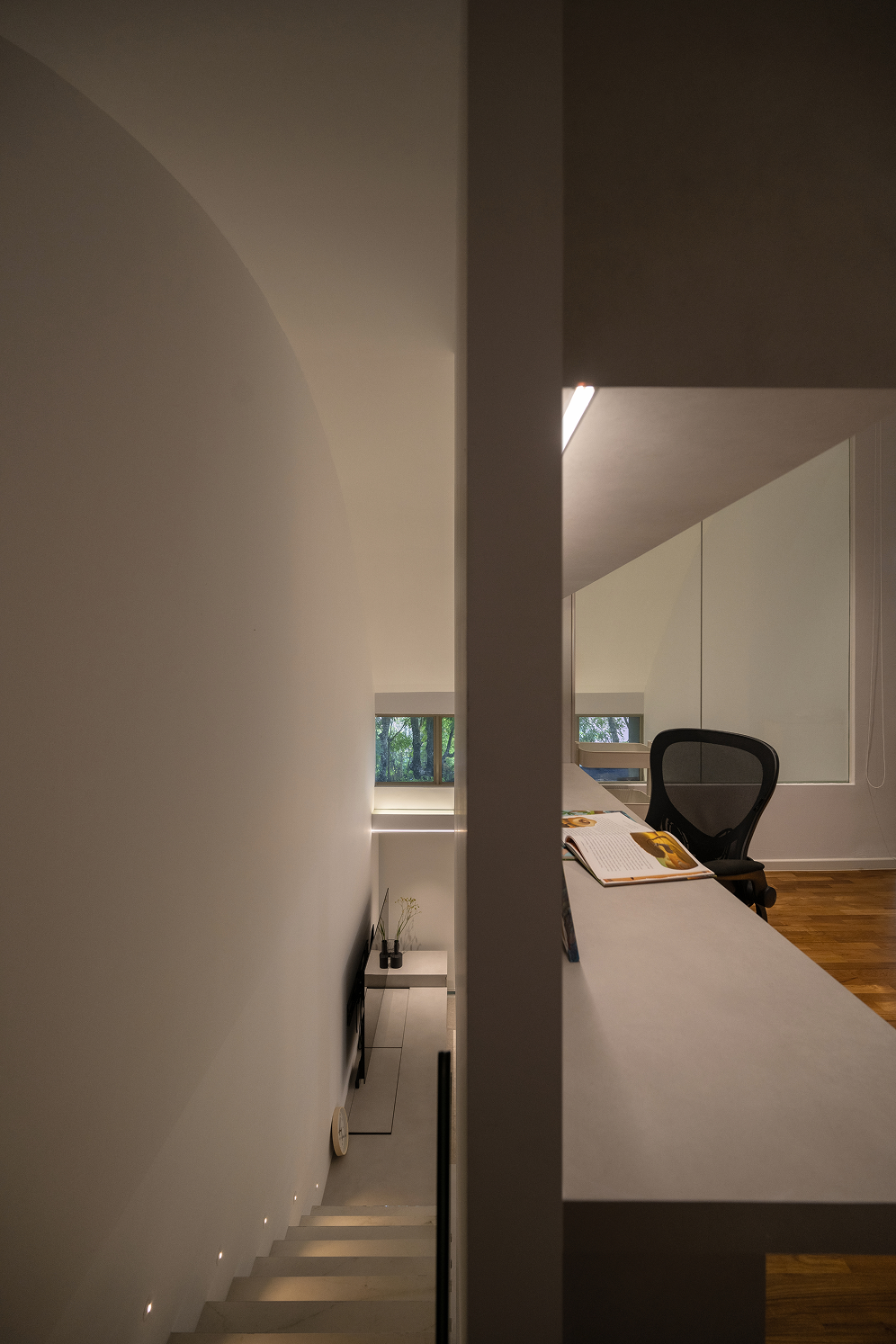 Above, the loft study offers a peaceful retreat for the homeowners, with strategically placed windows providing a clear view of the twins below. Microcement laminate continues the neutral palette from the first floor, maintaining a cohesive and calming aesthetic throughout the home.