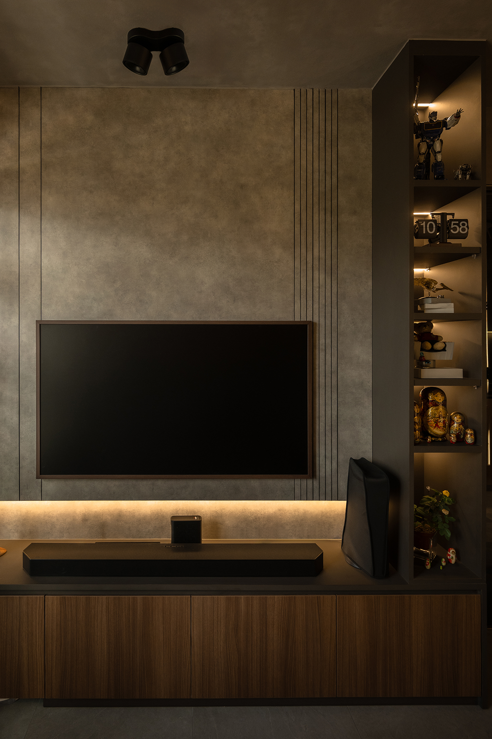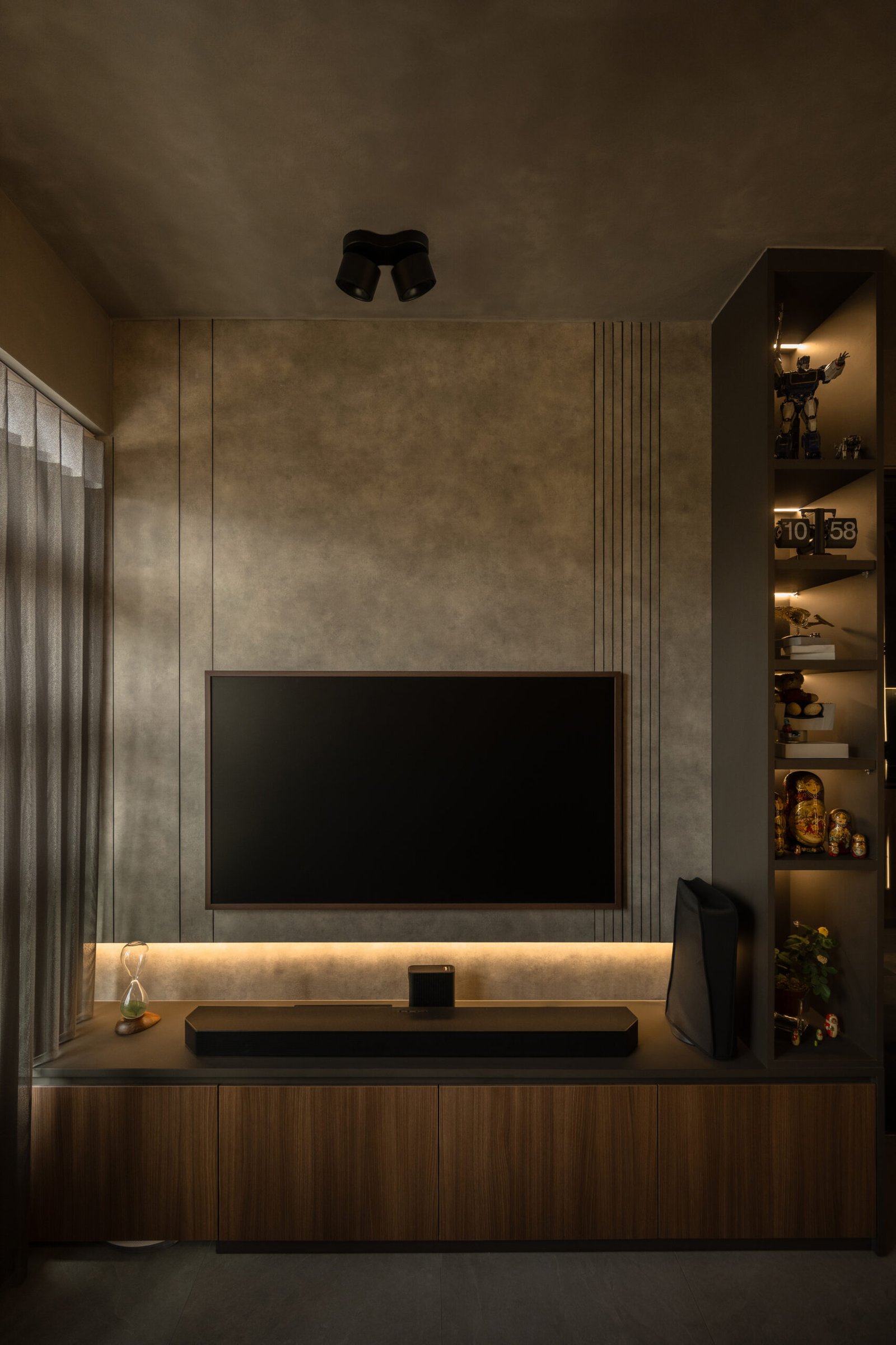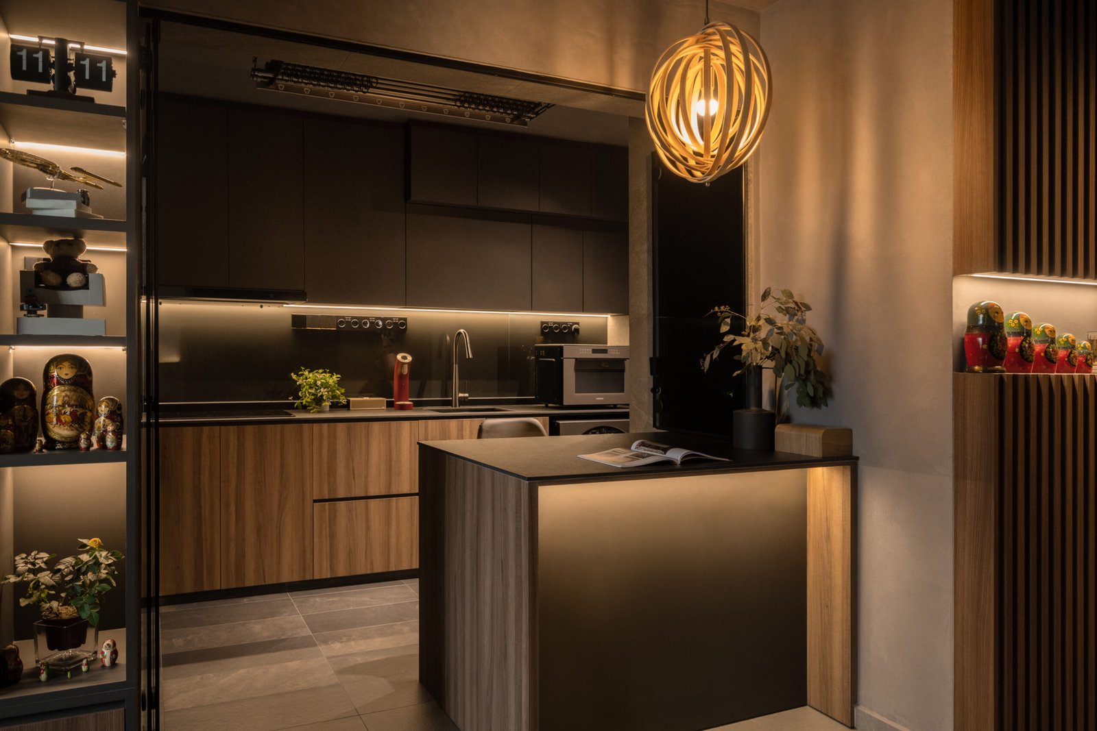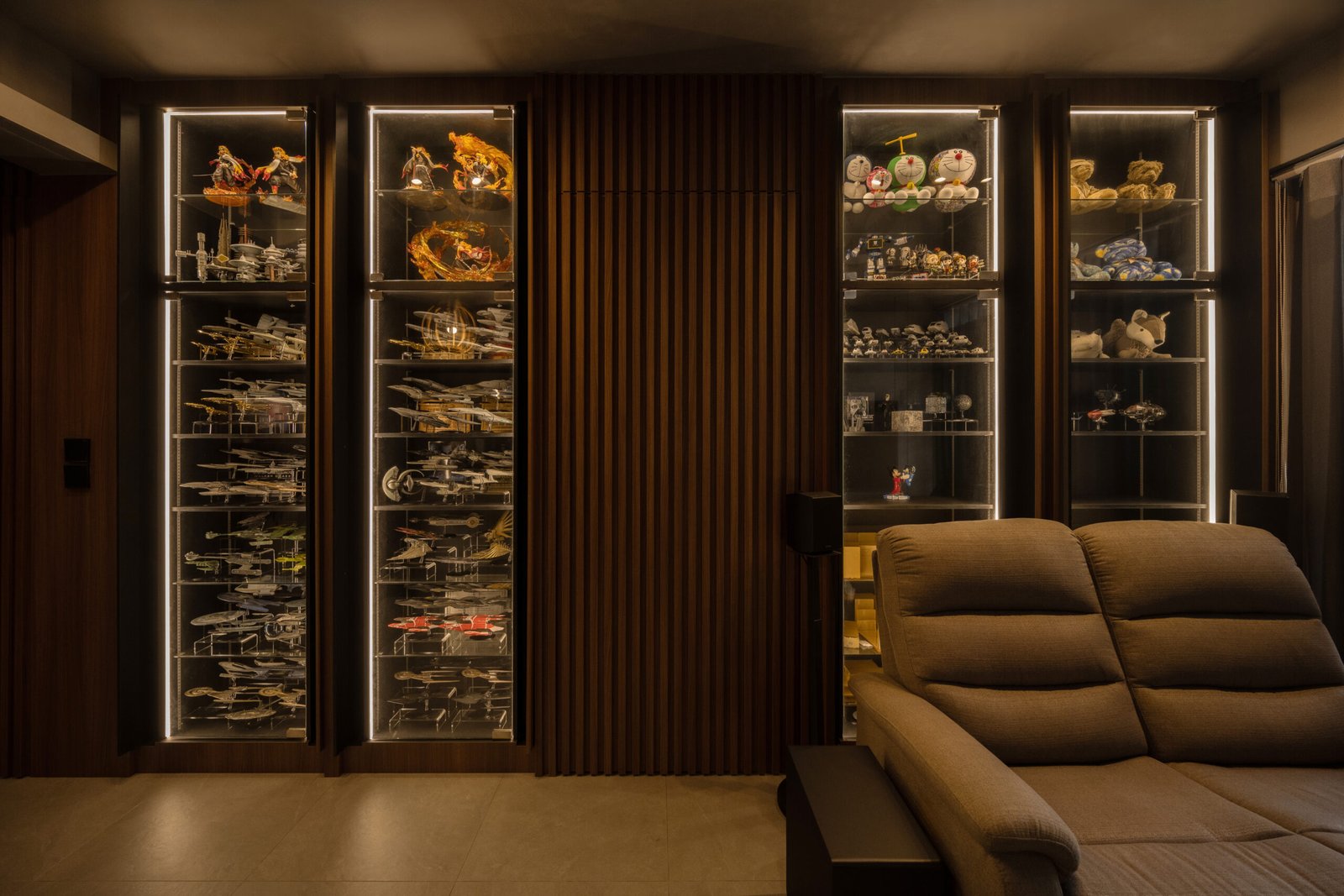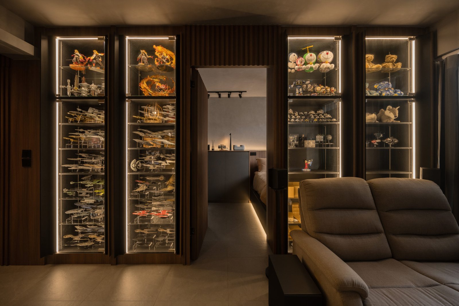 The homeowner’s love for collecting also shines through. A special corner was carved out for his Star Trek memorabilia and other treasures but with a twist. Pocket doors allow him to showcase his collection proudly when friends visit, or keep it neatly tucked away when he wants the space to feel calm and uncluttered.