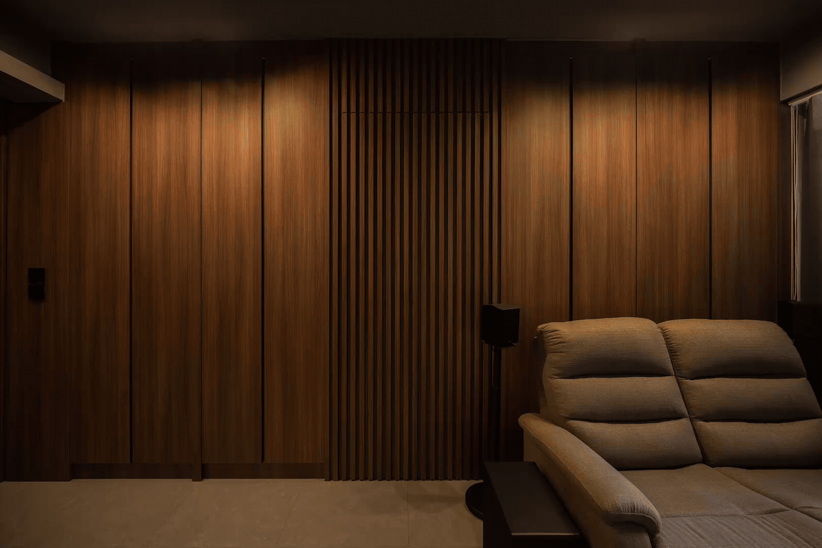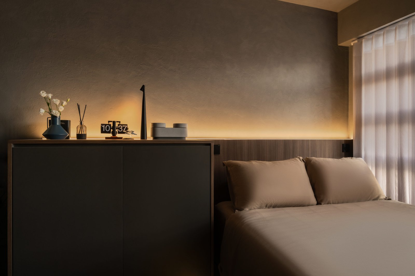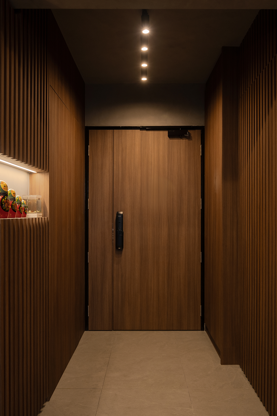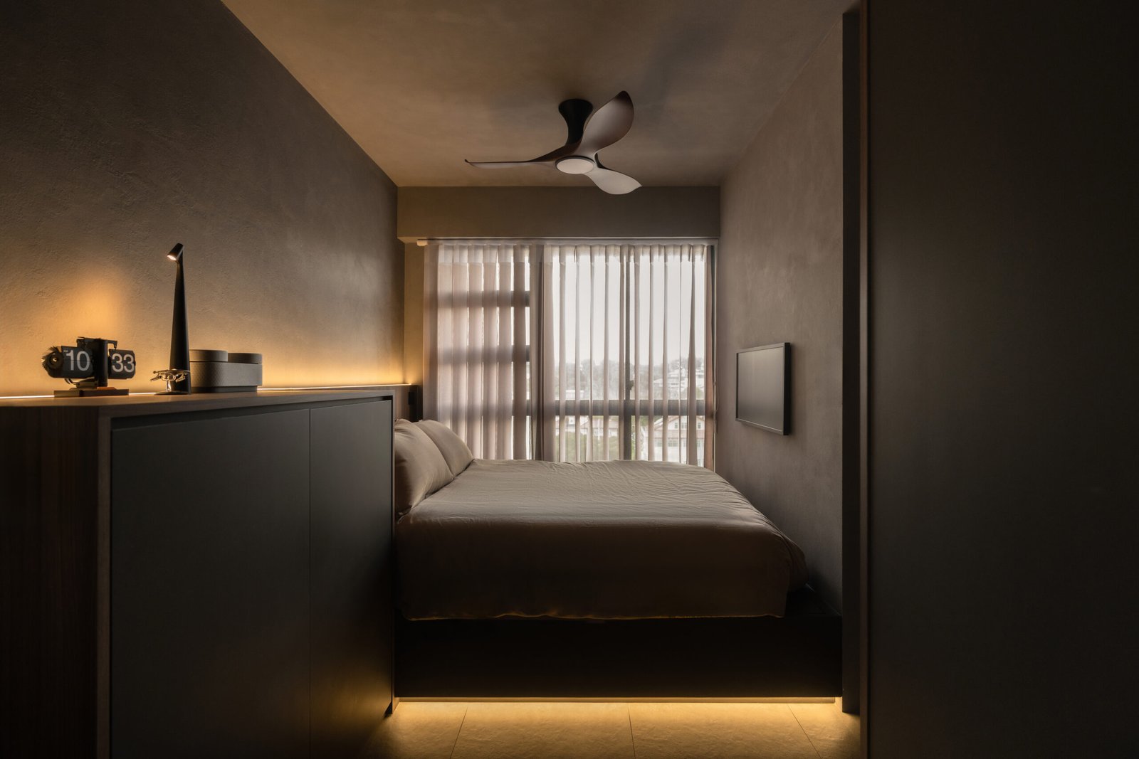 Storage was a top priority, and every detail was designed with it in mind to ensure this two-room home still feels open and spacious. From the cleverly hidden bathroom and bomb shelter designed to blend seamlessly into the foyer to the concealed doors that keep the walkway open, polished, and seamless, every detail was crafted to make the home feel clutter-free. In the bedroom, the platform bed continues this approach, offering discreet storage while keeping the look minimal and practical.