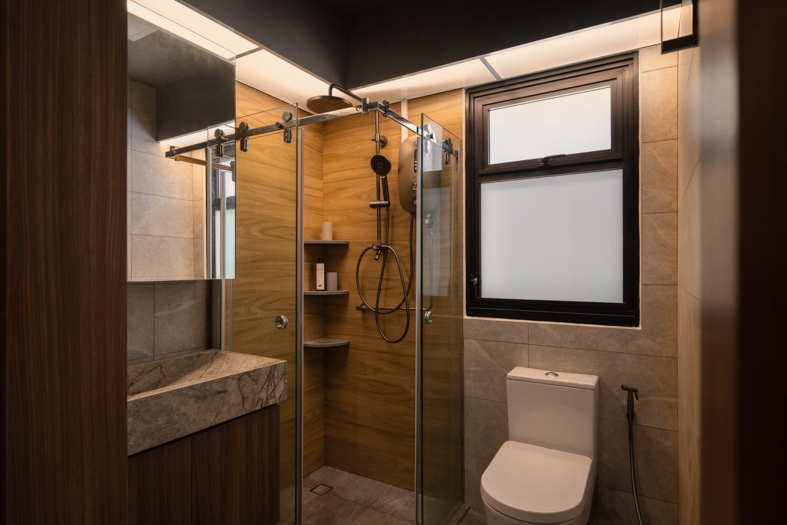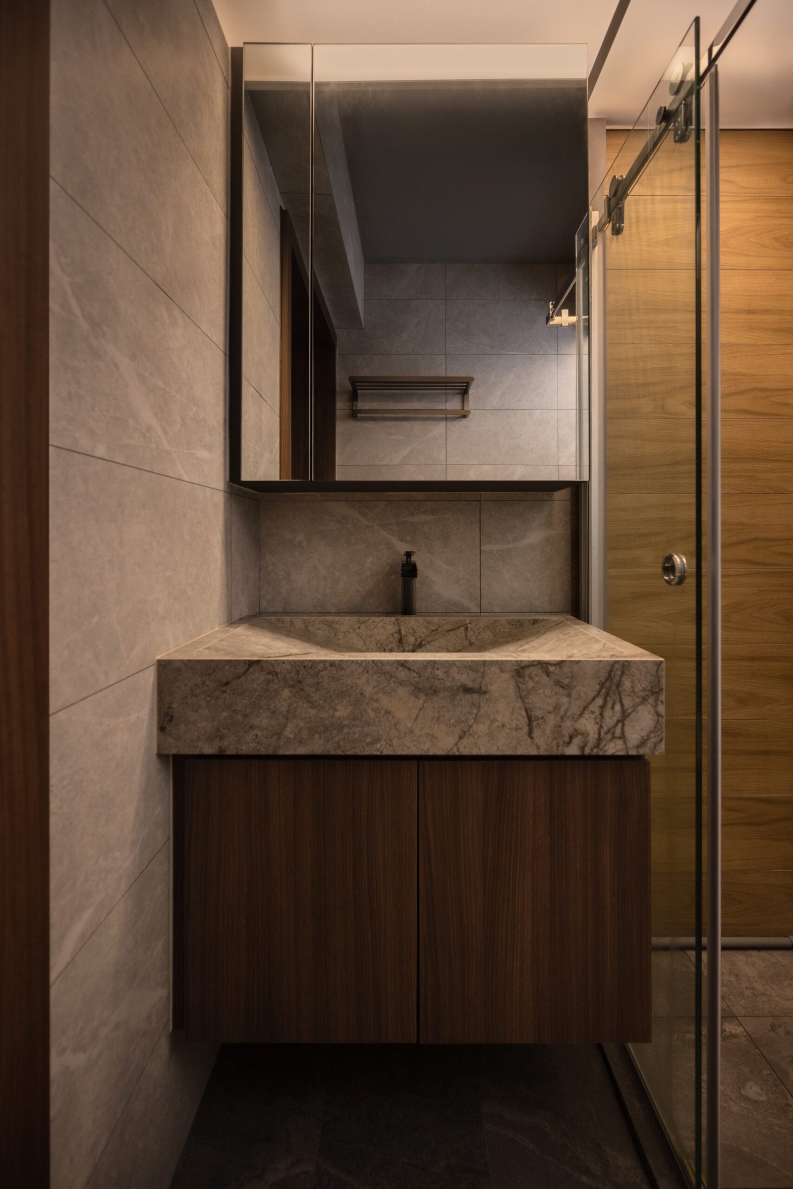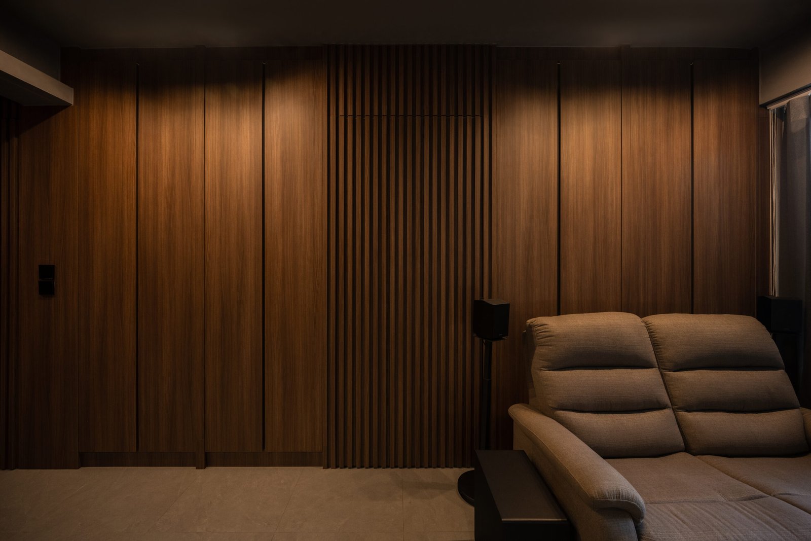 Storage was a top priority, and every detail was designed with it in mind to ensure this two-room home still feels open and spacious. From the cleverly hidden bathroom and bomb shelter designed to blend seamlessly into the foyer to the concealed doors that keep the walkway open, polished, and seamless, every detail was crafted to make the home feel clutter-free. In the bedroom, the platform bed continues this approach, offering discreet storage while keeping the look minimal and practical.
