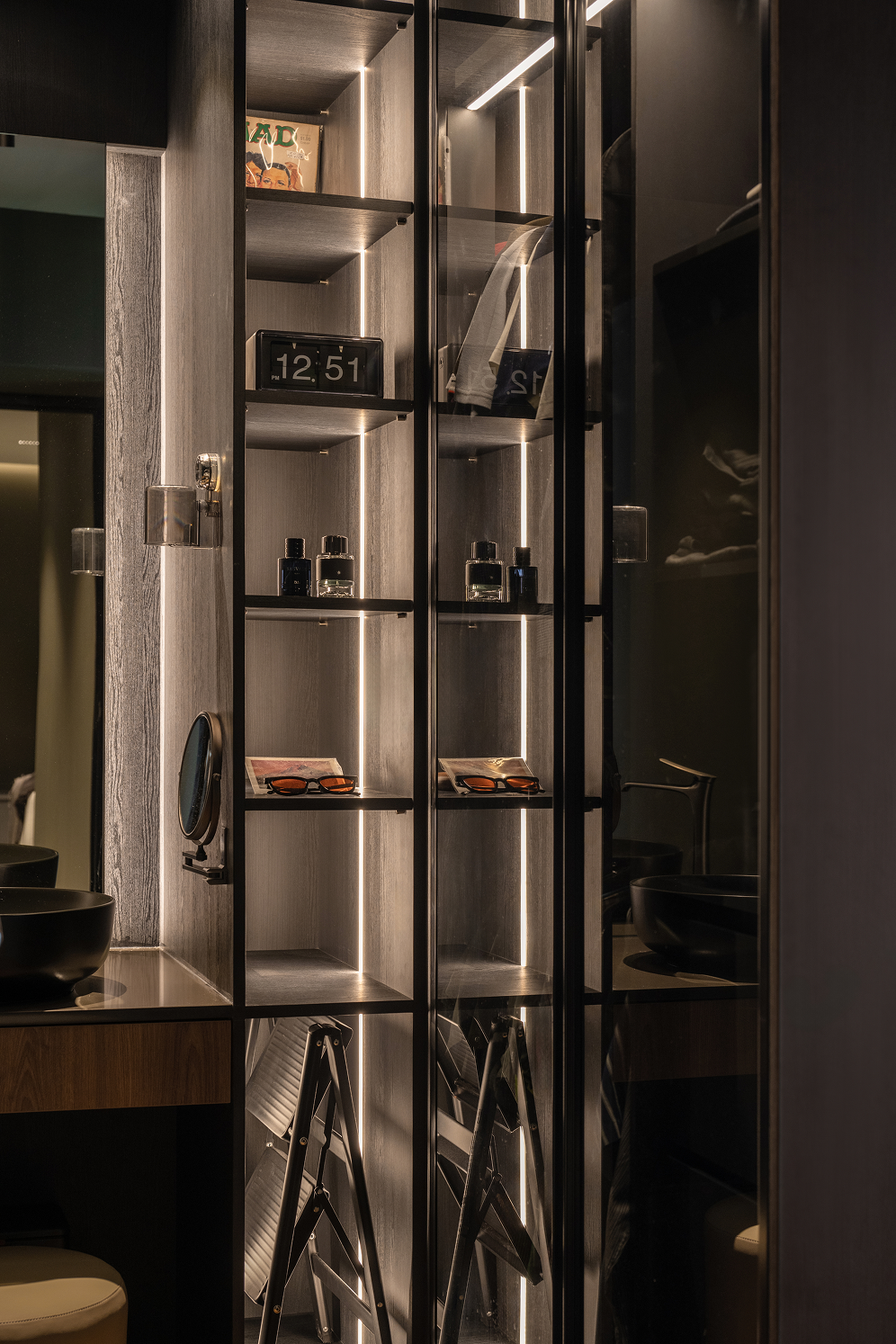 The kitchen, a long narrow stretch, was streamlined to suit the owner’s lifestyle. Although cooking isn’t a daily routine, generous countertop space was still essential. A concealed appliances tower was introduced, allowing bulky appliances to be hidden away and pulled out only when needed.
