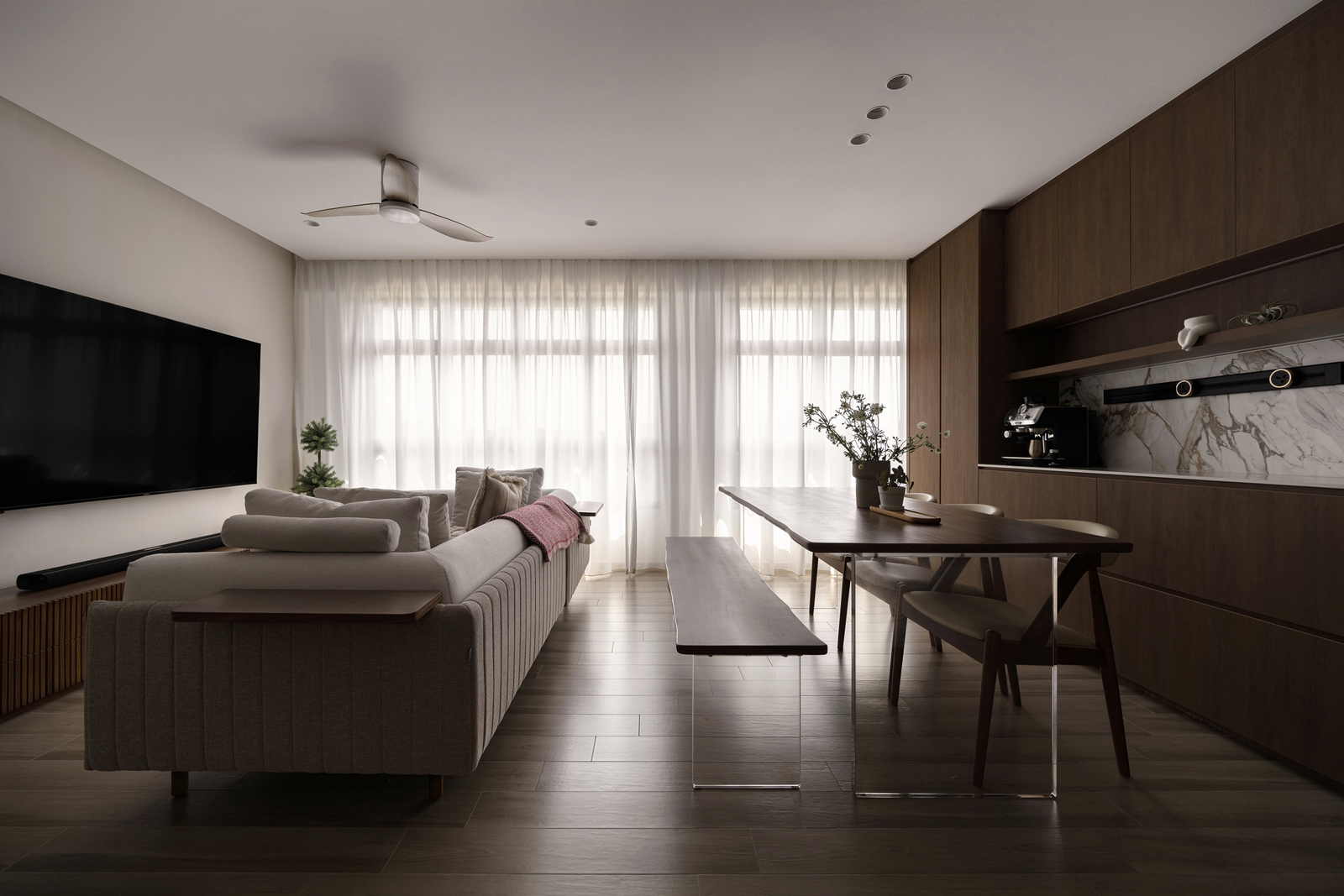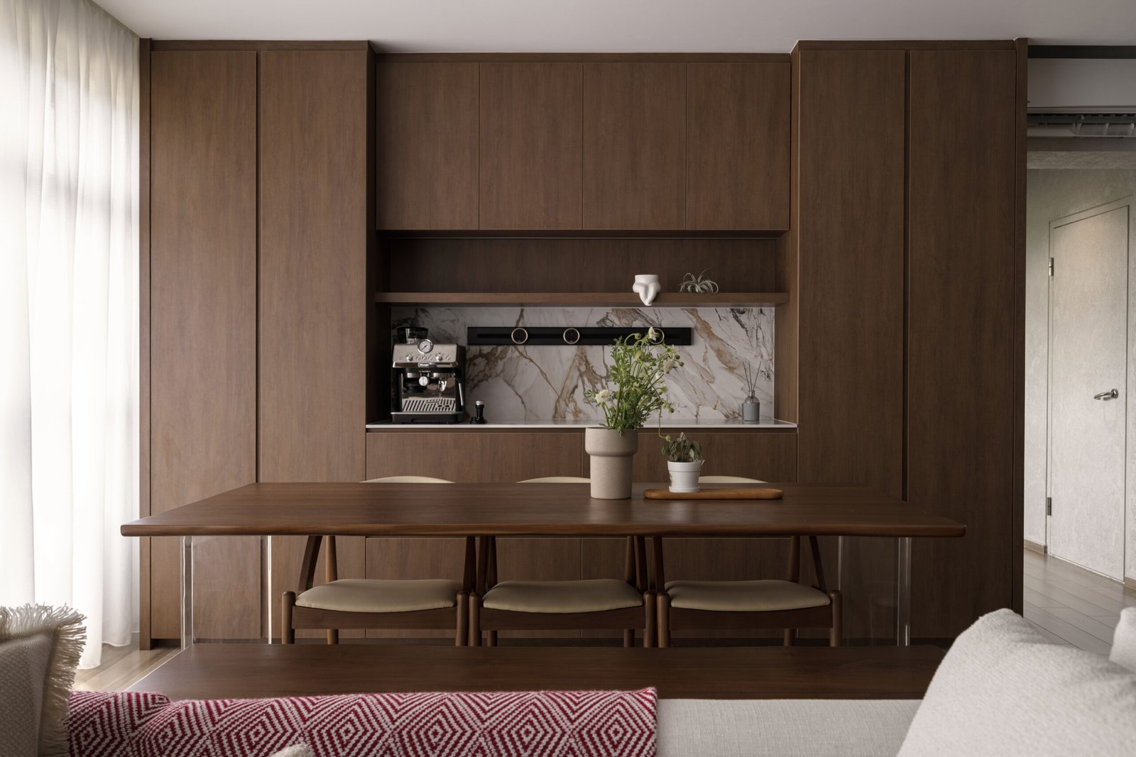 The living area sets the tone, effortlessly combining the TV lounge, dining space with a dry pantry, and a kitchen island into a cohesive, functional hub. Neutral tones, warm wood with marble finishes create a serene backdrop, while the TV corner offers a cosy spot to unwind or catch up with friends. The kitchen island naturally draws people together, whether for casual conversation or serving drinks and snacks, while the dry pantry behind the dining area keeps essentials from the coffee machine to curated tableware within easy reach, making entertaining effortless.
