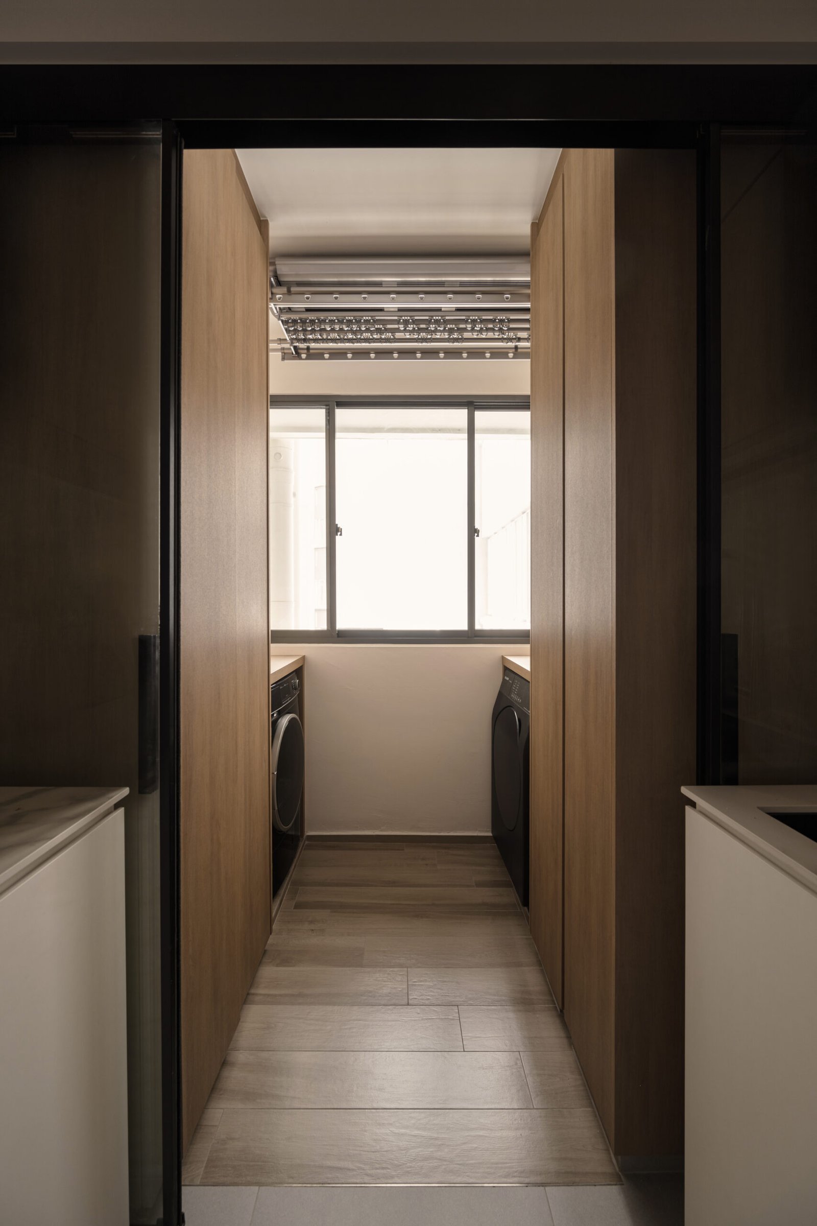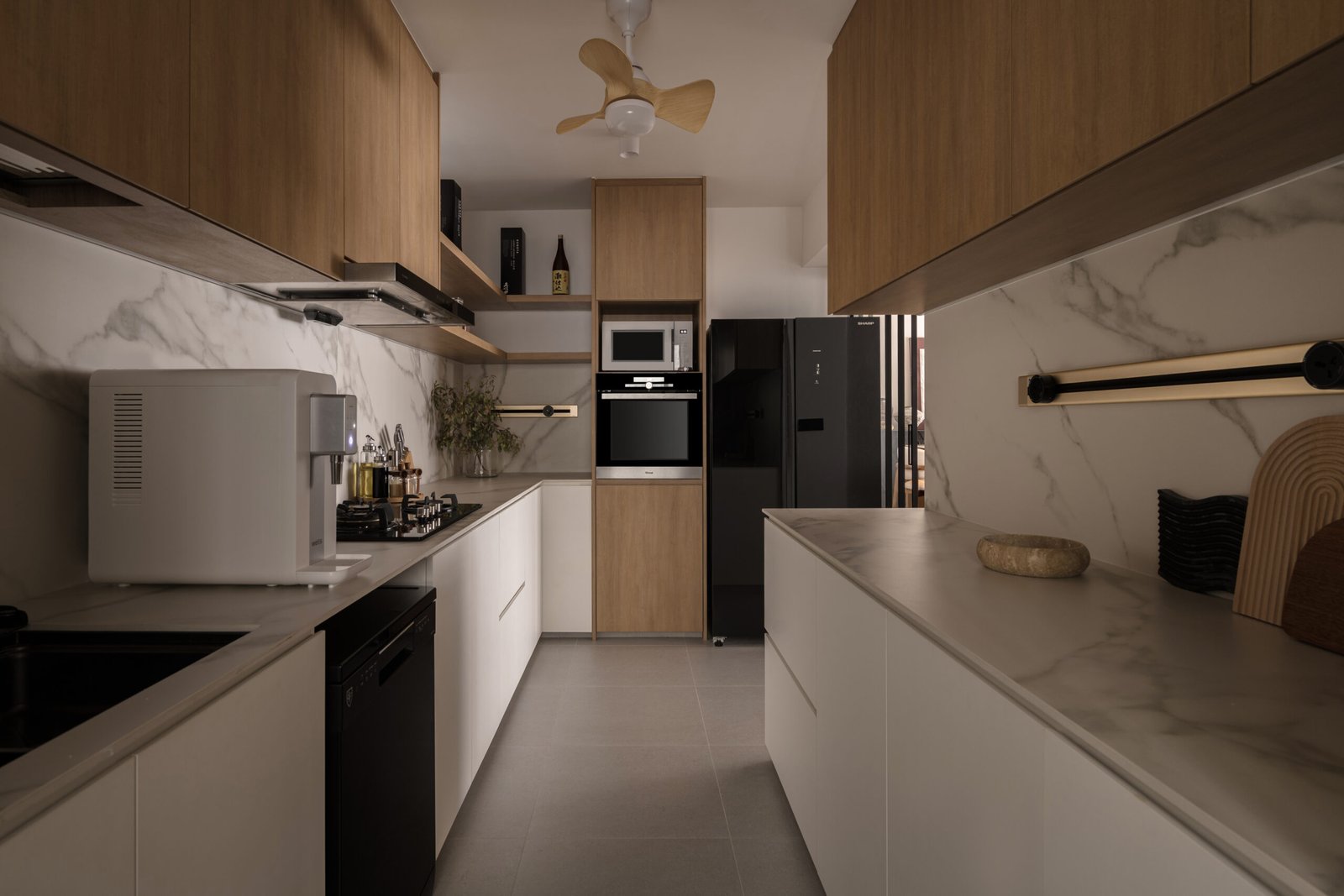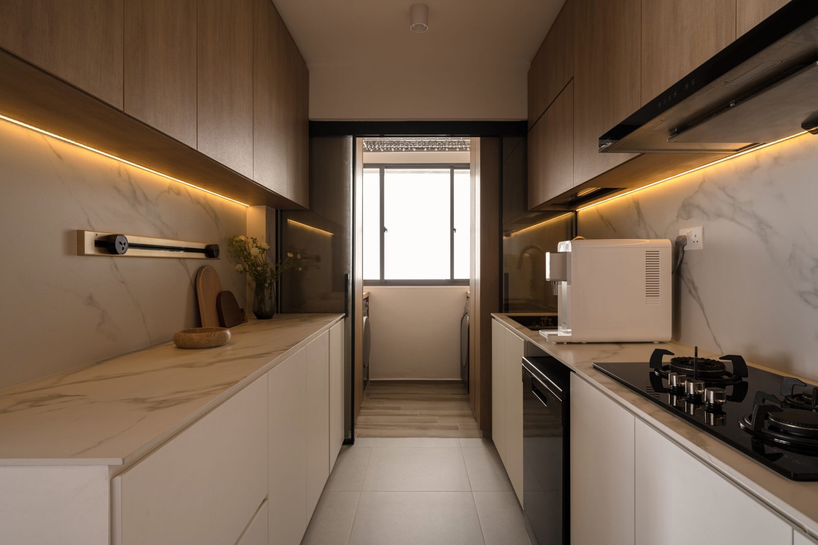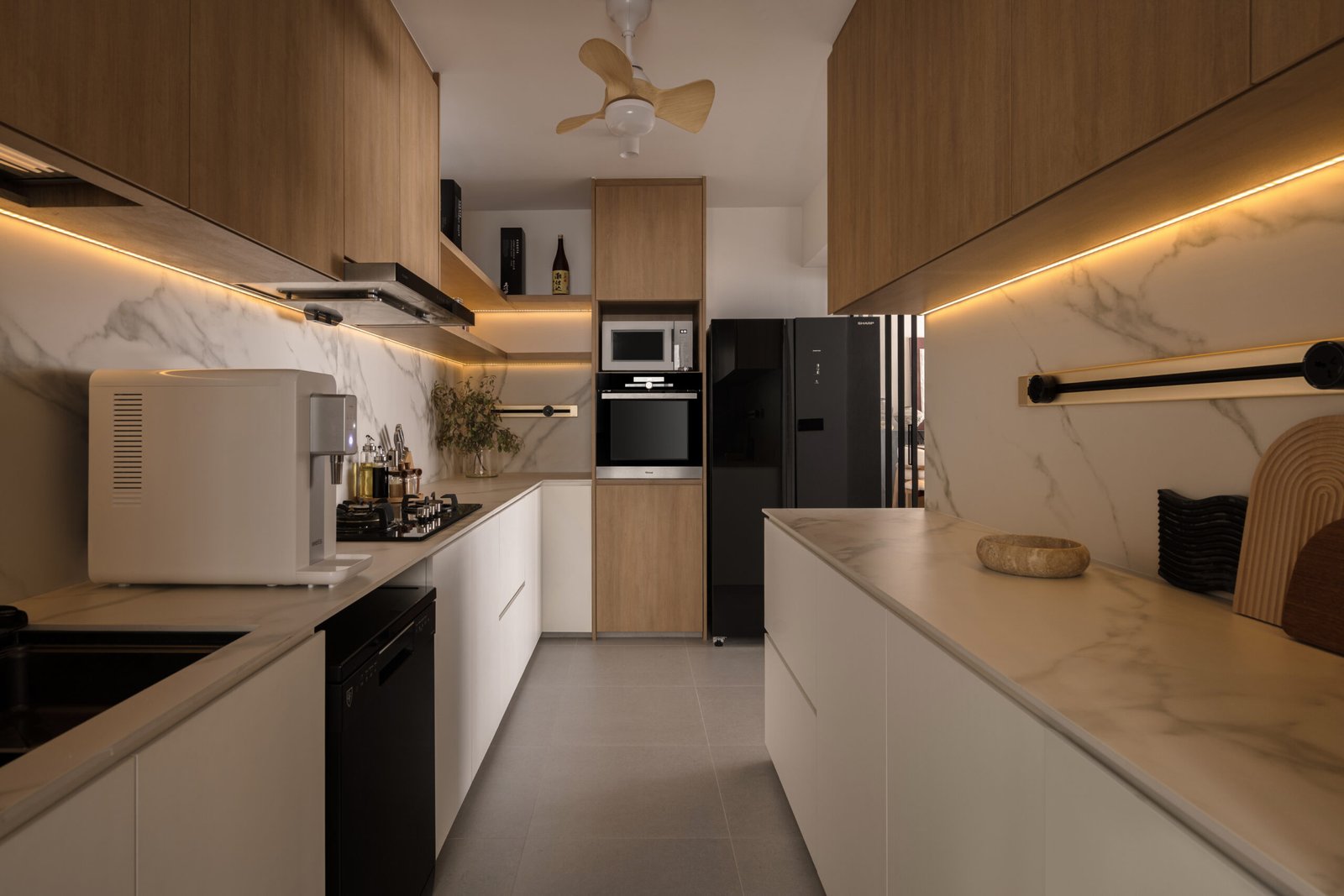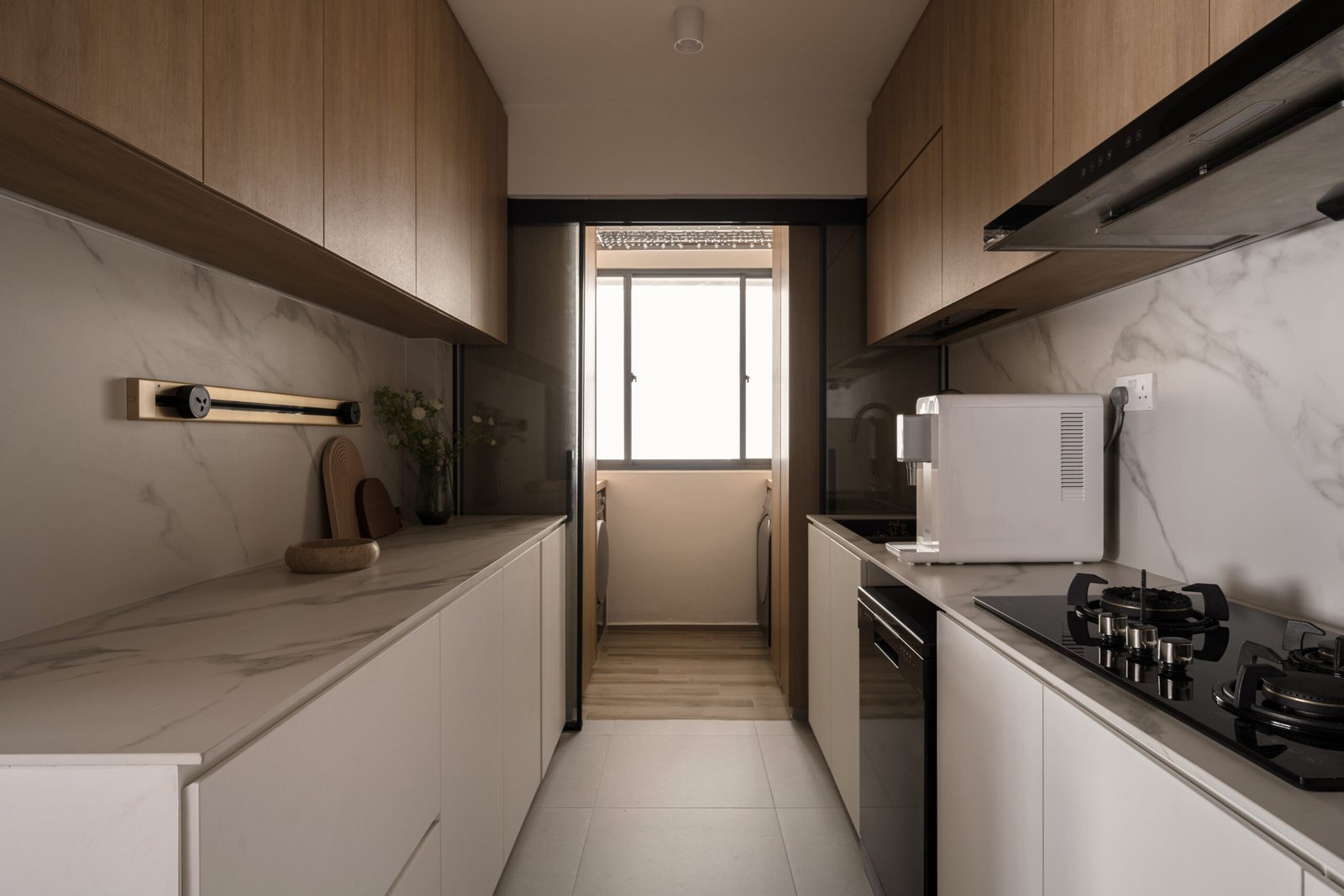 Lighter wood tones paired with white laminates brighten the kitchen, while generous countertops provide plenty of space for cooking, meal prep, and casual gatherings. A sliding glass door separates it from the living area, containing cooking smells while still letting natural light stream in, keeping the space airy, welcoming, and connected to the rest of the home.
