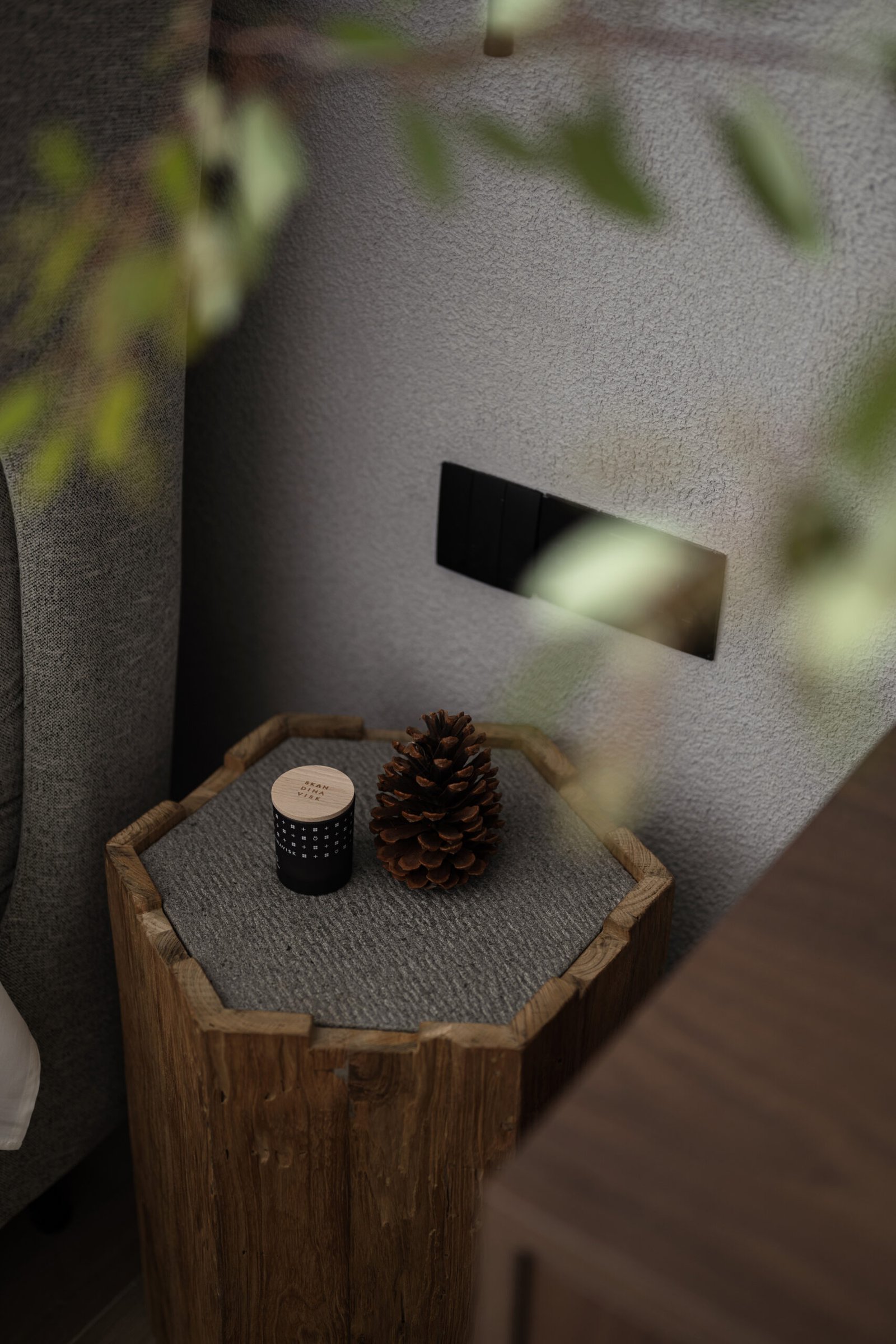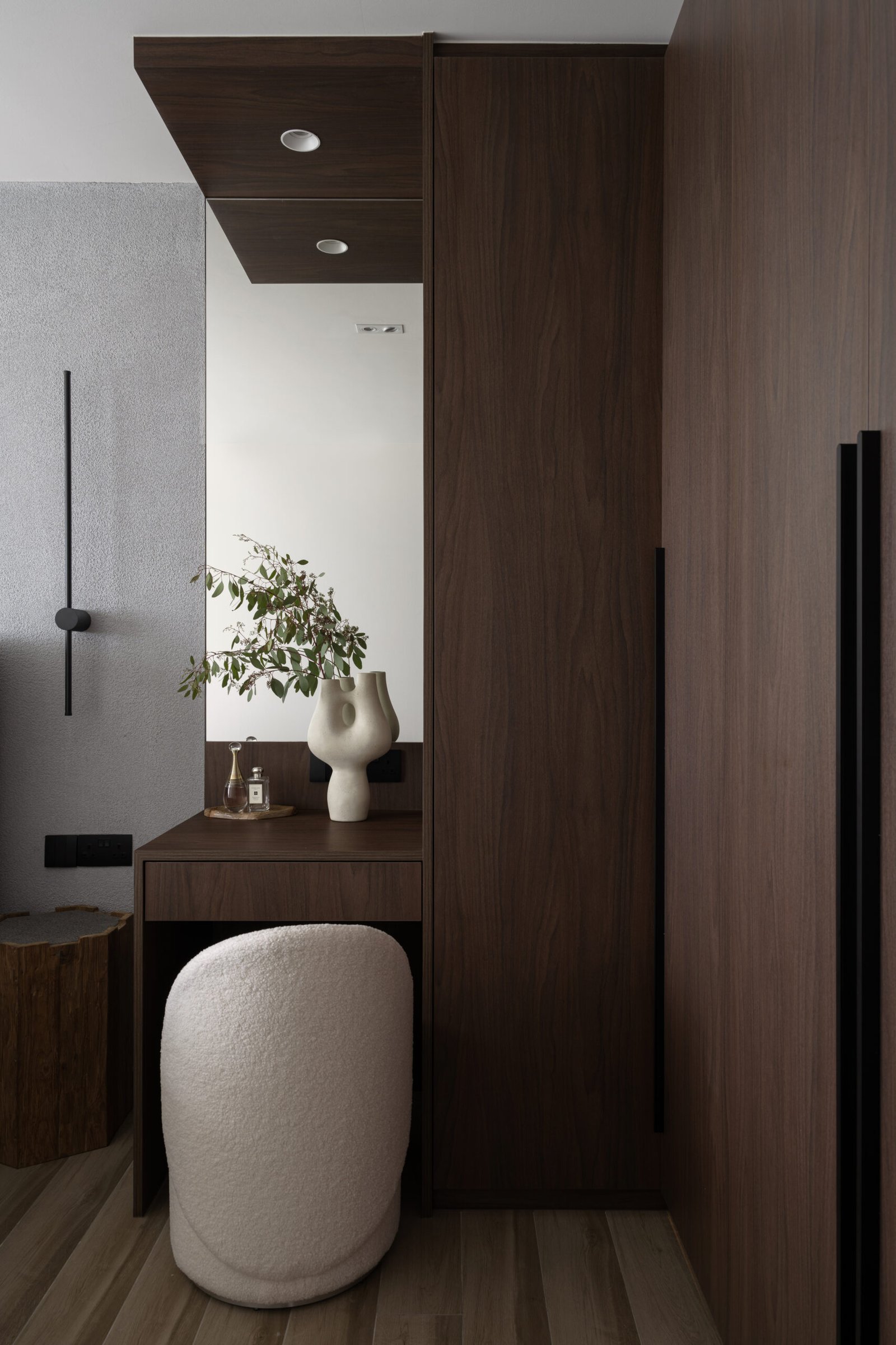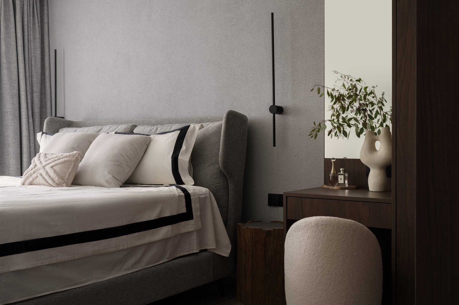 The master bedroom is a serene retreat, designed for both rest and personal rituals. Soft, darker wood tones create a cosy atmosphere, while a dedicated dresser area adds a touch of practicality and elegance. It’s a space where mornings begin with quiet preparation, and evenings are spent winding down.