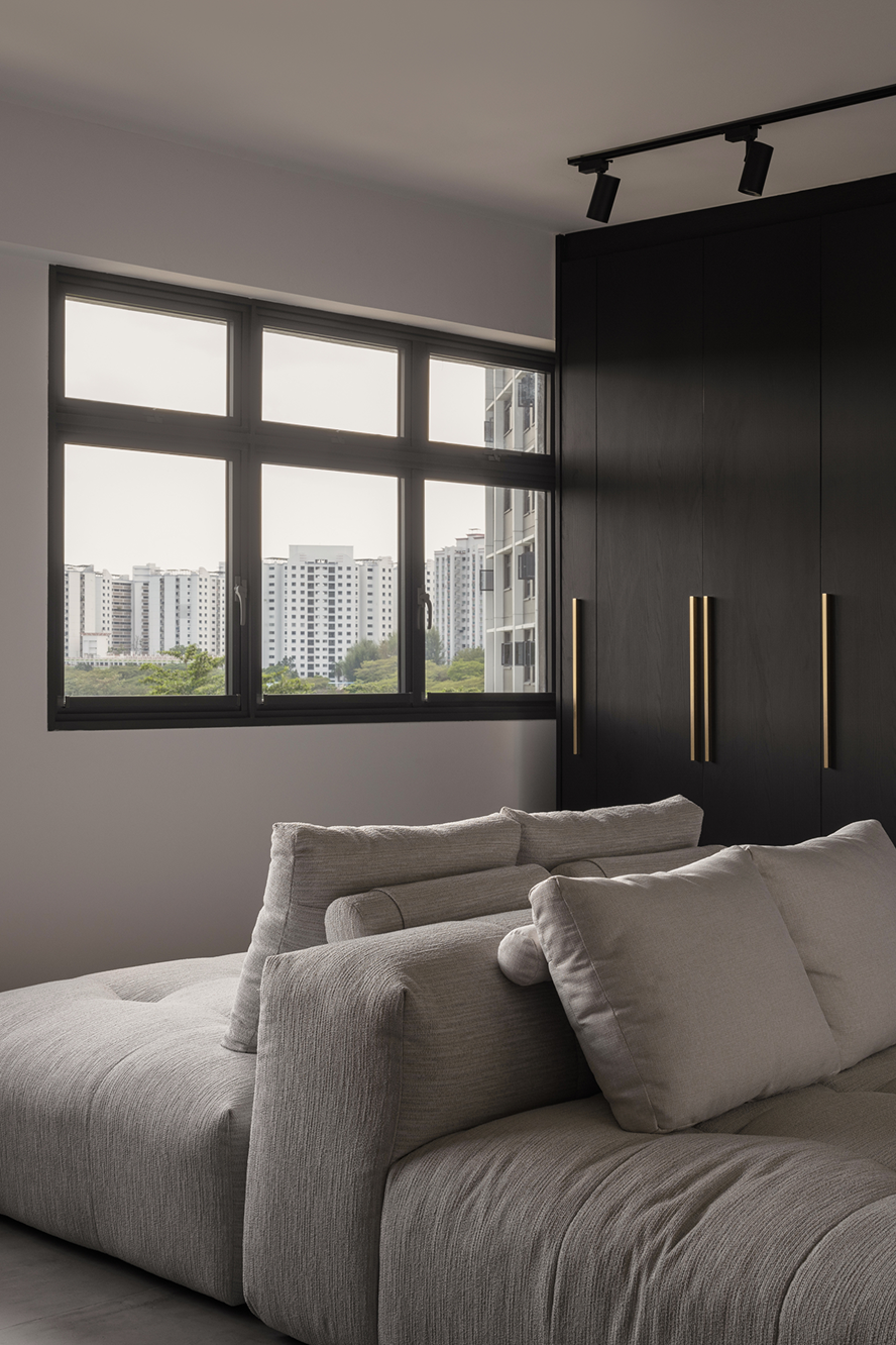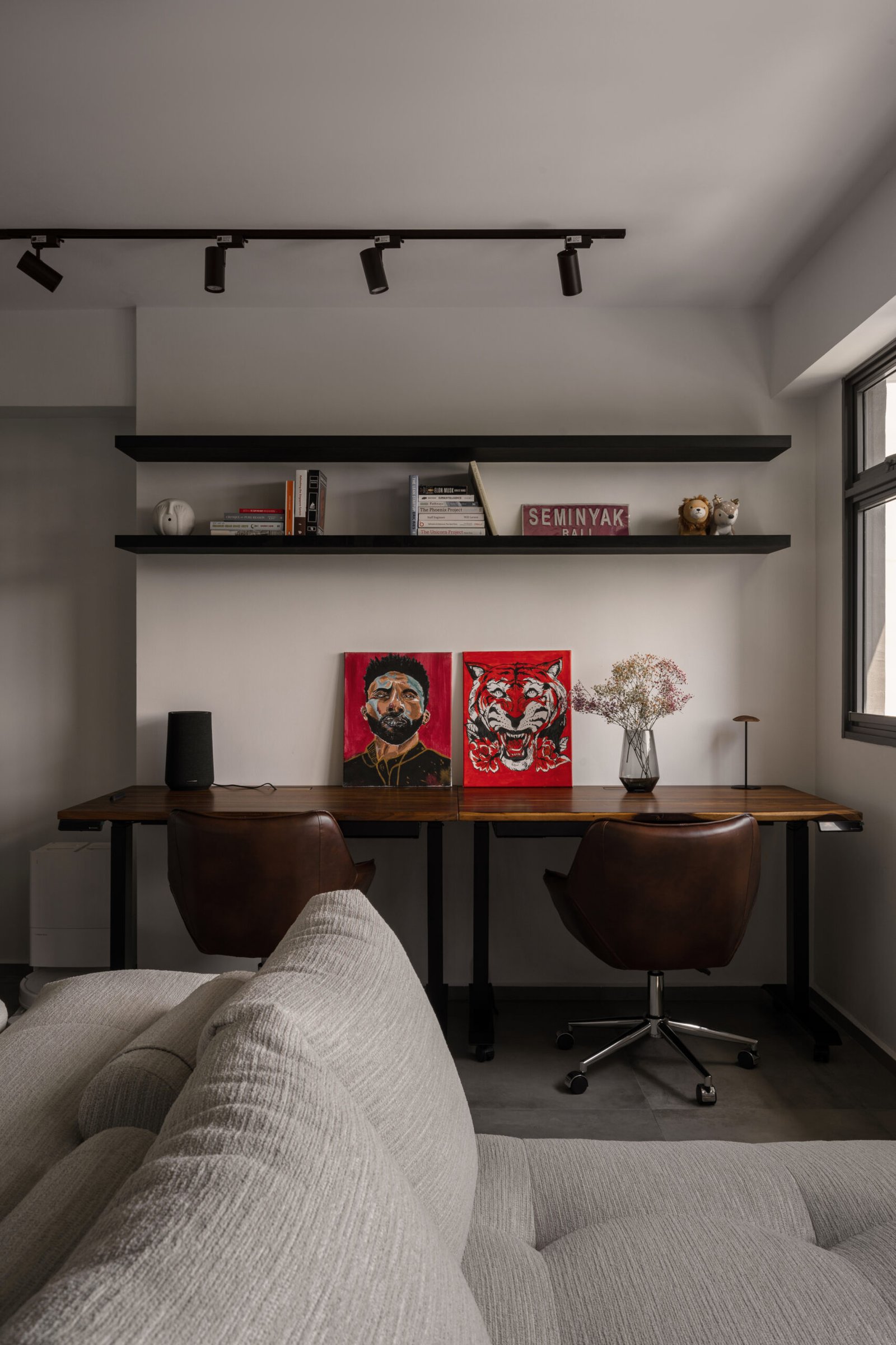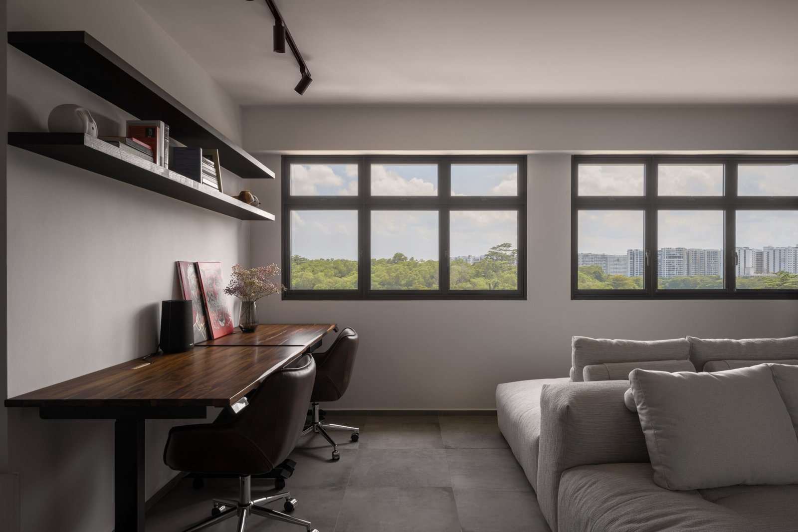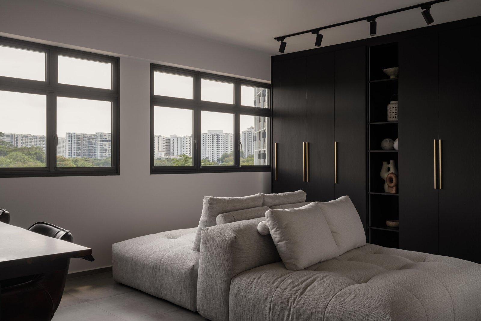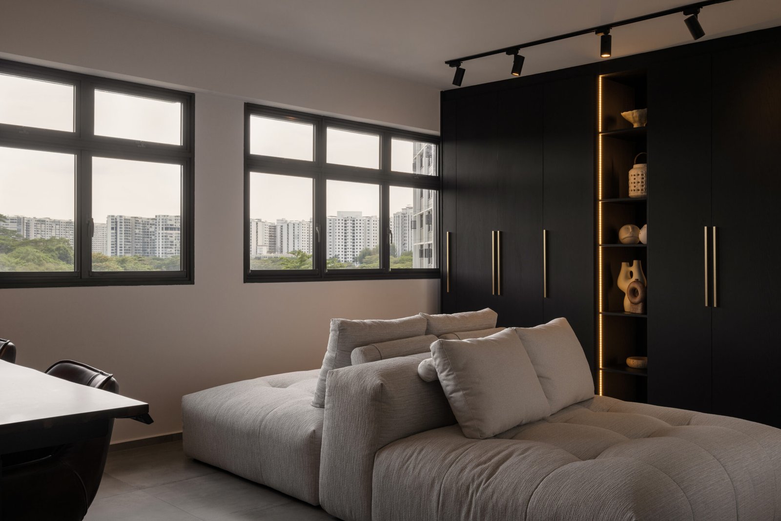 Two former bedrooms were merged to create a spacious common room that seamlessly blends work and relaxation. At its center, modular sofa beckons for lounging, reading, or catching up with friends, making it a natural hub for conversation. Full-height cabinets and open shelving line the room, keeping it clutter-free while providing space to display personal touches that reflect the homeowners’ style.