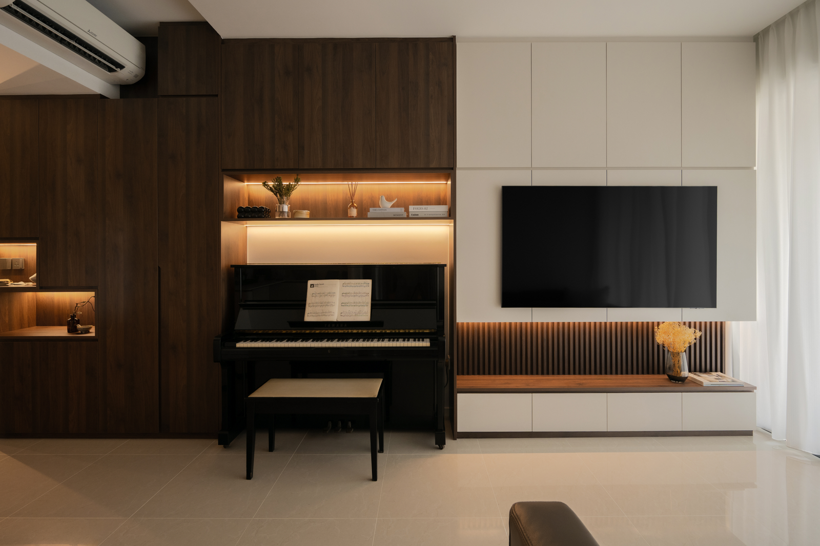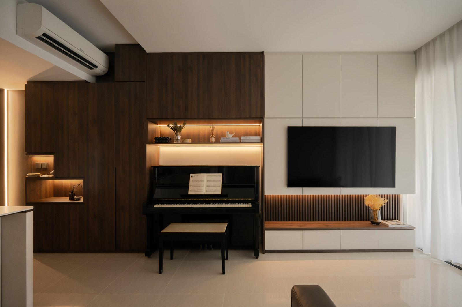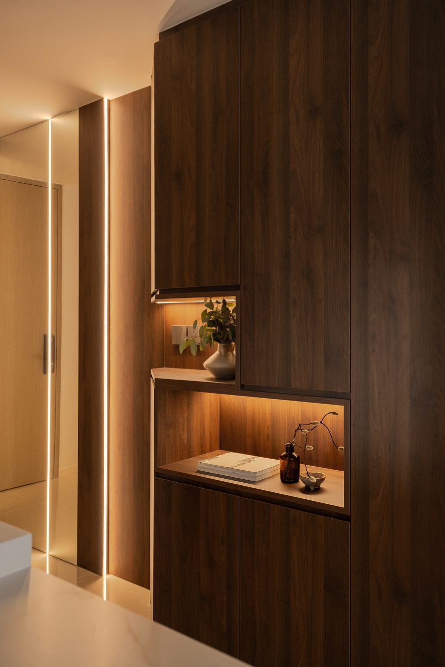 What could have been a cramped entrance walkway has been transformed into a welcoming passage with the usage of mirrors and ambient lighting, making the space feel brighter and more expansive.