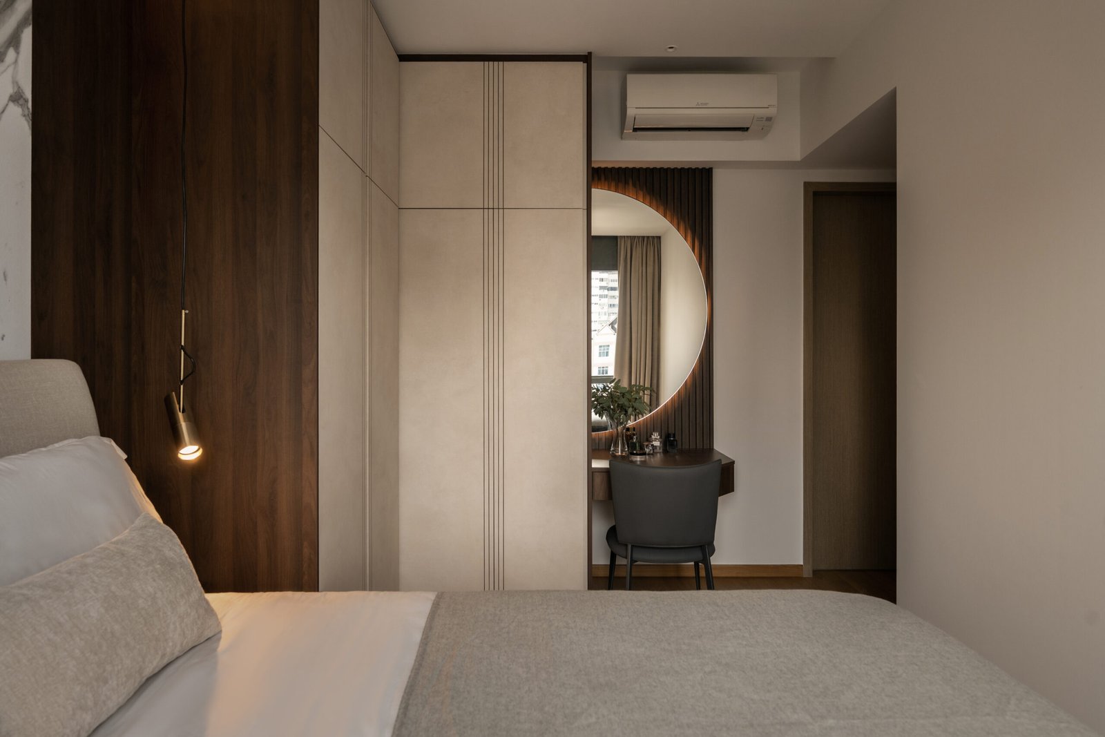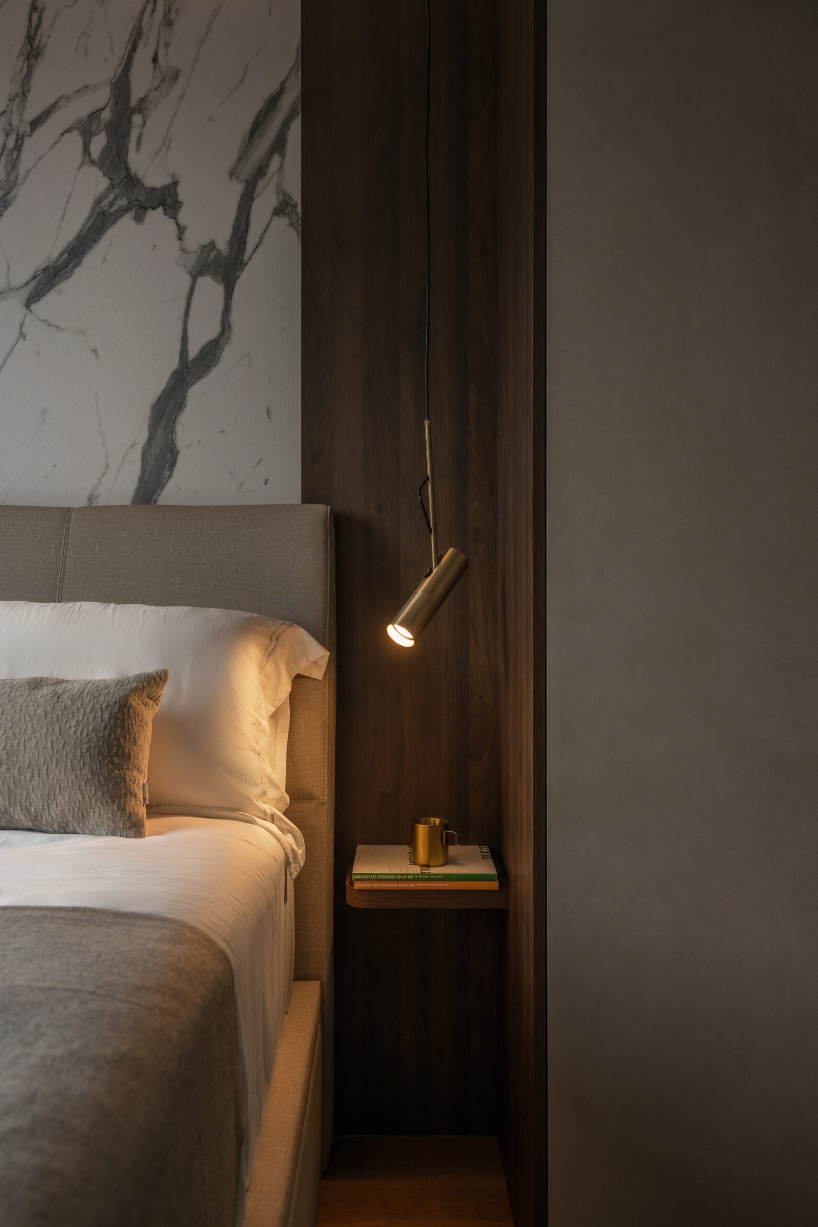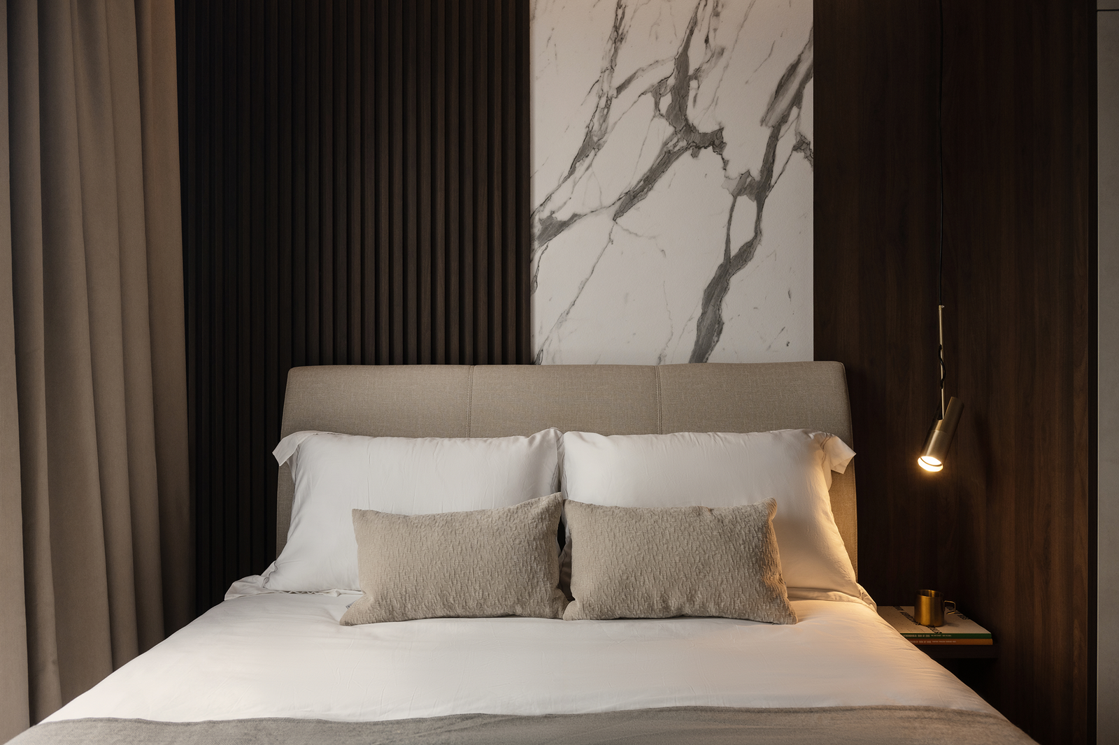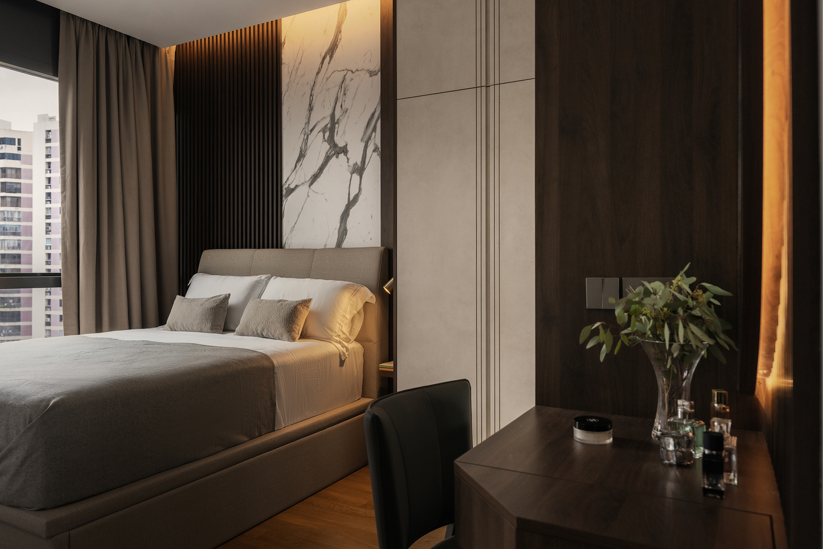 The bedroom continues the modern luxe narrative, with a feature wall of marble and fluted panels that evokes a hotel-inspired vibe, combining elegance with warmth.